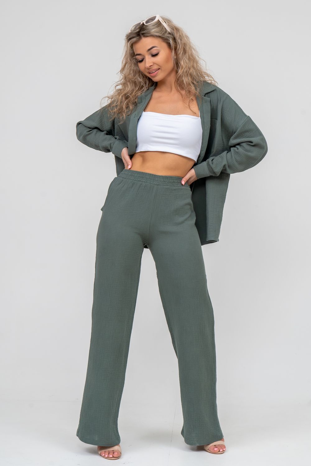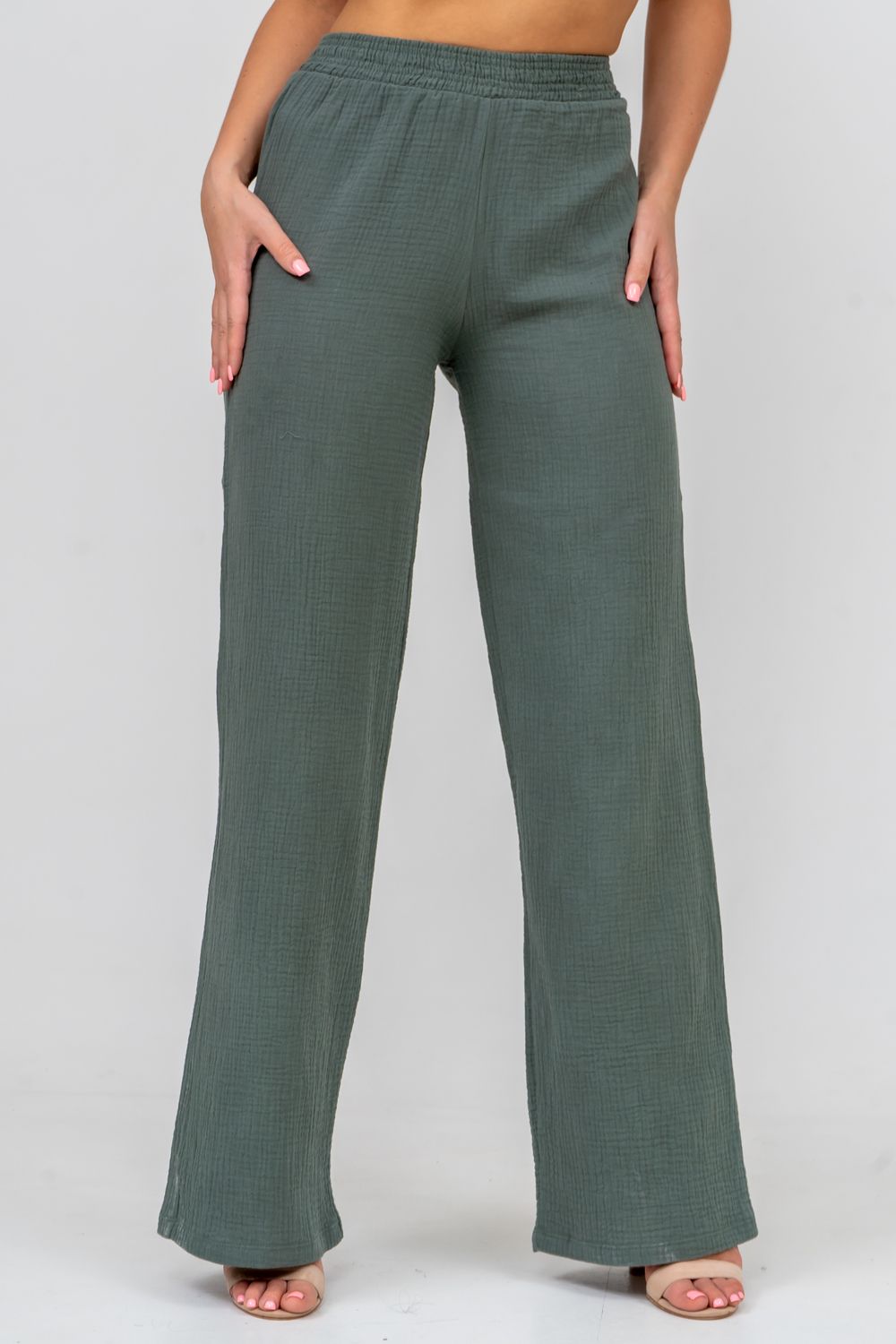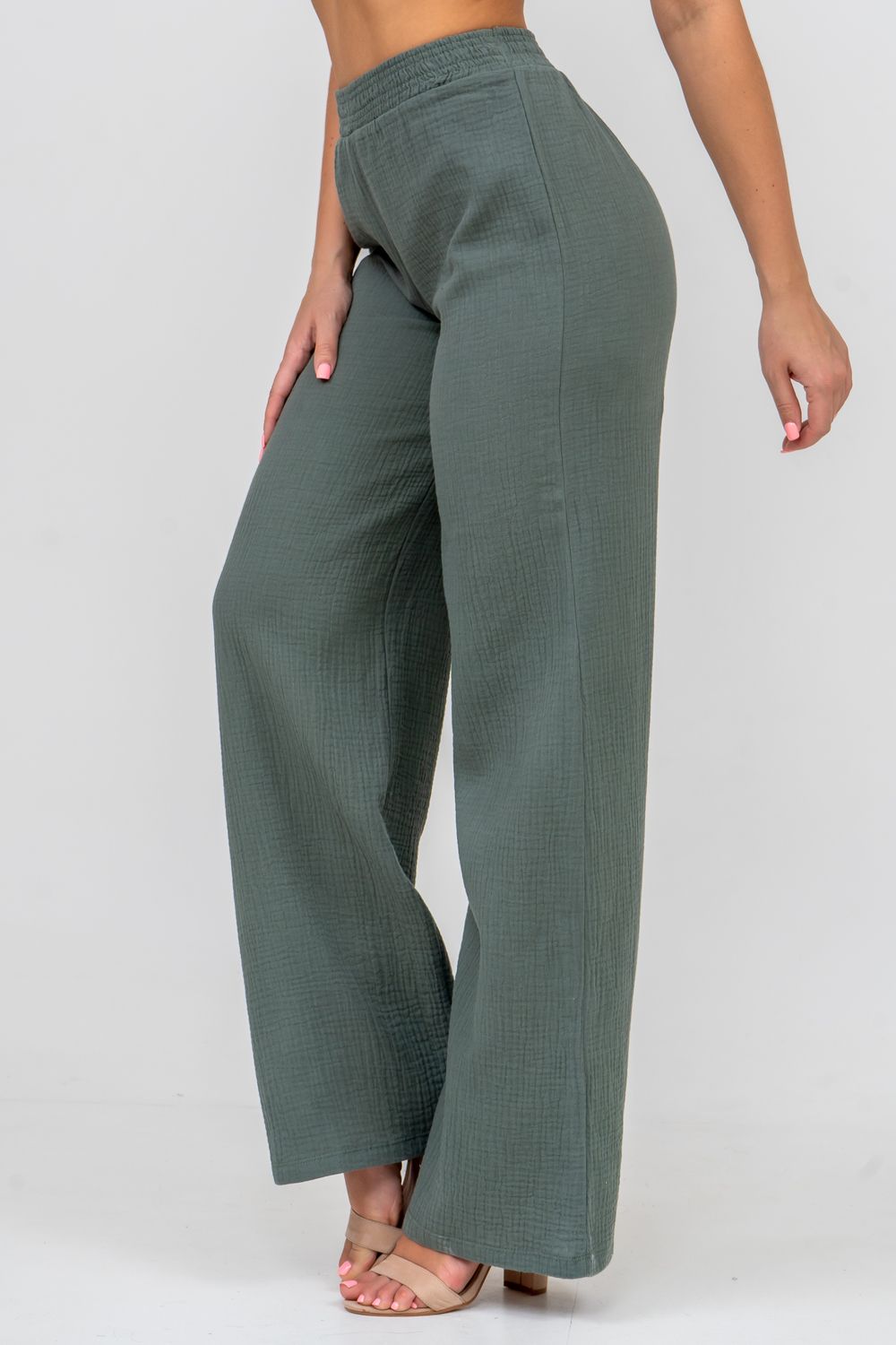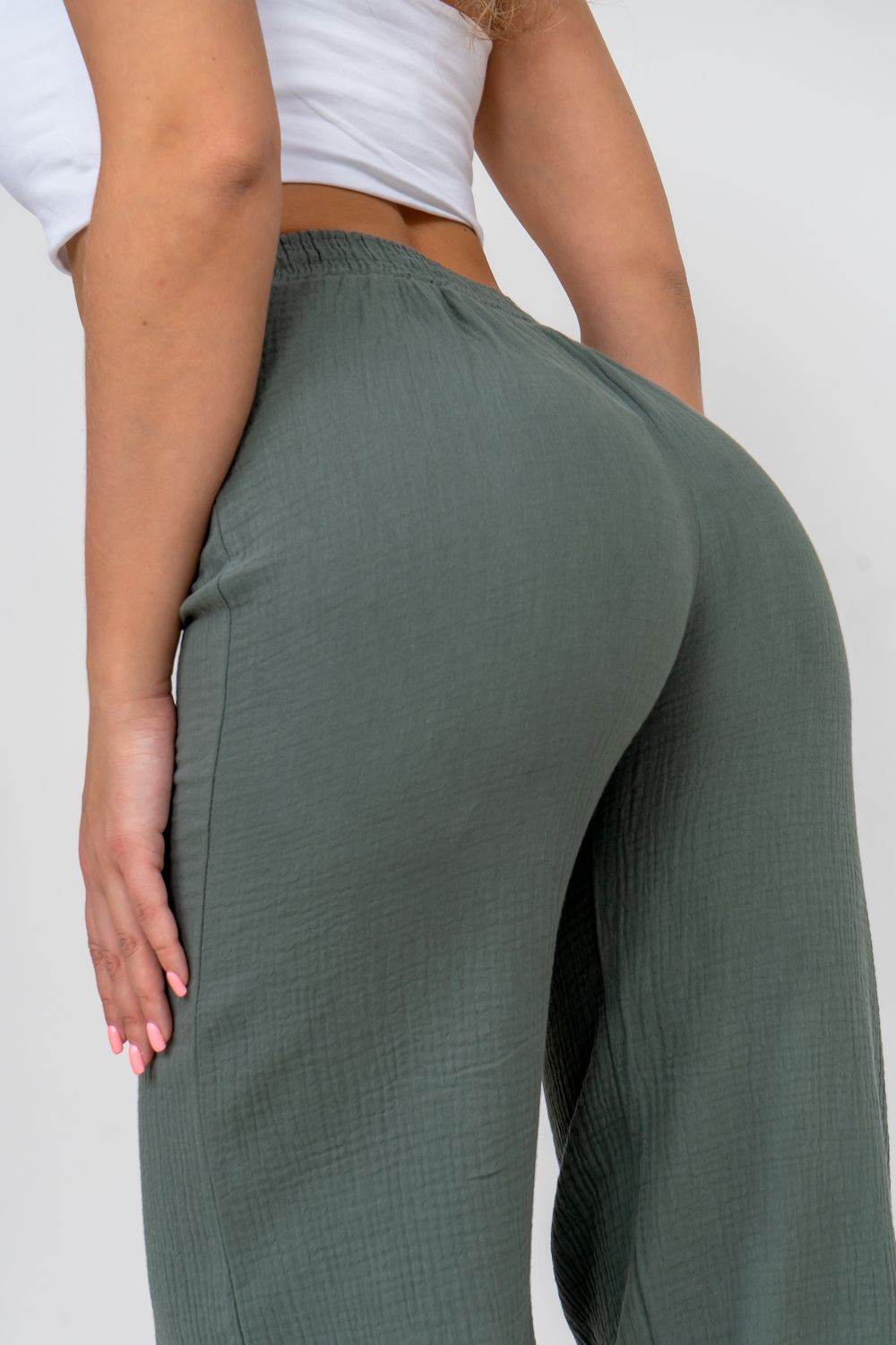 Модные женские брюки - палаццо с завышенной линией талии выполнены из лёгкого струящегося двухслойного муслина. Пояс брюк обработан на специализированной поясной машине. Кажется в новом сезоне с фантастическим муслином познакомился каждый! Воздушный, невесомый, с присущей ему особенной жатой фактурой - это очевидный мастхев летних коллекций, который с успехом переходит в другие сезоны в виде предметов домашнего гардероба. Такая находка и раньше была известна всем, но в этом сезоне тренд с муслином захватил буквально всех. Изделие из такого материала имеет огромное количество плюсов: это 100% хлопок без добавок, брюки из такого материала безупречны для жары, натуральная дышащая структура, лёгкие, практически не ощущаются на теле, и быстро сохнут при намокании. Именно поэтому необычная и фактурная ткань цепляет взгляды окружающих и прекрасно подходит для прогулок, в отпуск, на праздник или для пляжного отдыха. Стирать муслиновые вещи нужно только в тёплой воде при температуре не выше 40° С. Брюки такого плана - это отличный подарок самой себе, и твоё лучшее решение!