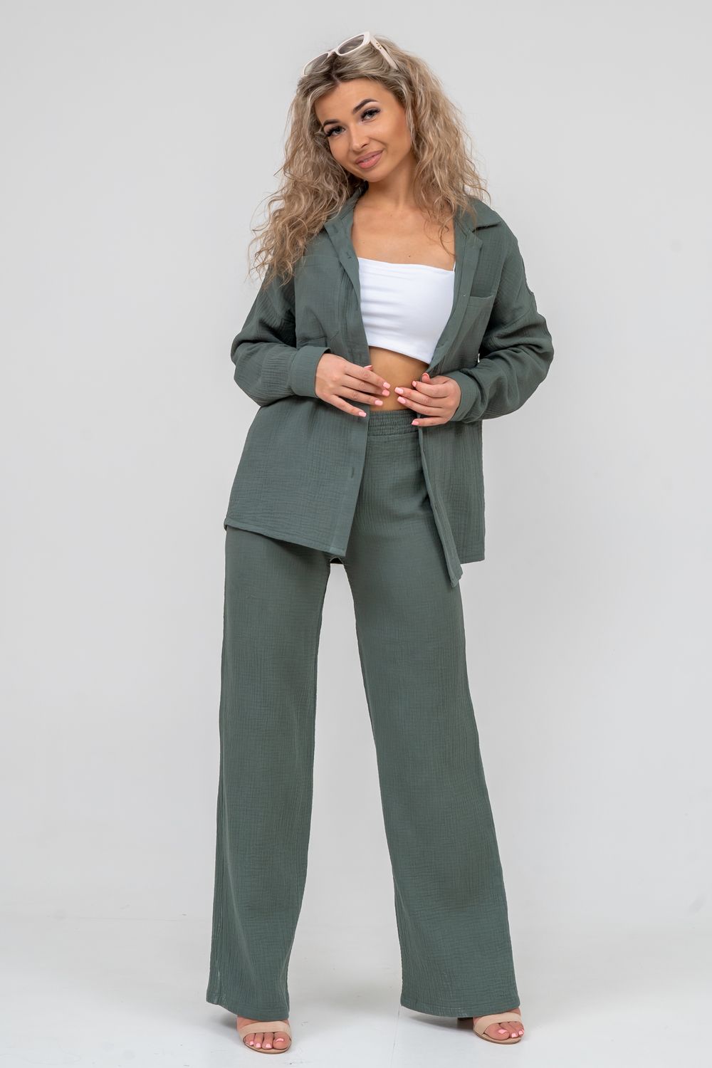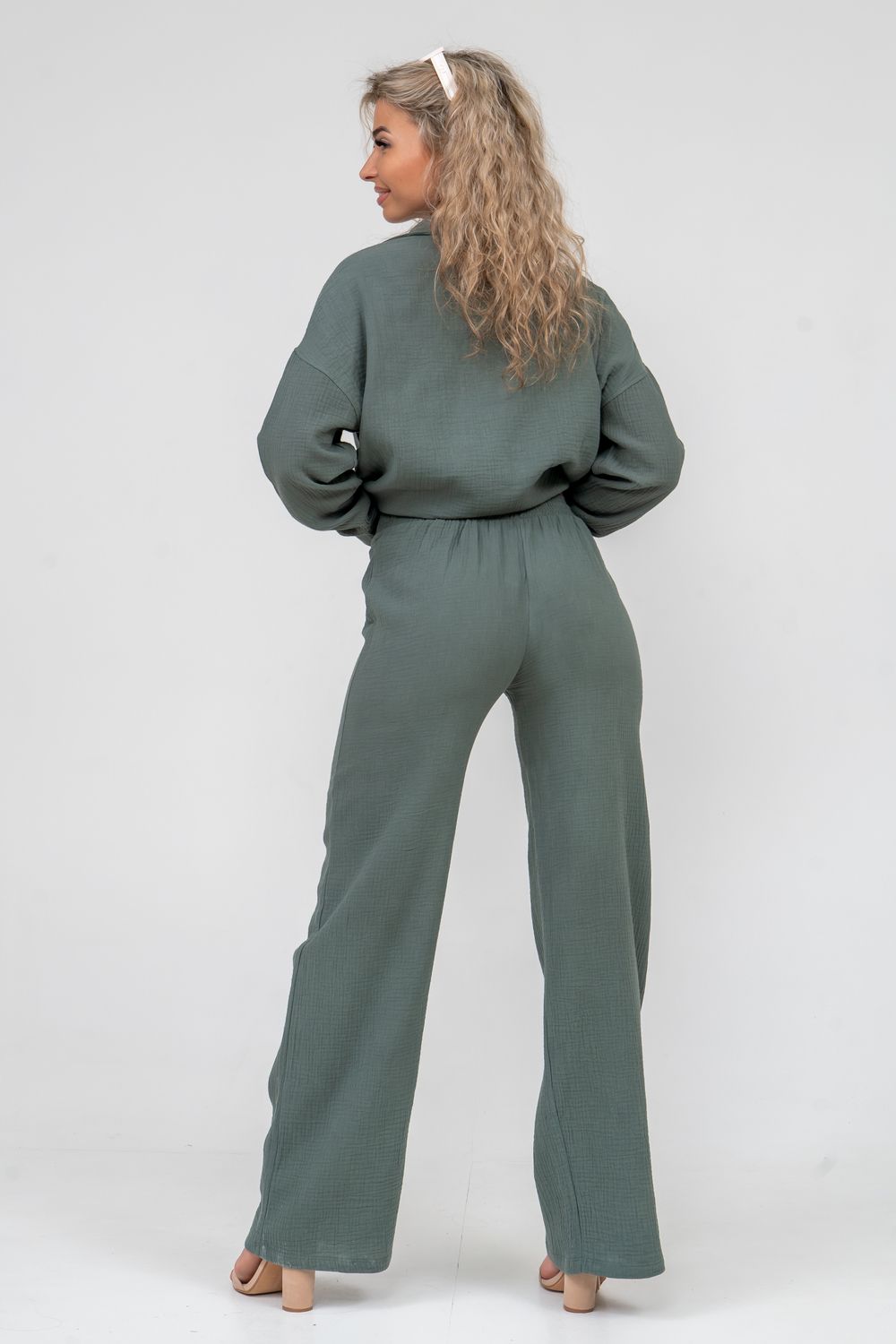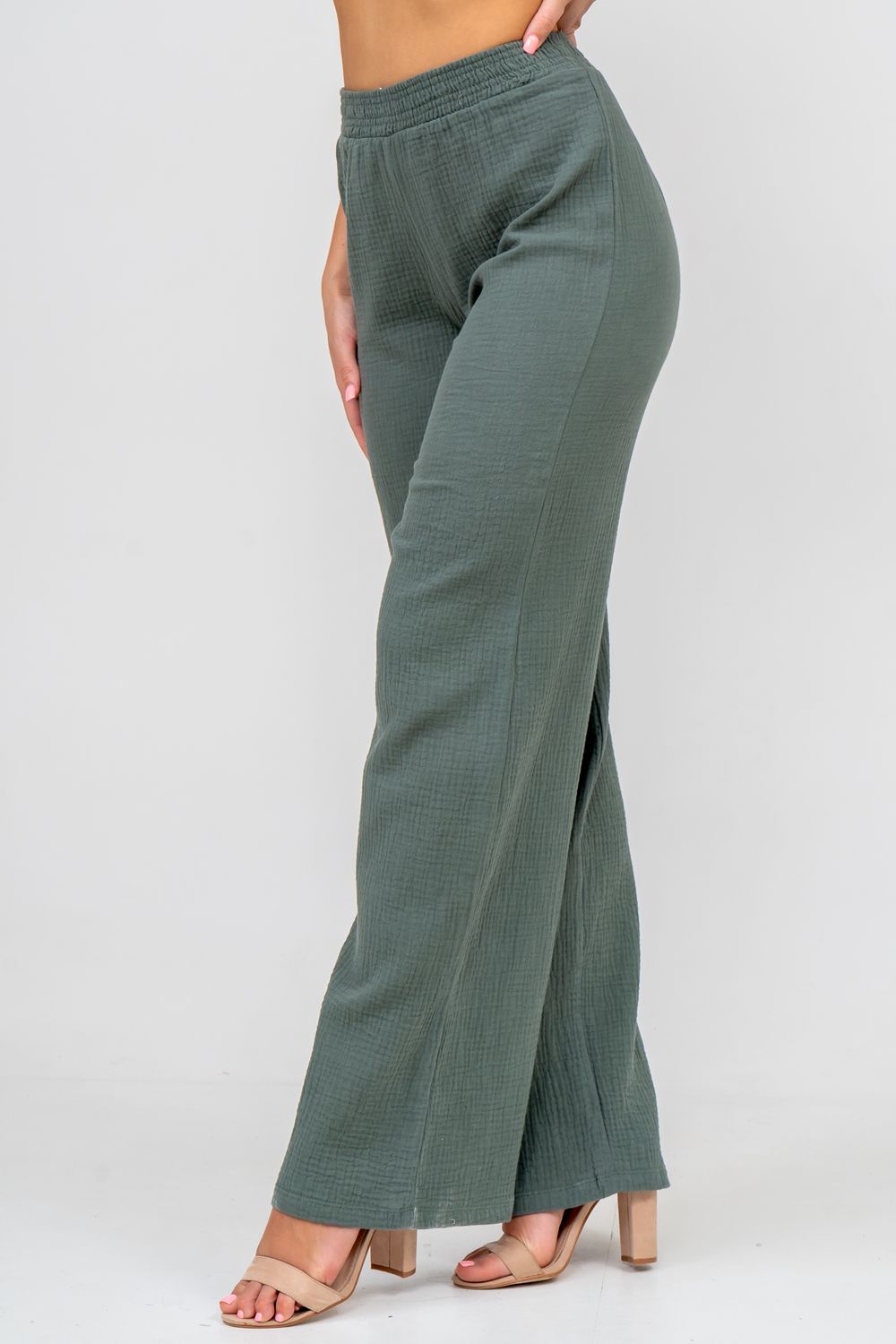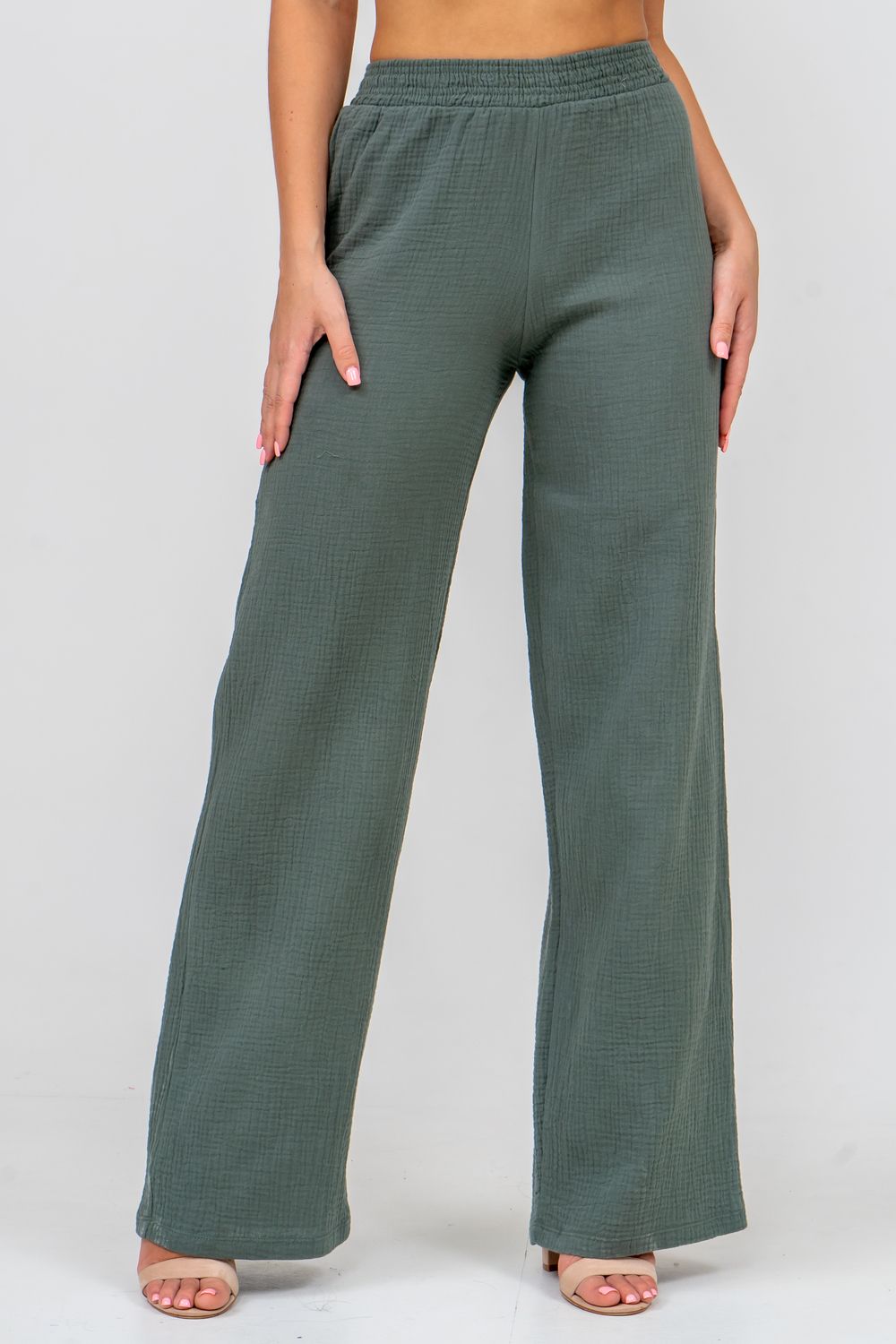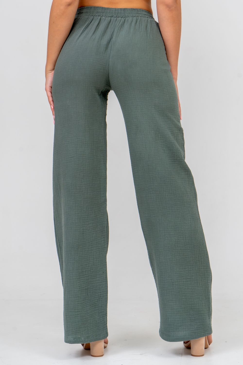 Модные женские брюки - палаццо с завышенной линией талии выполнены из лёгкого струящегося двухслойного муслина. Пояс брюк обработан на специализированной поясной машине. Кажется в новом сезоне с фантастическим муслином познакомился каждый! Воздушный, невесомый, с присущей ему особенной жатой фактурой - это очевидный мастхев летних коллекций, который с успехом переходит в другие сезоны в виде предметов домашнего гардероба. Такая находка и раньше была известна всем, но в этом сезоне тренд с муслином захватил буквально всех. Изделие из такого материала имеет огромное количество плюсов: это 100% хлопок без добавок, брюки из такого материала безупречны для жары, натуральная дышащая структура, лёгкие, практически не ощущаются на теле, и быстро сохнут при намокании. Именно поэтому необычная и фактурная ткань цепляет взгляды окружающих и прекрасно подходит для прогулок, в отпуск, на праздник или для пляжного отдыха. Стирать муслиновые вещи нужно только в тёплой воде при температуре не выше 40° С. Брюки такого плана - это отличный подарок самой себе, и твоё лучшее решение!