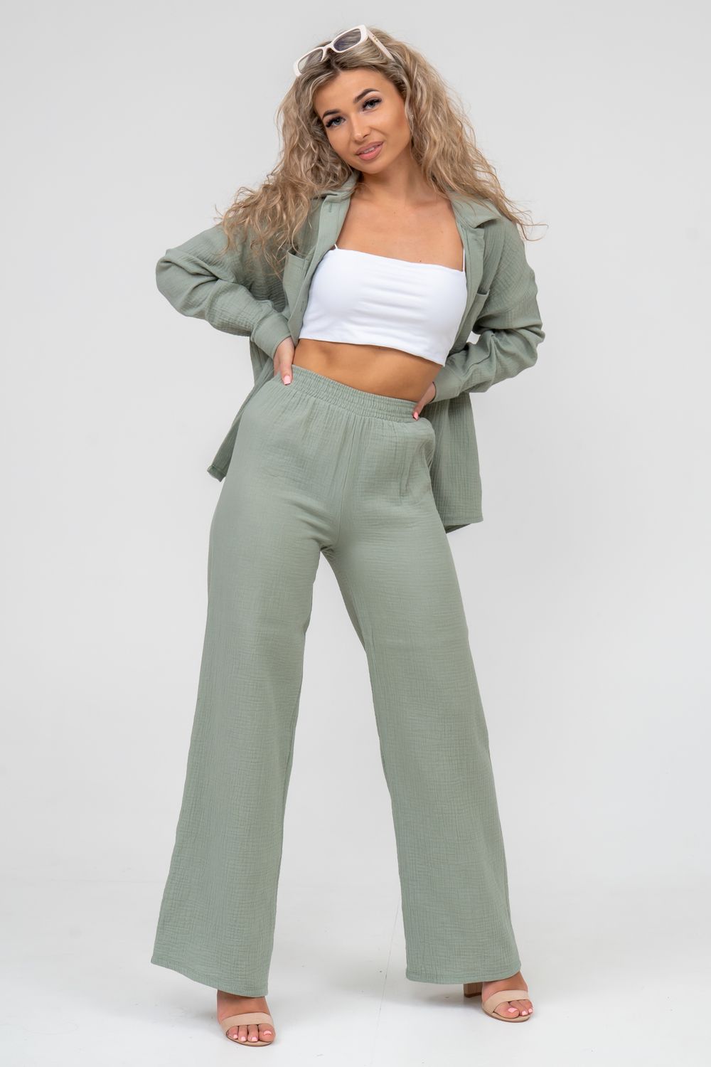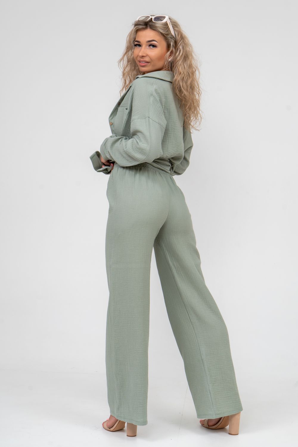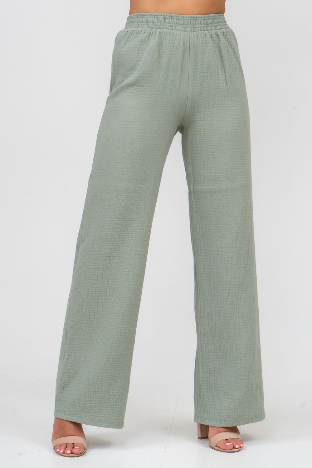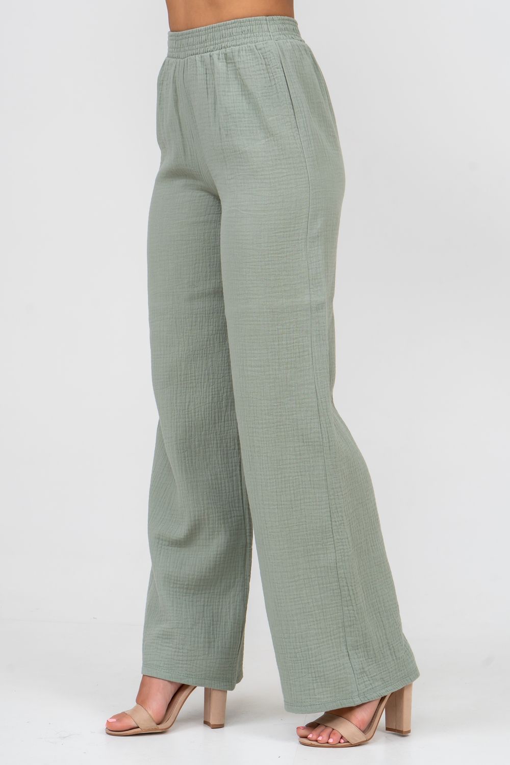 Модные женские брюки - палаццо с завышенной линией талии выполнены из лёгкого струящегося двухслойного муслина. Пояс брюк обработан на специализированной поясной машине. Кажется в новом сезоне с фантастическим муслином познакомился каждый! Воздушный, невесомый, с присущей ему особенной жатой фактурой - это очевидный мастхев летних коллекций, который с успехом переходит в другие сезоны в виде предметов домашнего гардероба. Такая находка и раньше была известна всем, но в этом сезоне тренд с муслином захватил буквально всех. Изделие из такого материала имеет огромное количество плюсов: это 100% хлопок без добавок, брюки из такого материала безупречны для жары, натуральная дышащая структура, лёгкие, практически не ощущаются на теле, и быстро сохнут при намокании. Именно поэтому необычная и фактурная ткань цепляет взгляды окружающих и прекрасно подходит для прогулок, в отпуск, на праздник или для пляжного отдыха. Стирать муслиновые вещи нужно только в тёплой воде при температуре не выше 40° С. Брюки такого плана - это отличный подарок самой себе, и твоё лучшее решение!