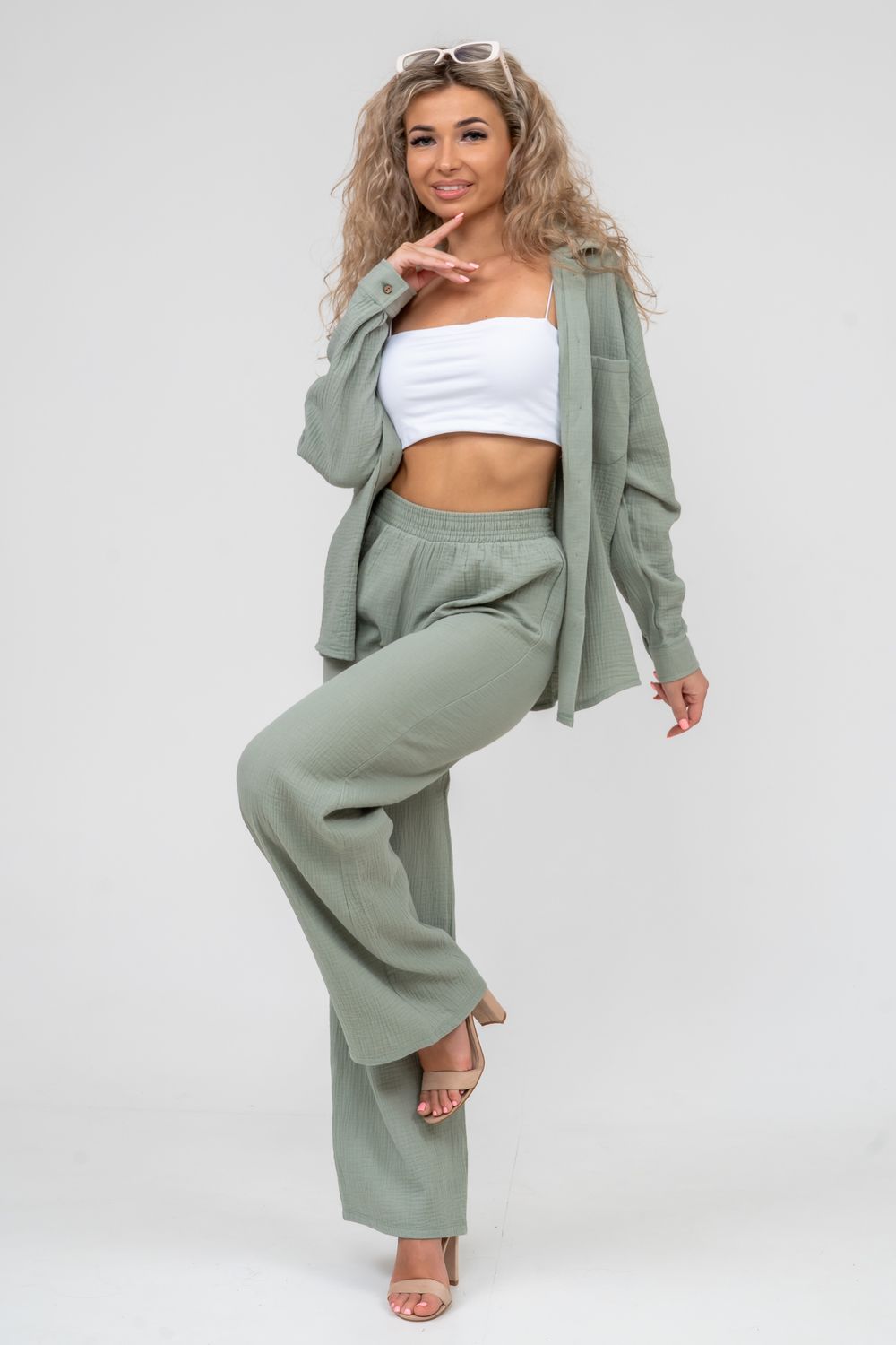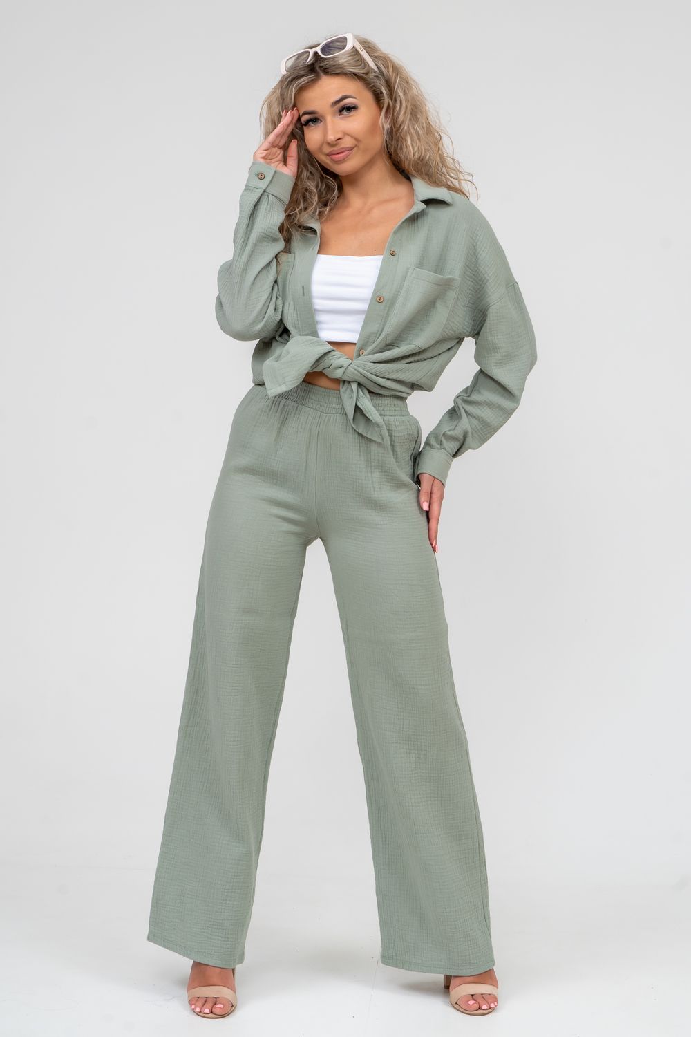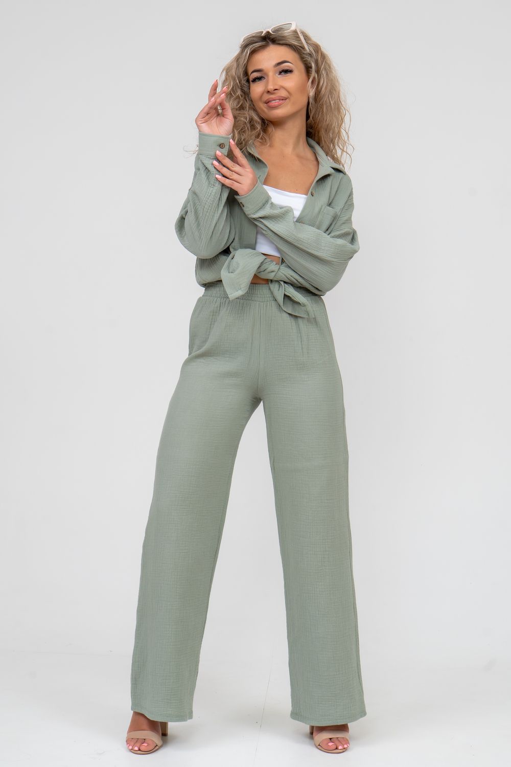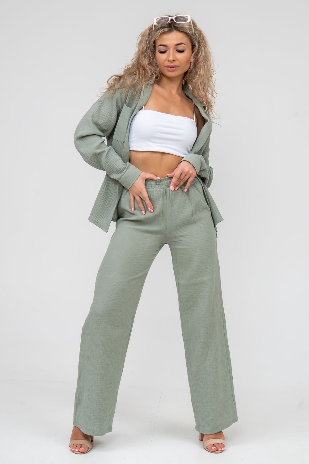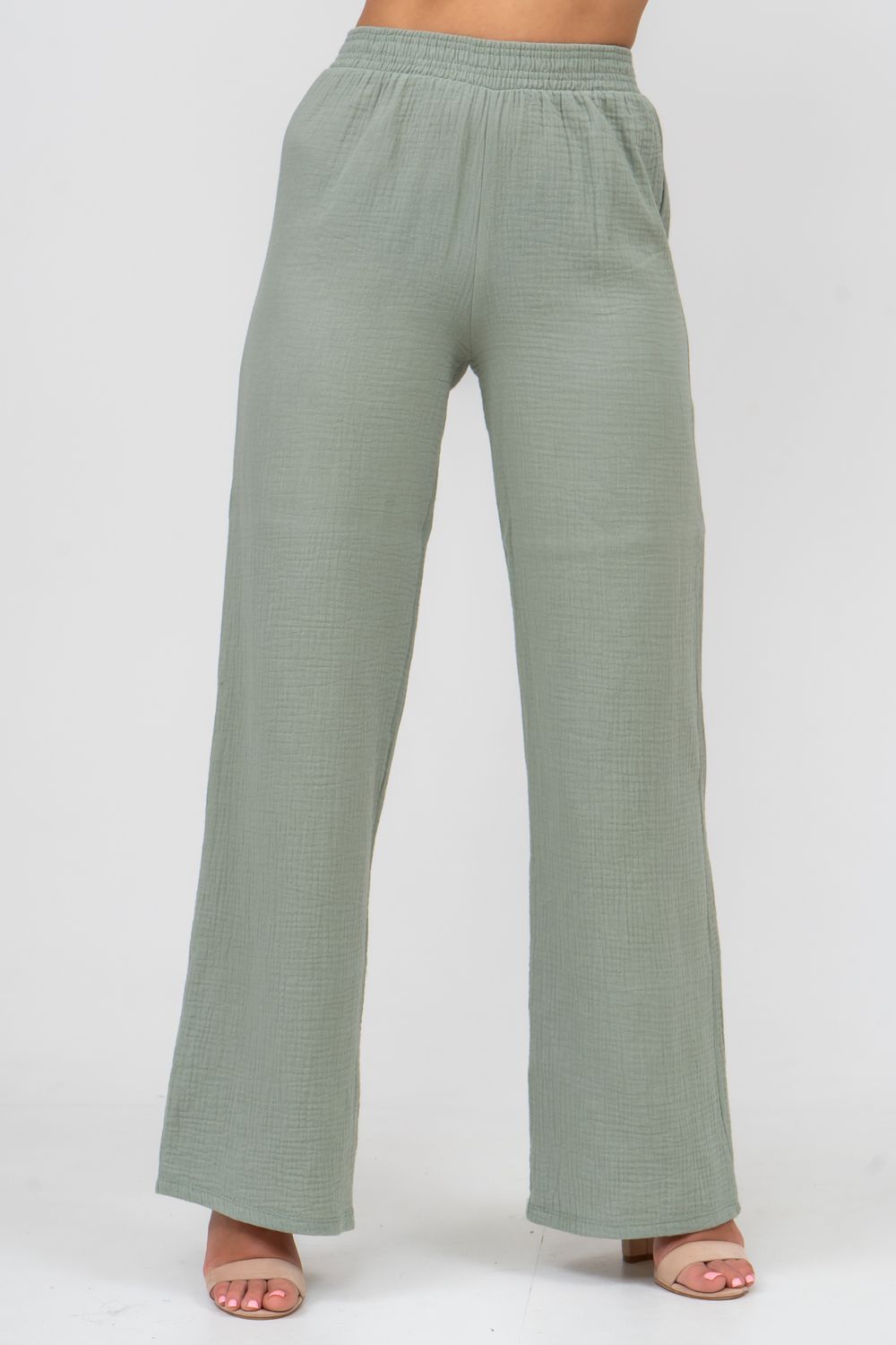 Модные женские брюки - палаццо с завышенной линией талии выполнены из лёгкого струящегося двухслойного муслина. Пояс брюк обработан на специализированной поясной машине. Кажется в новом сезоне с фантастическим муслином познакомился каждый! Воздушный, невесомый, с присущей ему особенной жатой фактурой - это очевидный мастхев летних коллекций, который с успехом переходит в другие сезоны в виде предметов домашнего гардероба. Такая находка и раньше была известна всем, но в этом сезоне тренд с муслином захватил буквально всех. Изделие из такого материала имеет огромное количество плюсов: это 100% хлопок без добавок, брюки из такого материала безупречны для жары, натуральная дышащая структура, лёгкие, практически не ощущаются на теле, и быстро сохнут при намокании. Именно поэтому необычная и фактурная ткань цепляет взгляды окружающих и прекрасно подходит для прогулок, в отпуск, на праздник или для пляжного отдыха. Стирать муслиновые вещи нужно только в тёплой воде при температуре не выше 40° С. Брюки такого плана - это отличный подарок самой себе, и твоё лучшее решение!