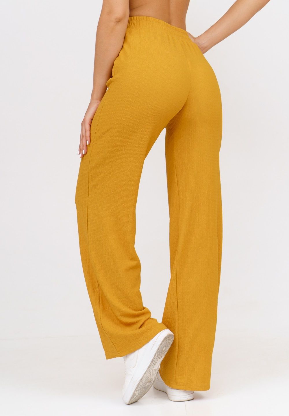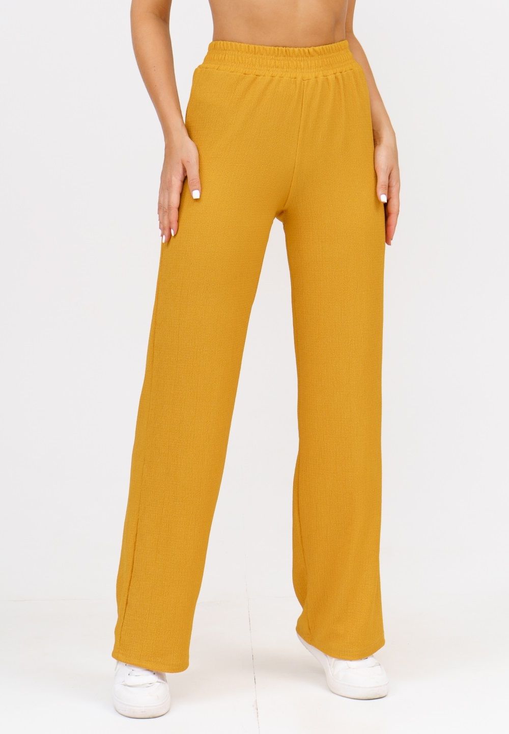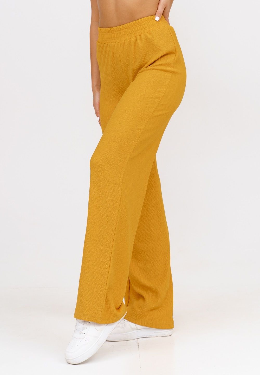Модные женские брюки - палаццо с завышенной линией талии выполнены из лёгкого струящегося материала - жатка. Пояс брюк обработан на специализированной поясной машине. Кажется в новом сезоне с фантастической жаткой познакомился каждый! Жатая фактура - это очевидный мастхев летних коллекций, который с успехом переходит в другие сезоны в виде предметов домашнего гардероба. Такая находка и раньше была известна всем, но в этом сезоне тренд с жаткой захватил буквально всех. Изделие из такого материала имеет огромное количество плюсов: брюки из такого материала безупречны для жары, лёгкие, практически не ощущаются на теле, и быстро сохнут при намокании. Именно поэтому необычная и фактурная ткань цепляет взгляды окружающих и прекрасно подходит для прогулок, в отпуск, на праздник или для пляжного отдыха. Брюки такого плана - это отличный подарок самой себе, и твоё лучшее решение!