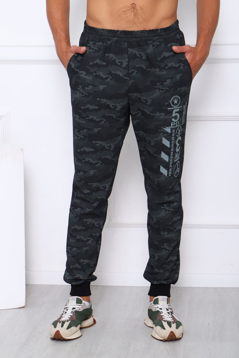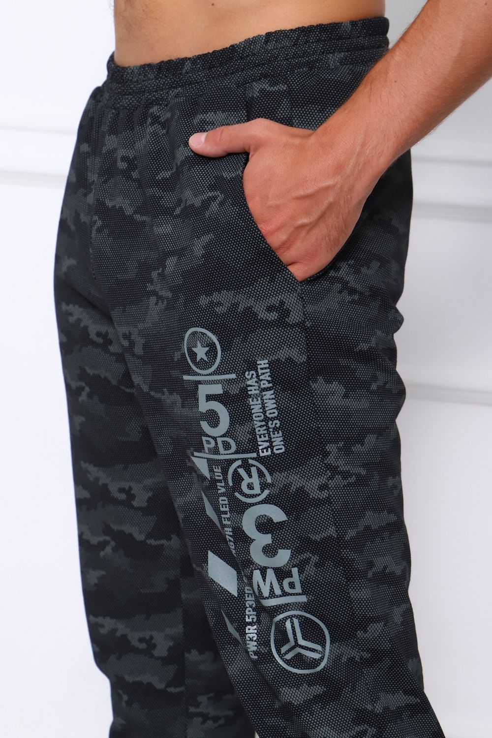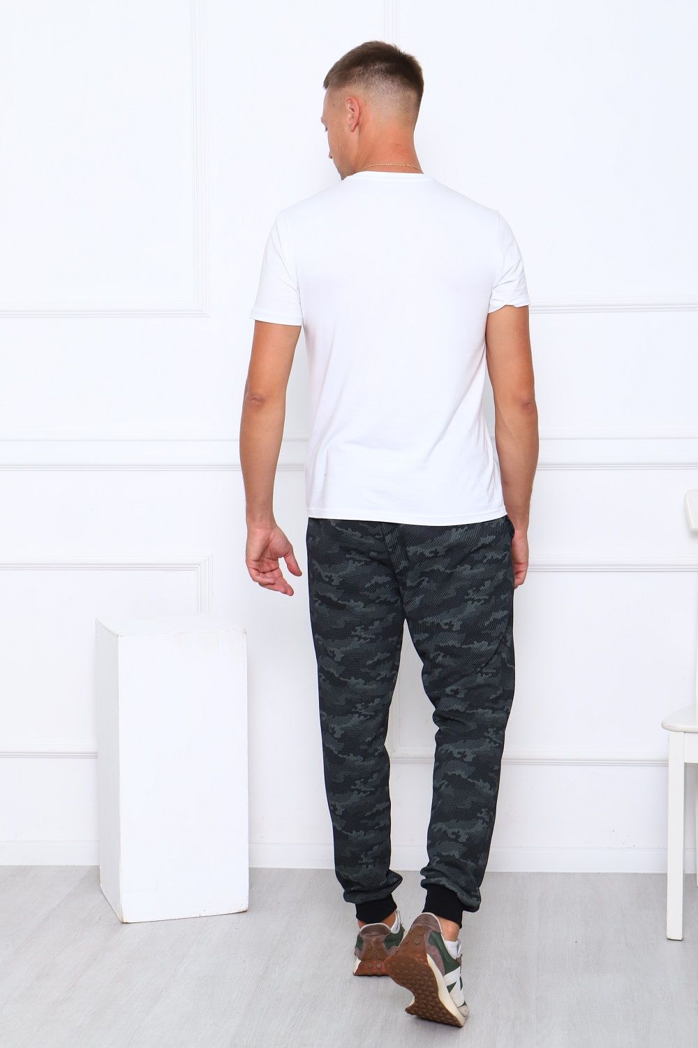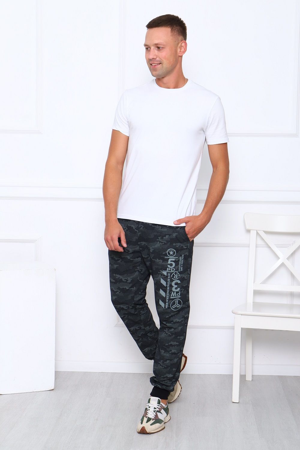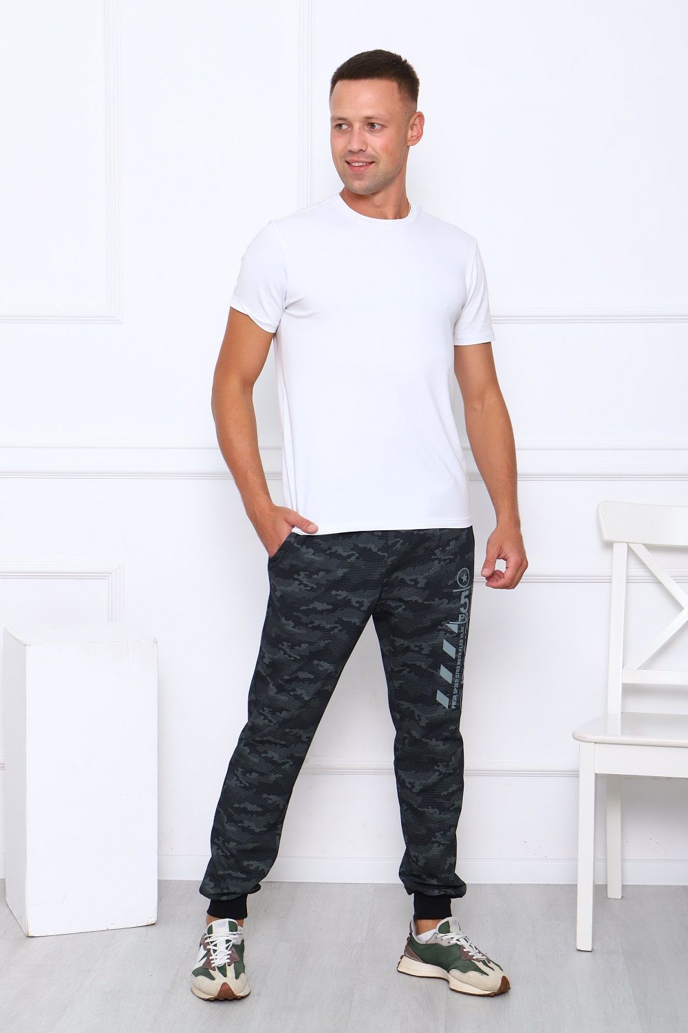 Брюки мужские "Камуфляж" с боковыми карманами и с тематическим принтом на левой штанине, низ на манжетах, комфортный широкий эластичный пояс. Материал устойчив к растягиванию на коленях, износостойкий.