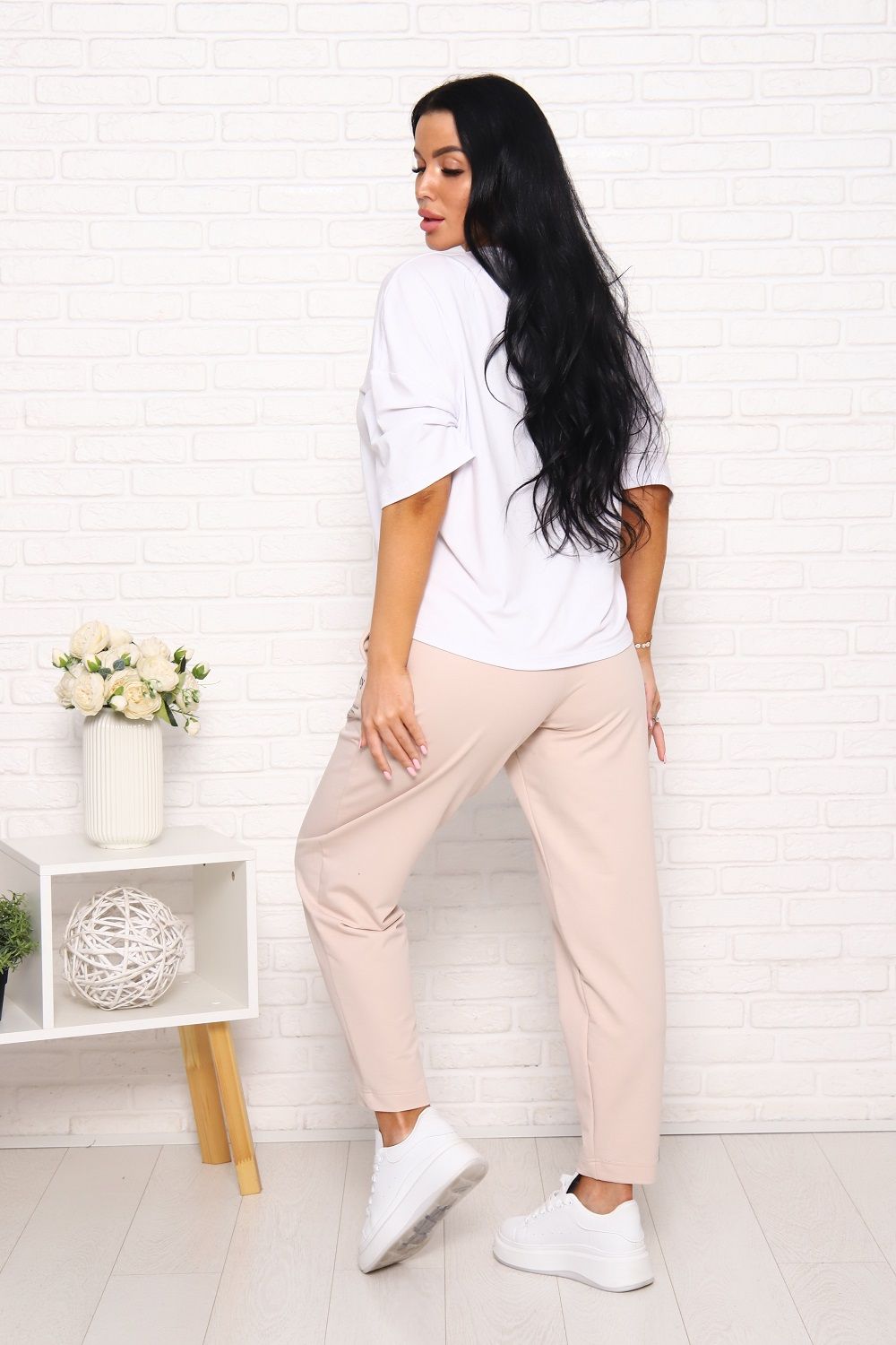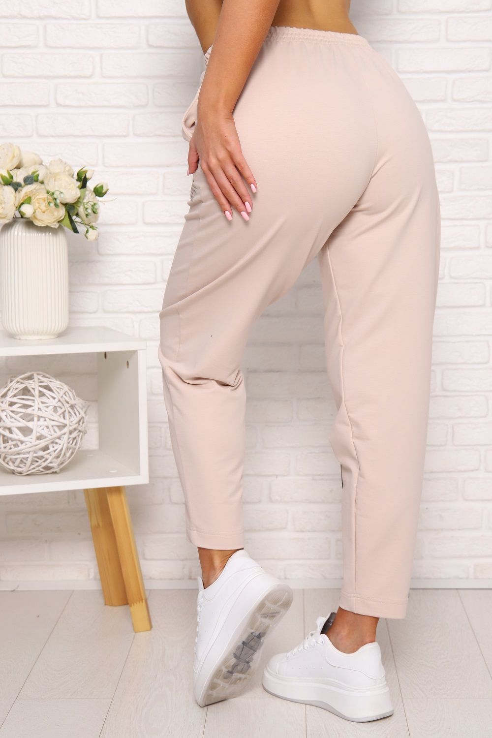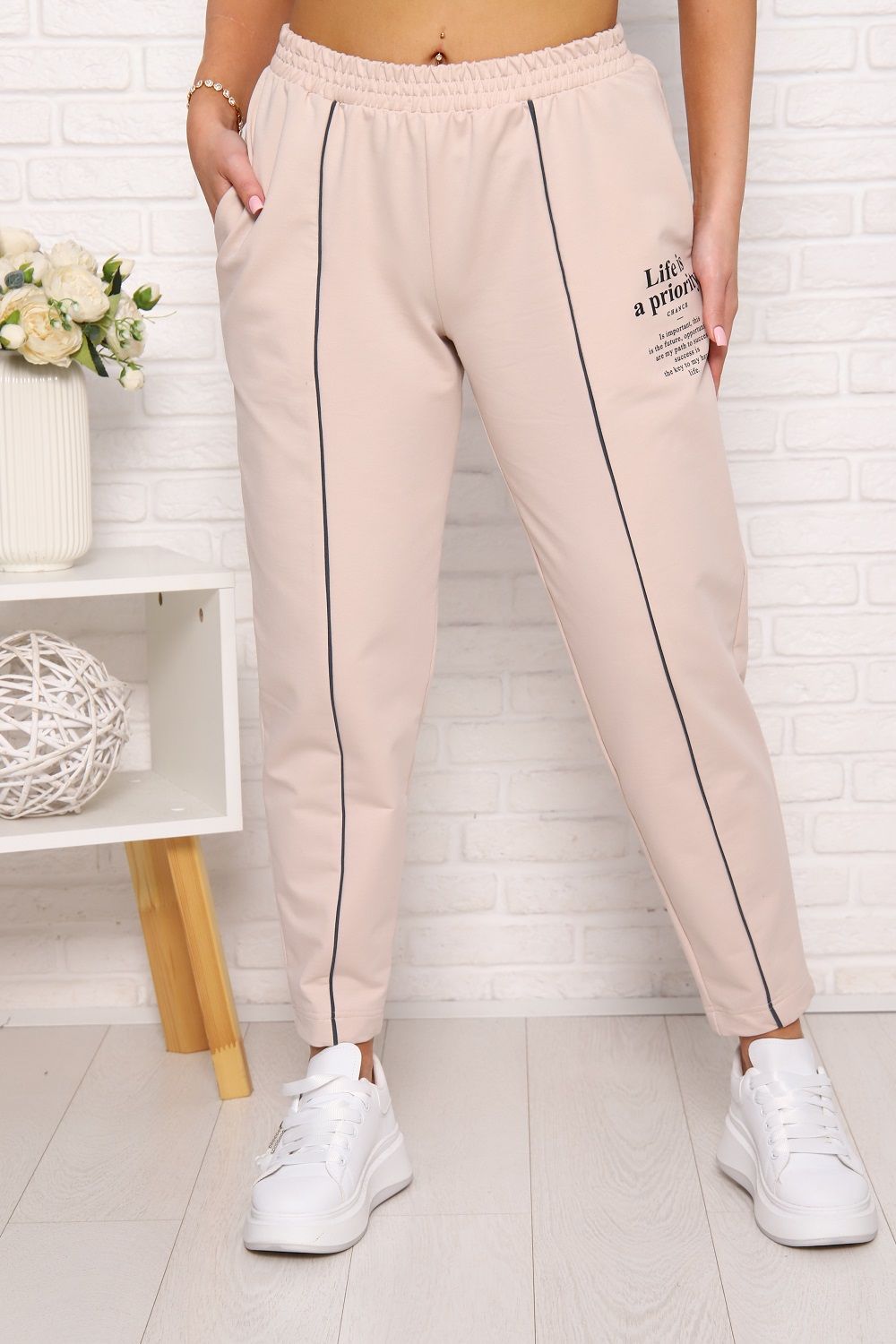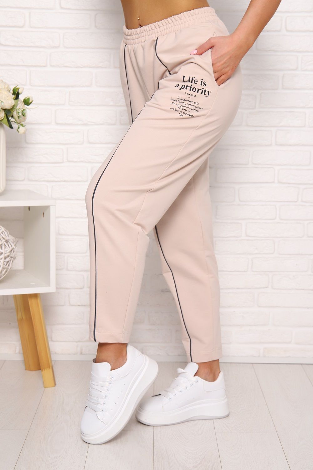 Брюки женские стильные, с боковыми карманами, с кантом в шве брюк и принтом спереди около кармана, эластичный комфортный пояс.