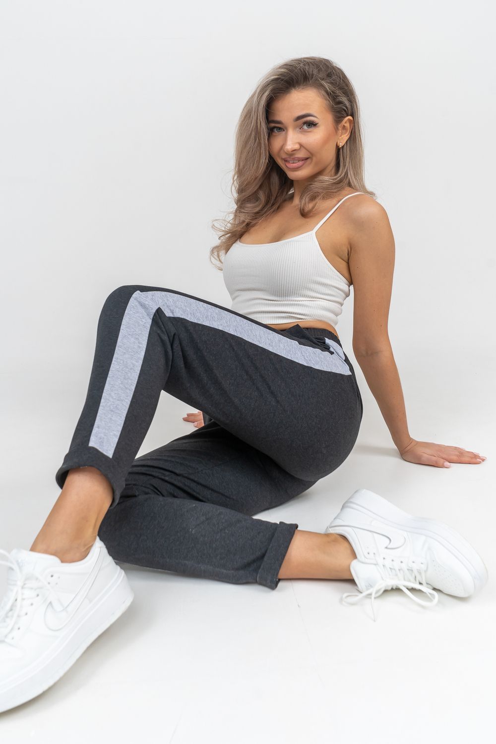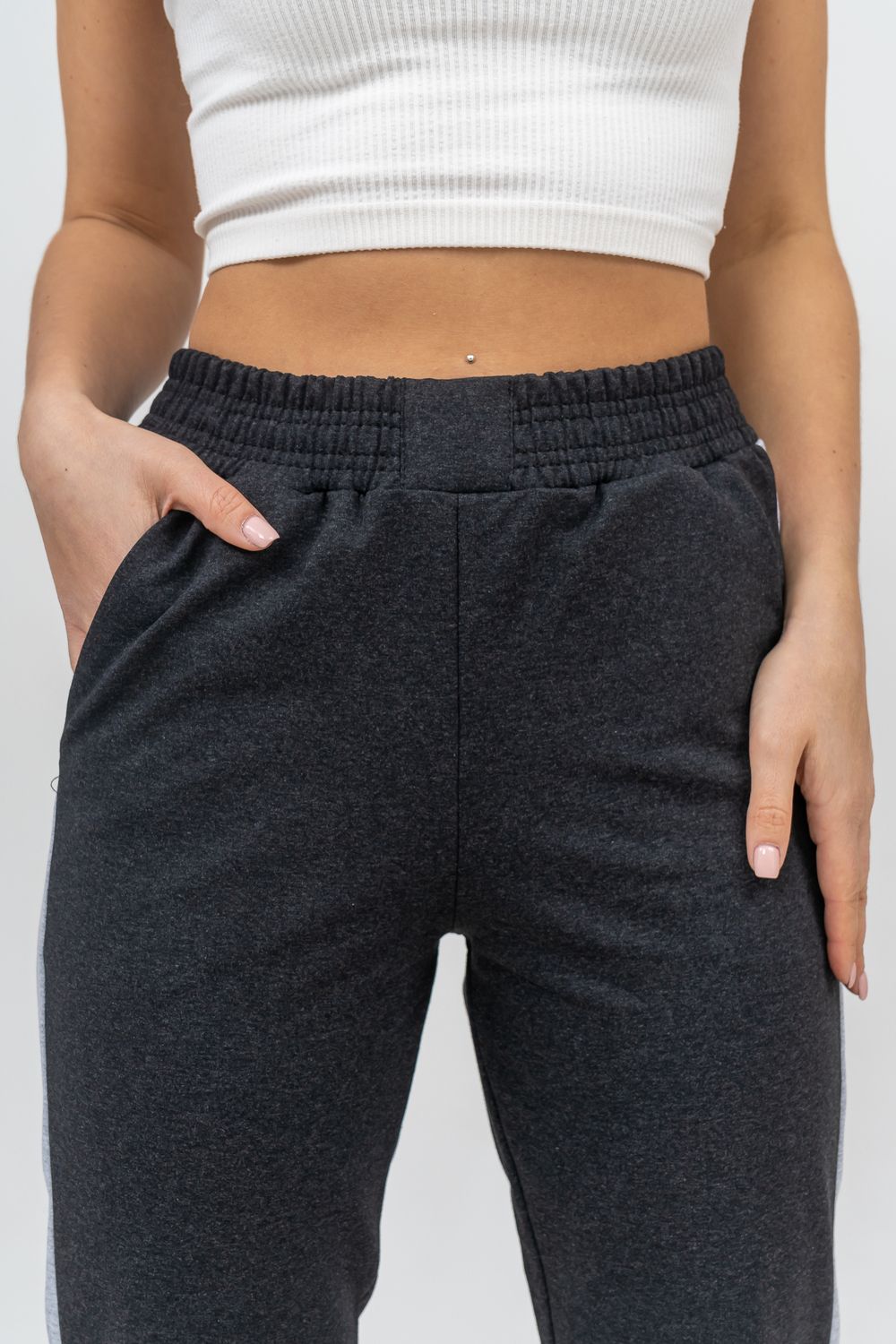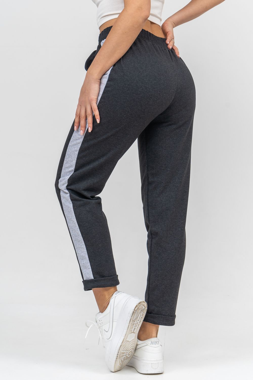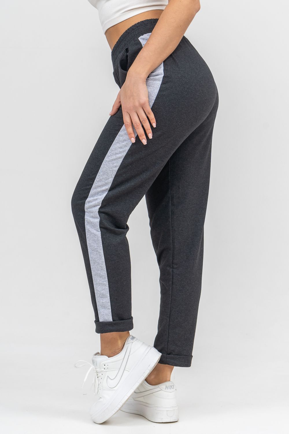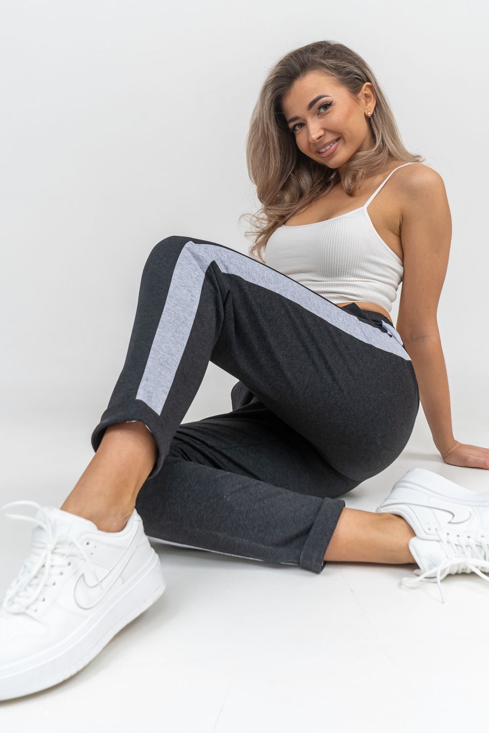Молодежные брюки с длиной 7/8 и манжетом по низу, выполнены из футера цвета антрацит. По бокам брюк имеются карманы и светлые вставки. Пояс брюк обработан на специальной поясной машине. Брюки подходят как для спорта, так и для отдыха.