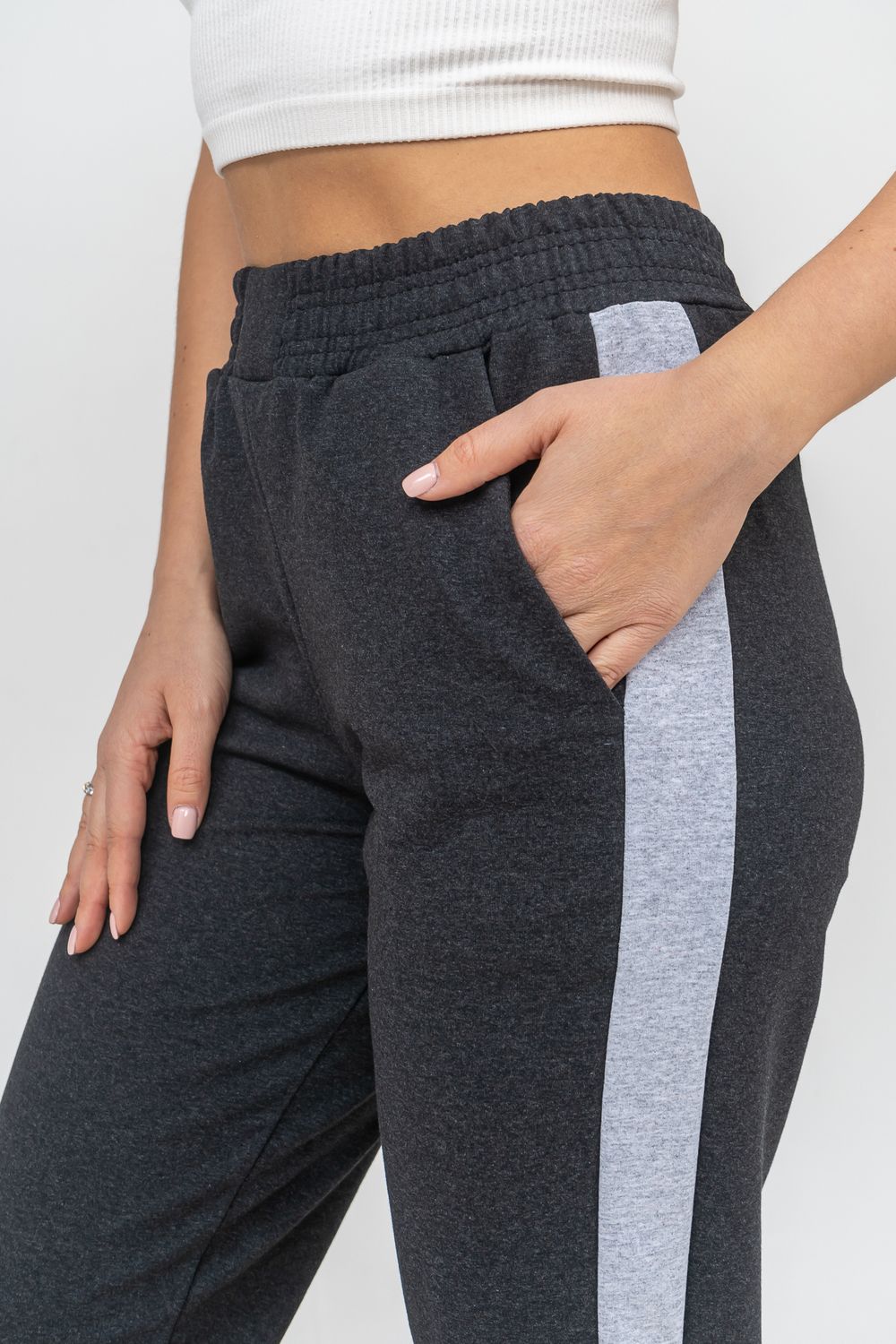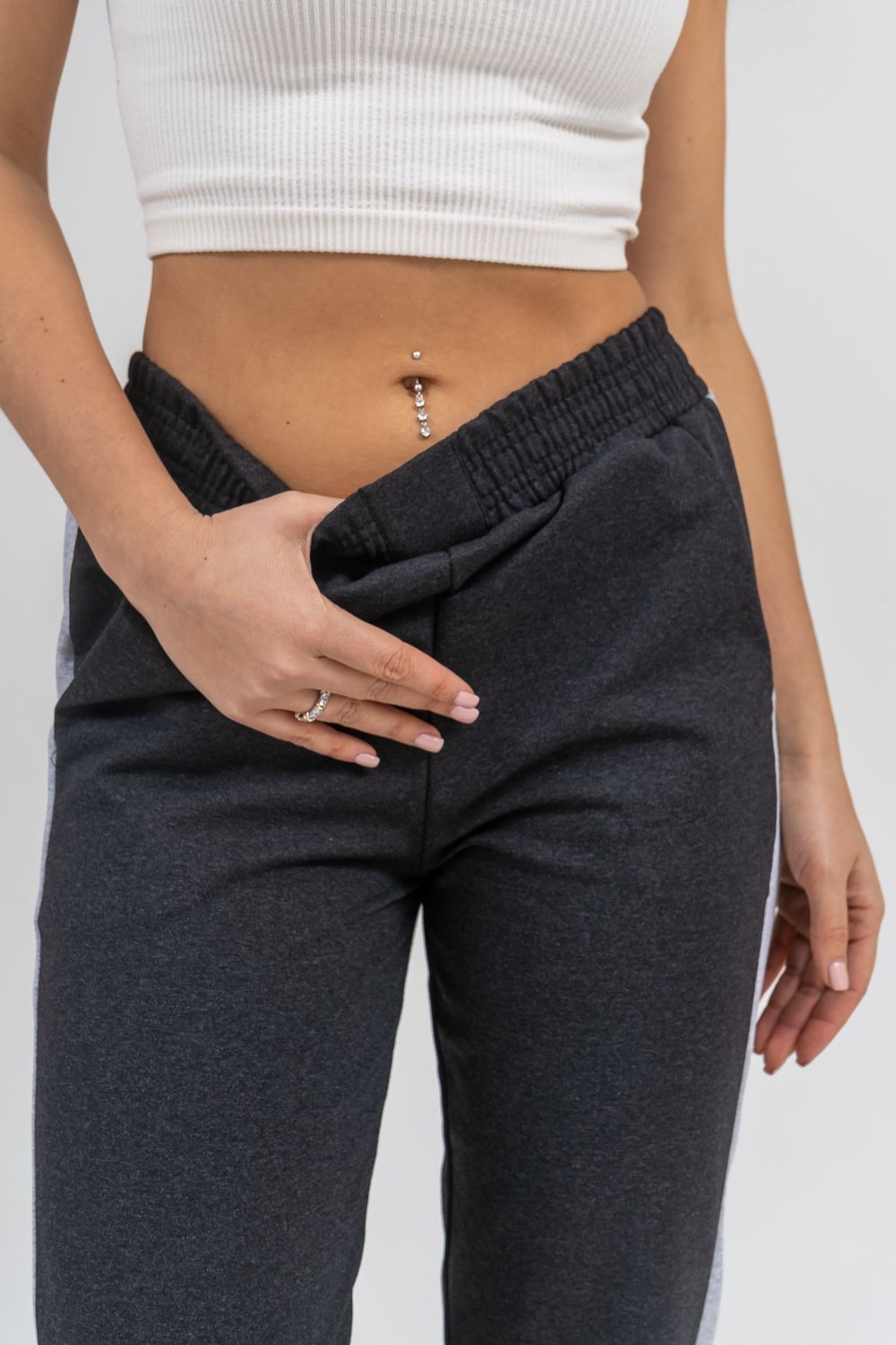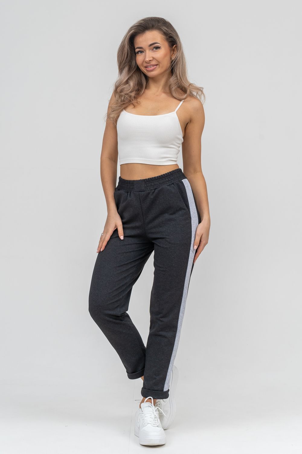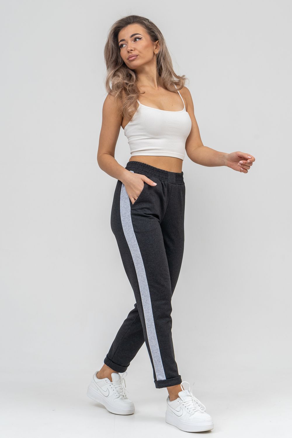 Молодежные брюки с длиной 7/8 и манжетом по низу, выполнены из футера цвета антрацит. По бокам брюк имеются карманы и светлые вставки. Пояс брюк обработан на специальной поясной машине. Брюки подходят как для спорта, так и для отдыха.