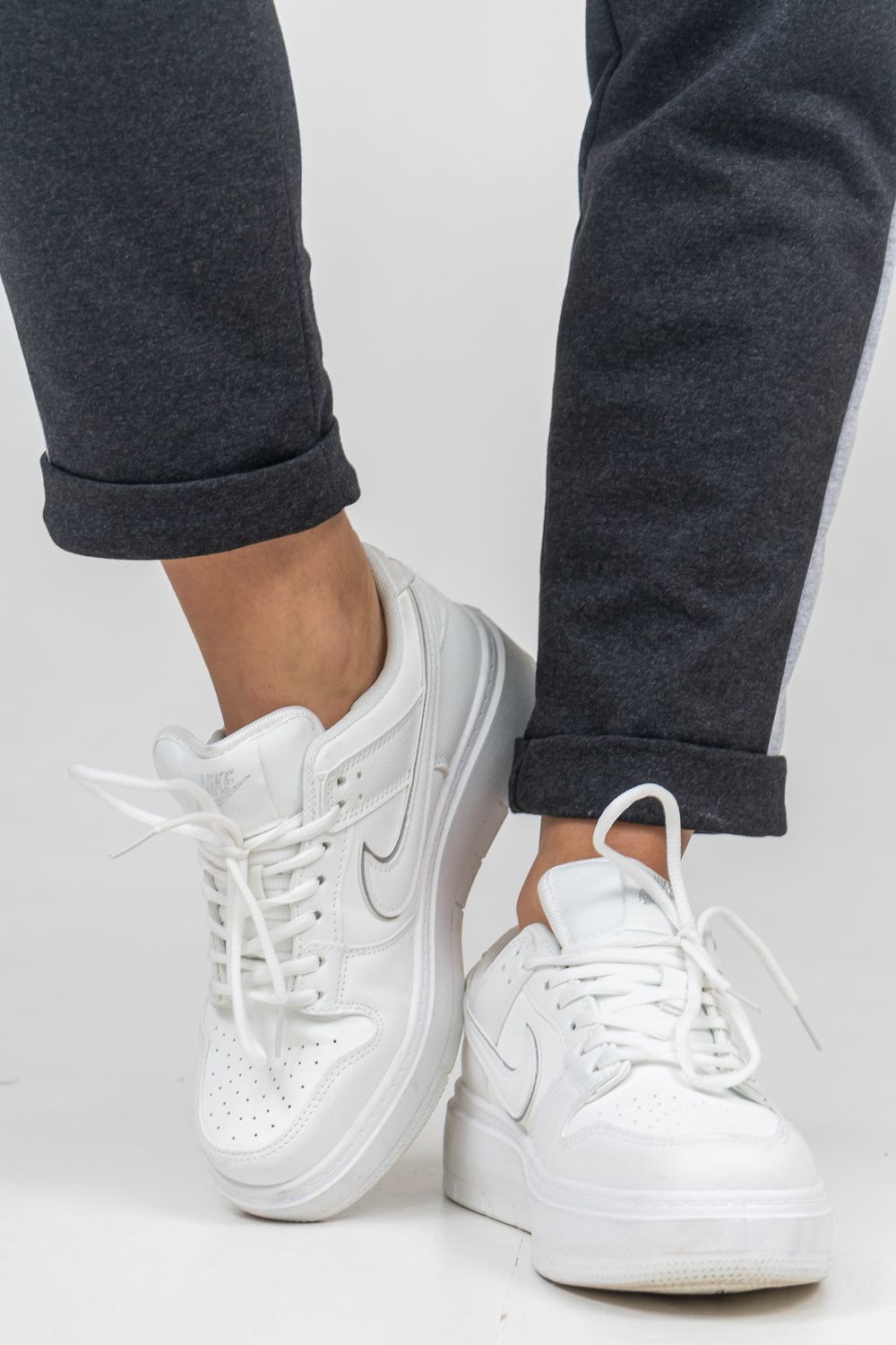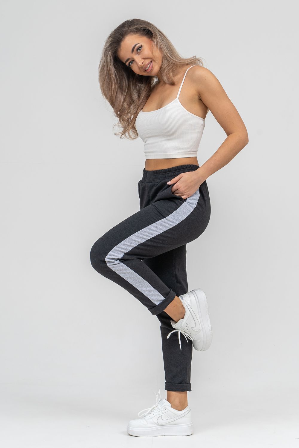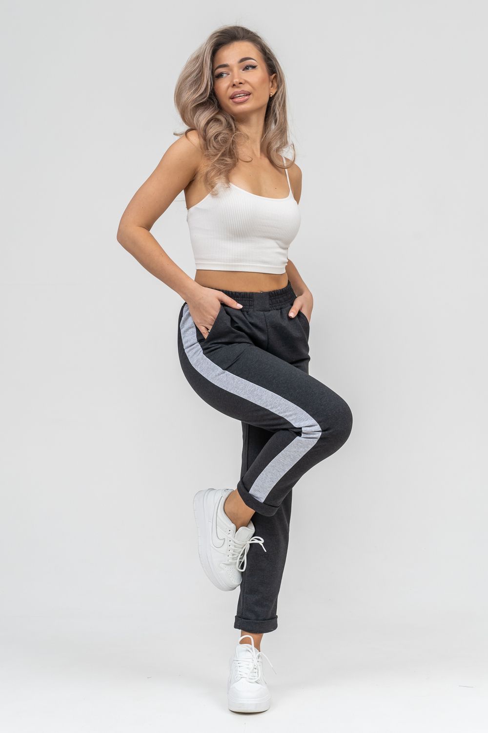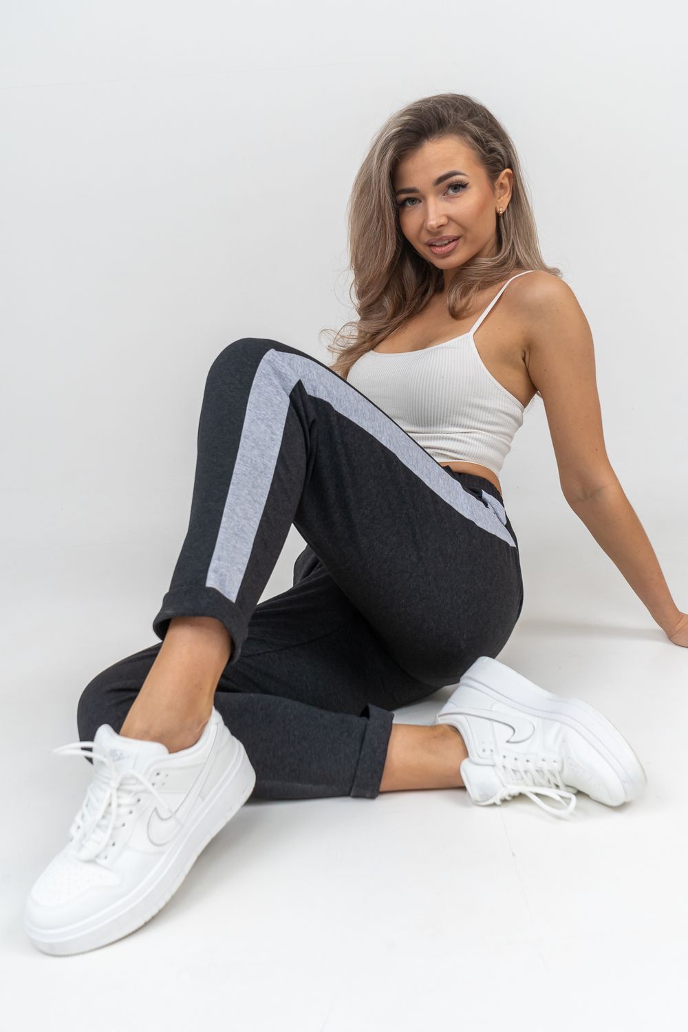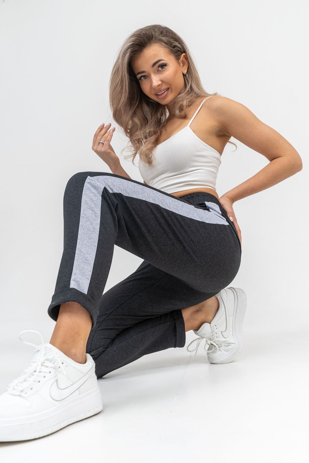 Молодежные брюки с длиной 7/8 и манжетом по низу, выполнены из футера цвета антрацит. По бокам брюк имеются карманы и светлые вставки. Пояс брюк обработан на специальной поясной машине. Брюки подходят как для спорта, так и для отдыха.