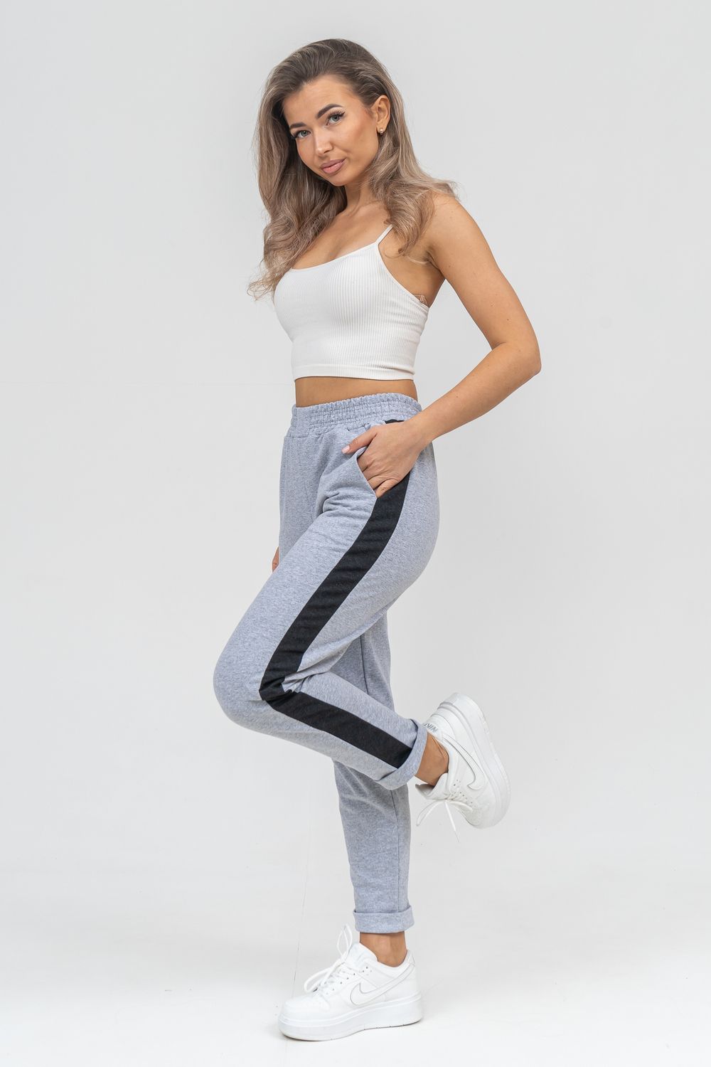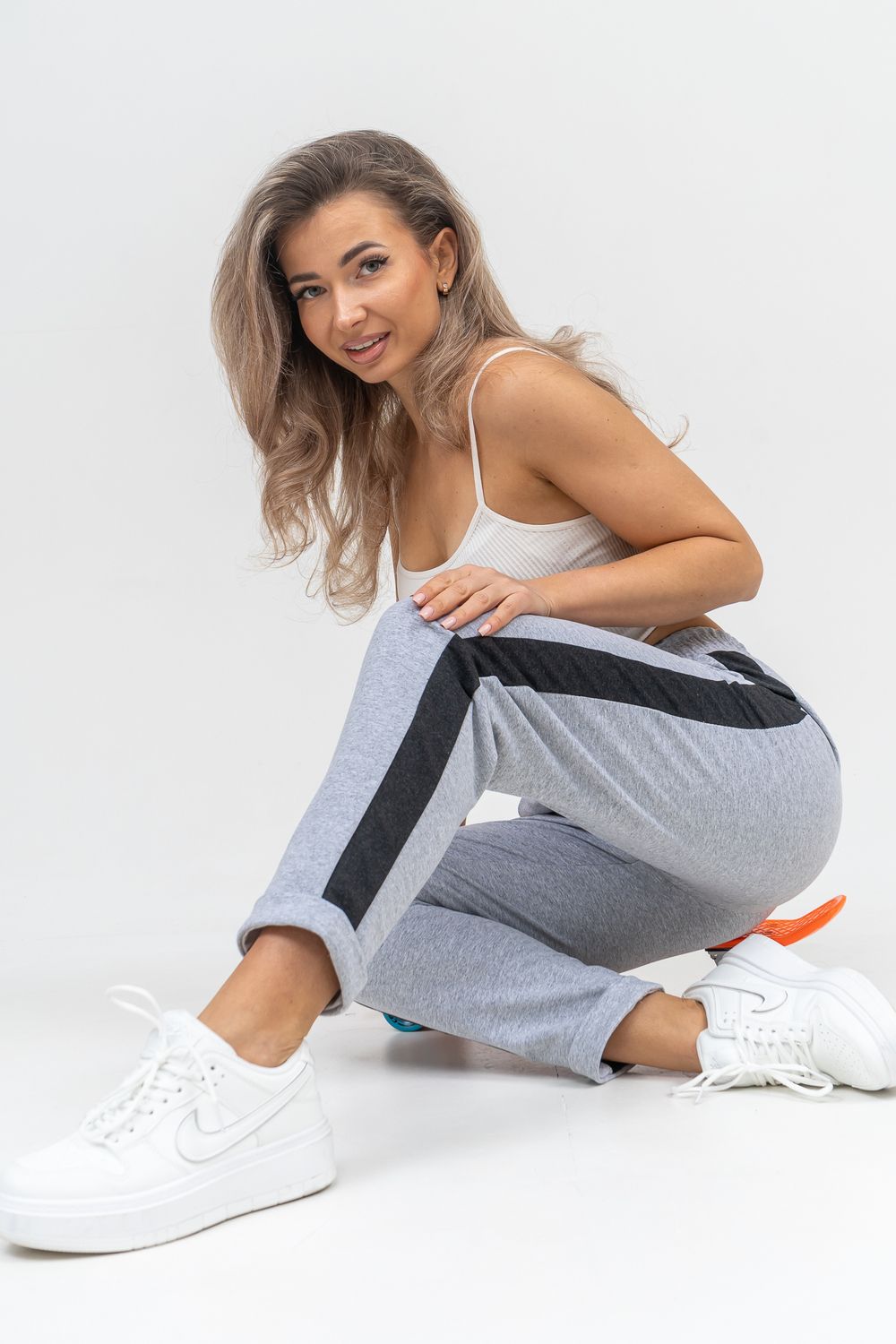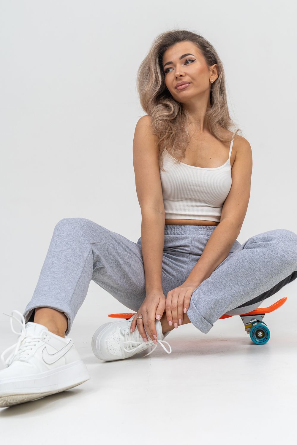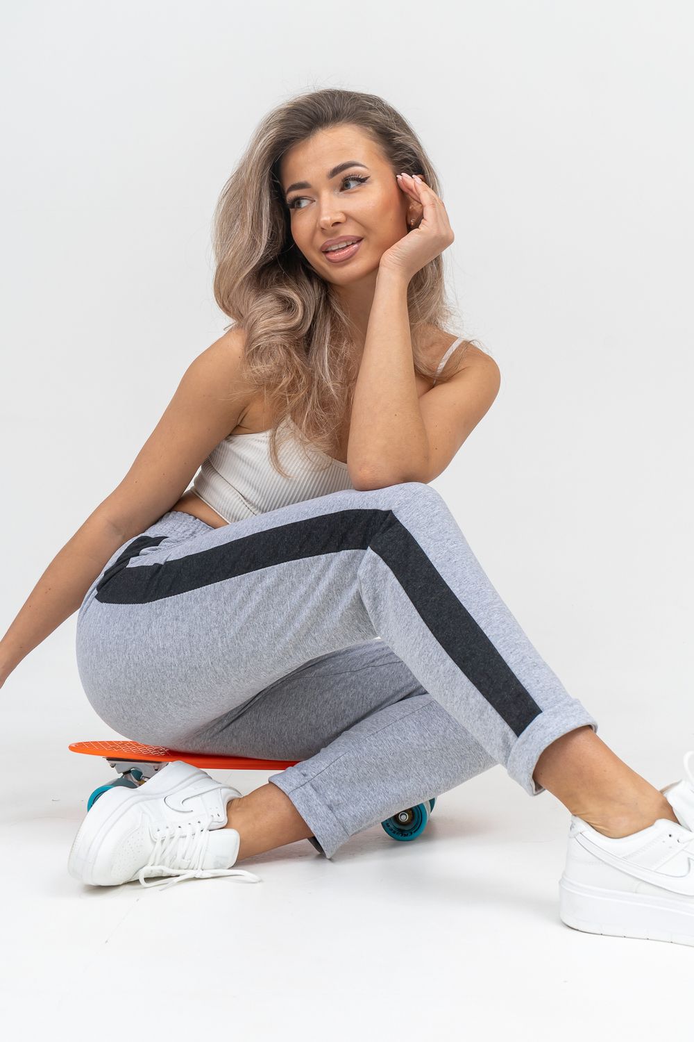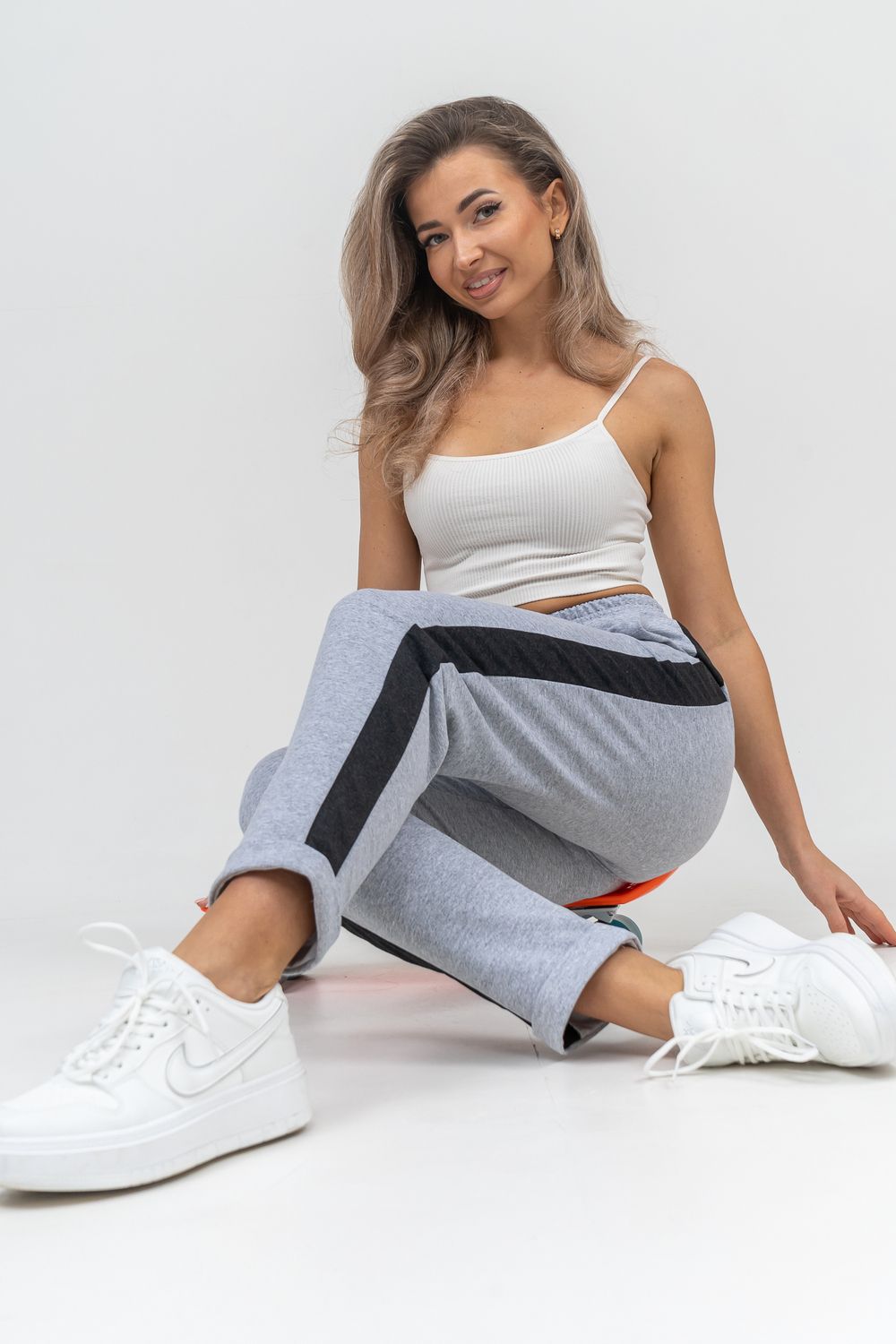 Молодежные брюки с длиной 7/8 и манжетом по низу, выполнены из футера цвета антрацит. По бокам брюк имеются карманы и светлые вставки. Пояс брюк обработан на специальной поясной машине. Брюки подходят как для спорта, так и для отдыха.