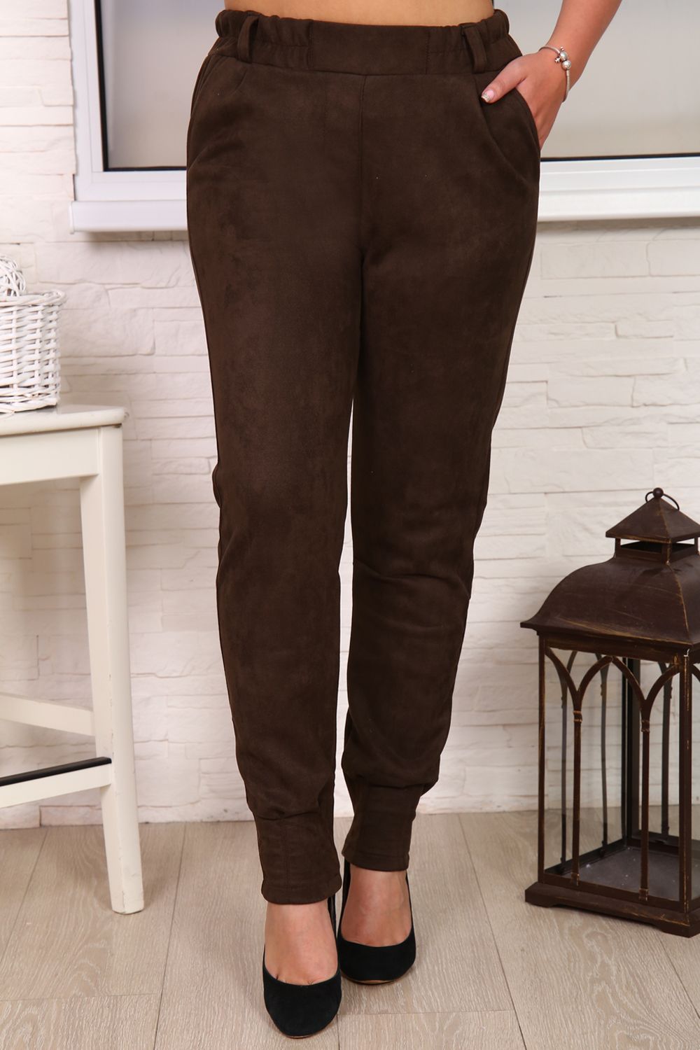 Брюки женские. Ткань замша эластичная, плотная. Брюки на поясе с резинкой по бовам и шлевками под ремешок. Гульф-имитация, карманы внутренние. Спереди по низу брюк по две складки-защипы. Талия завышена. Очень удобная посадка.