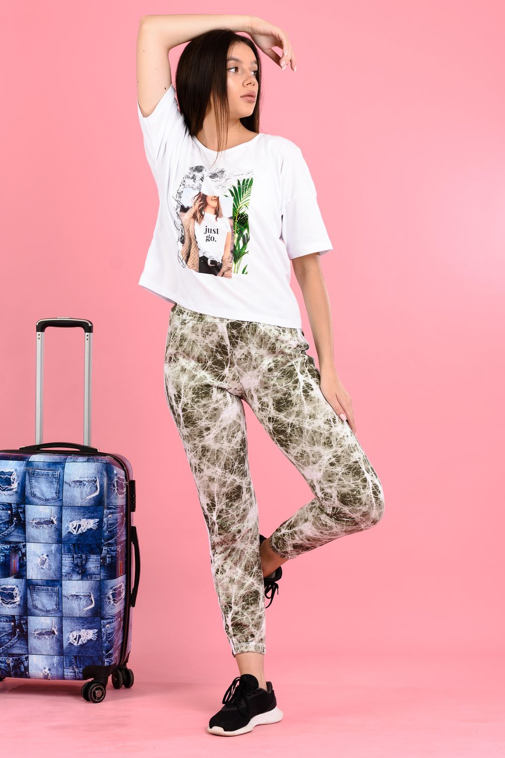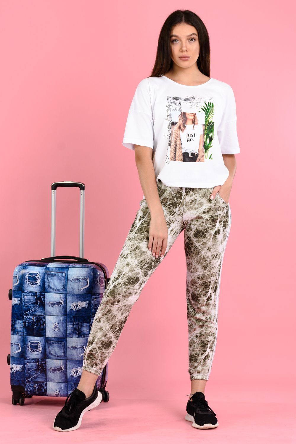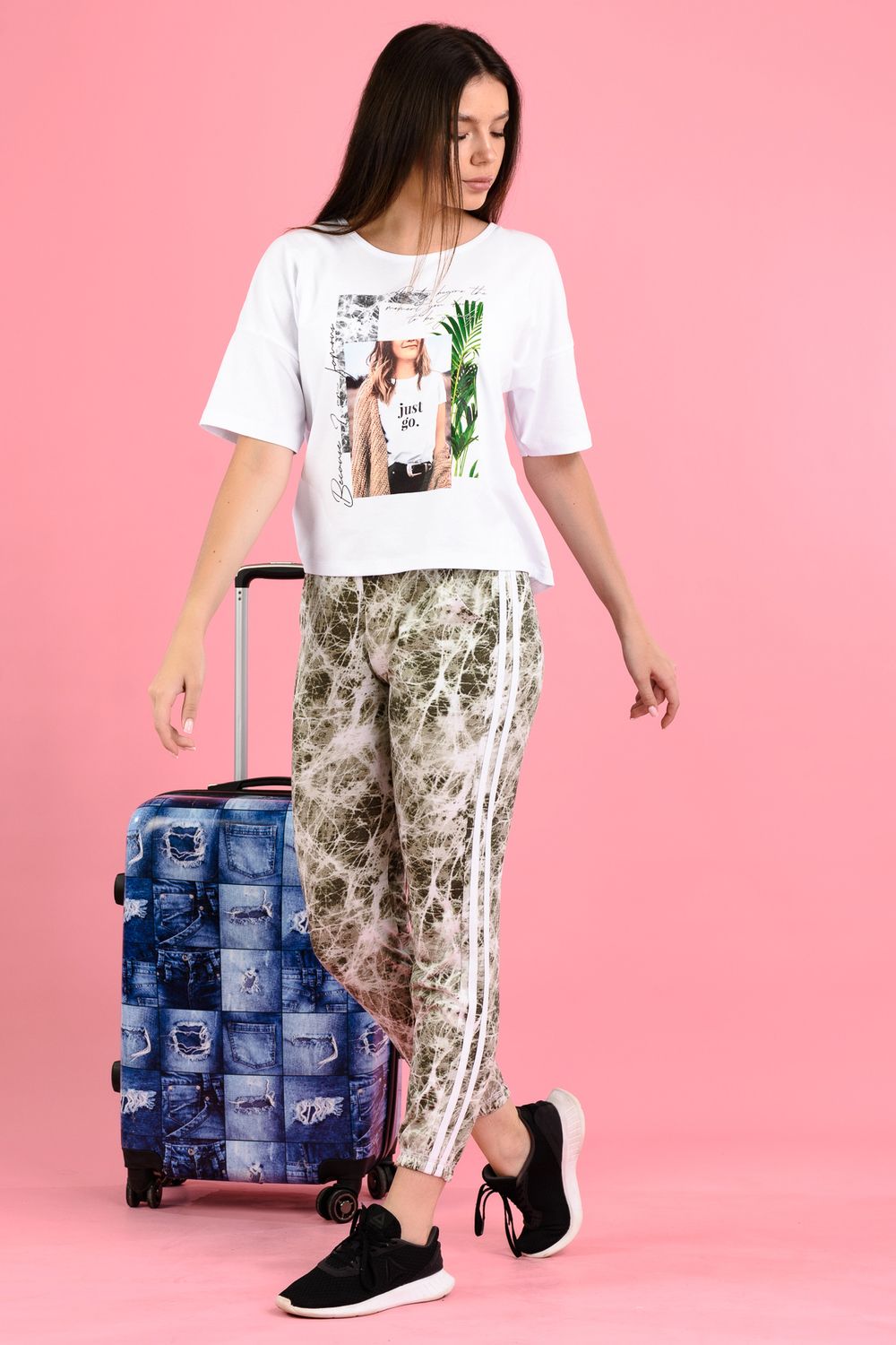 Брюки свободные, длинные, с карманами, на эластичном поясе, с резинкой по низу. Вдоль боковых швов расположены лампасы из отделочного полотна.