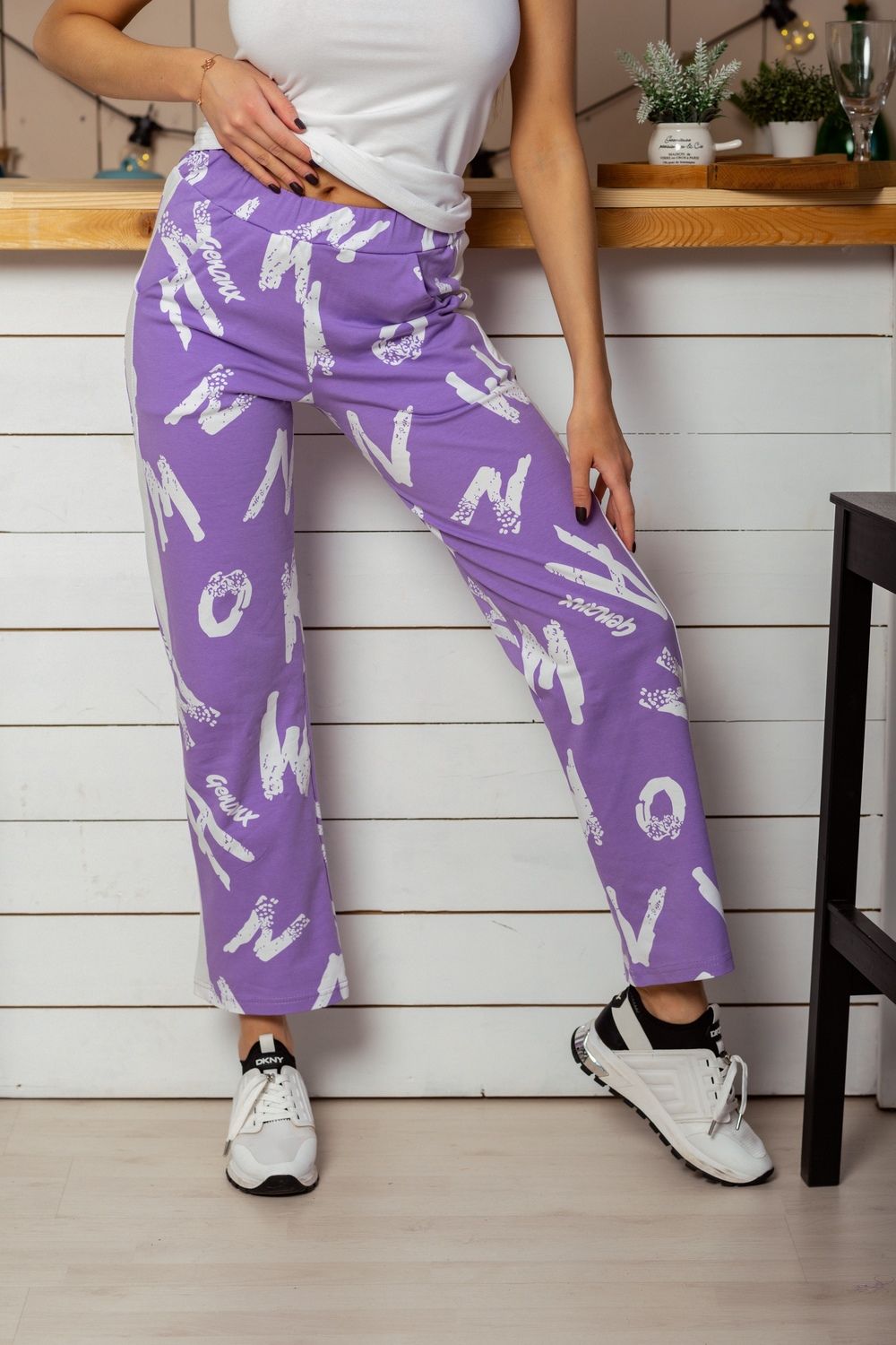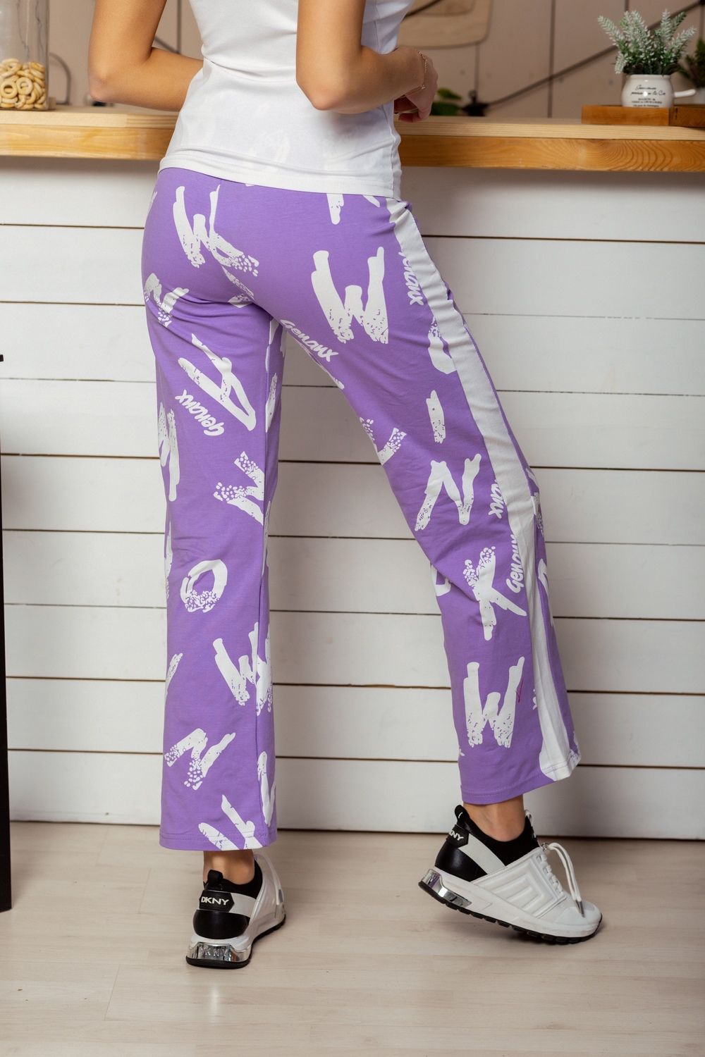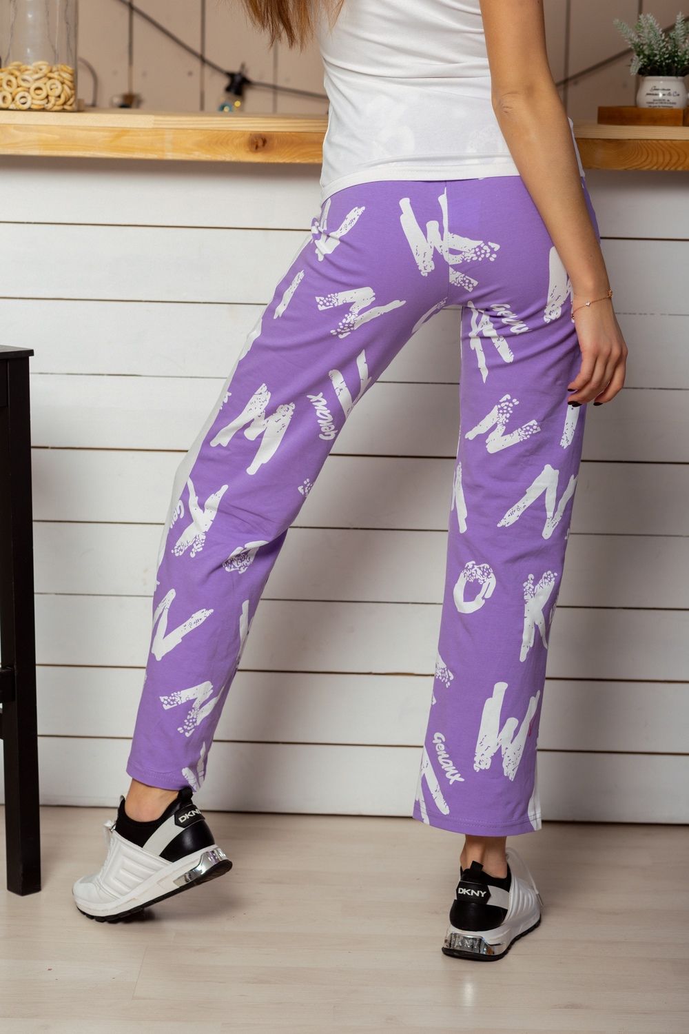 Брюки свободные, прямые, с карманами, на поясе. Вдоль боковых швов расположены лампасы из отделочного полотна. Можно составить комплект с майкой 8238