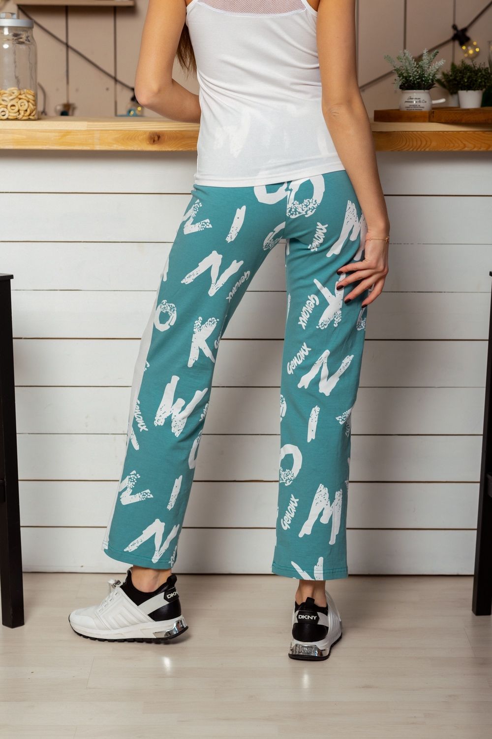 Брюки свободные, прямые, с карманами, на поясе. Вдоль боковых швов расположены лампасы из отделочного полотна. Можно составить комплект с майкой 8238