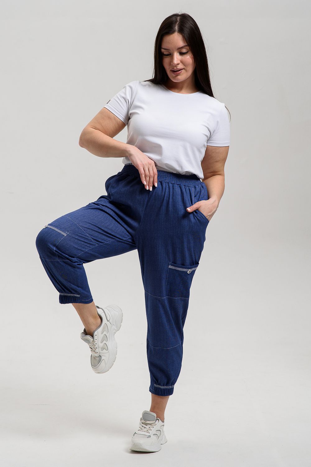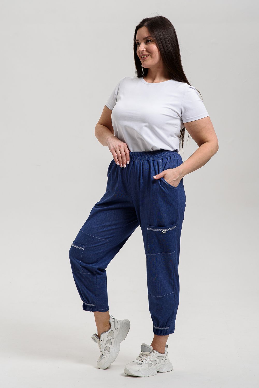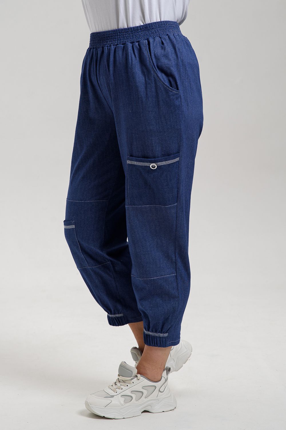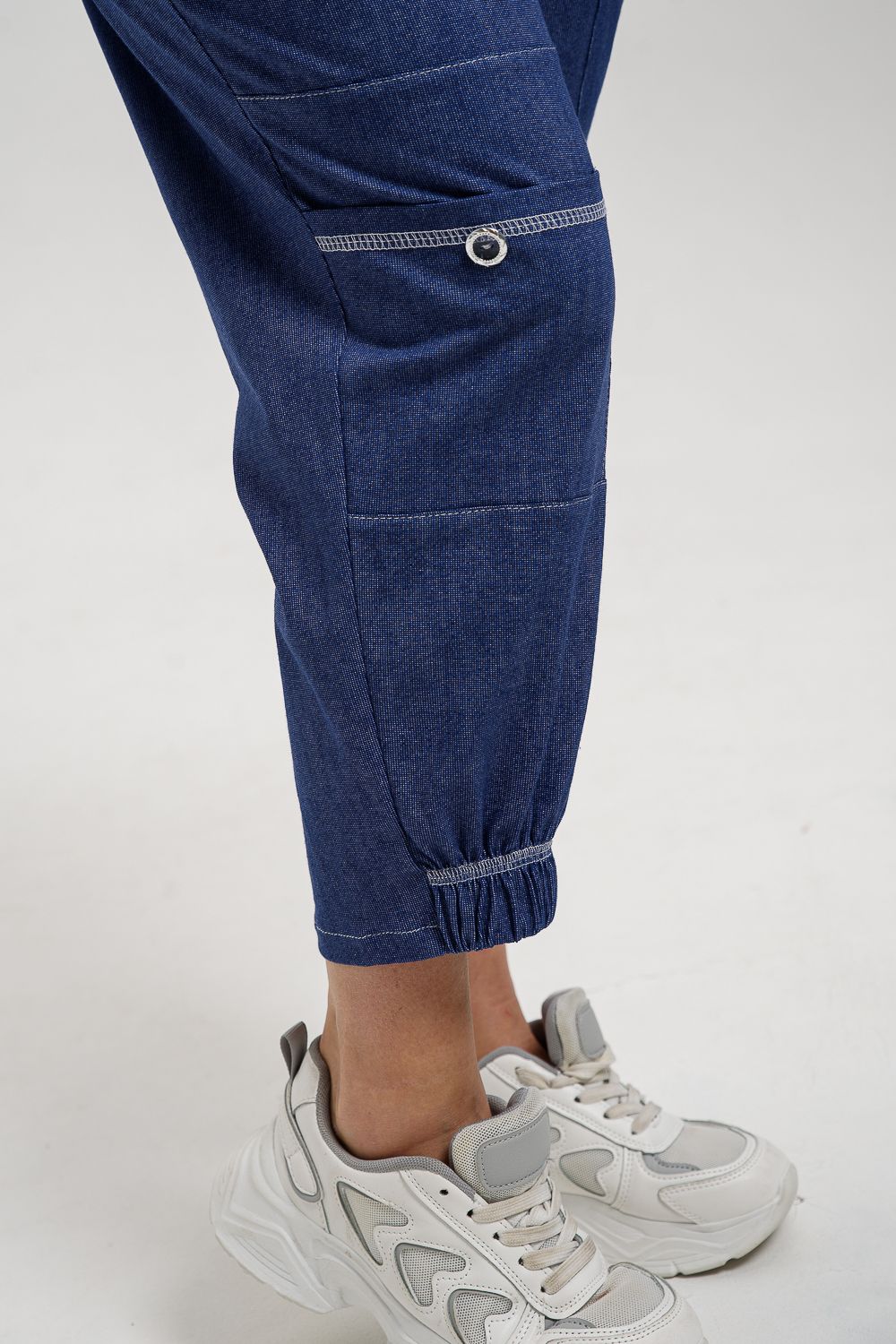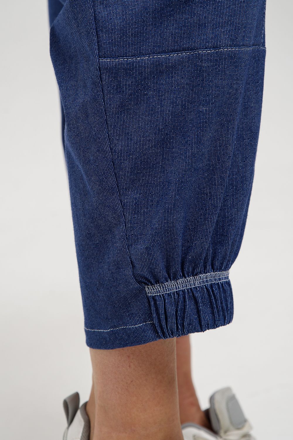 Брюки женские, "бананы". На передней части брюк внутренние карманы. Также имеются два накладных кармана с пуговицей, Один в верхней части брюк, другой на средней части брюк. Низ передней половинки брюк на резинке. Пояс прострочен на многоигольной машине.