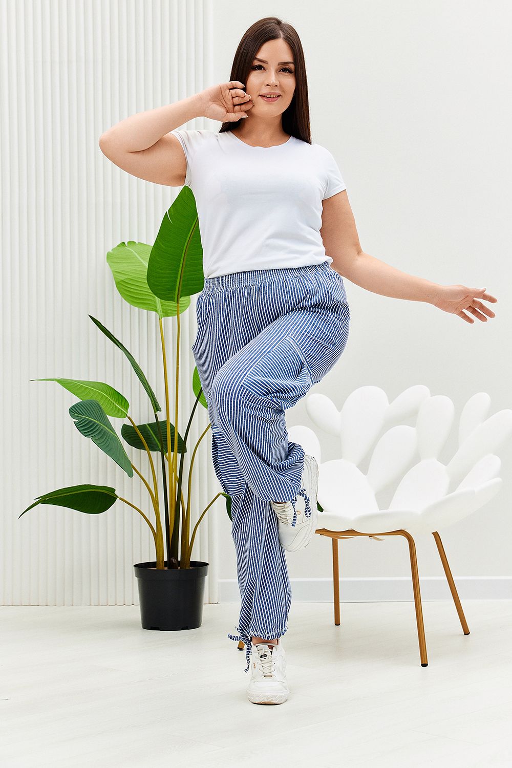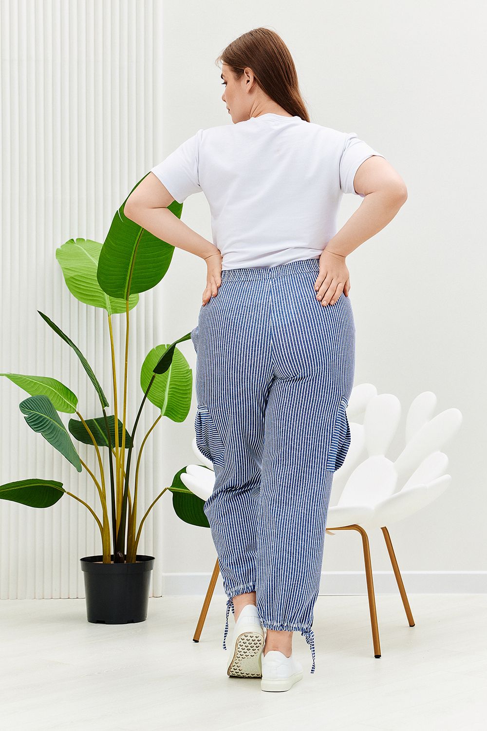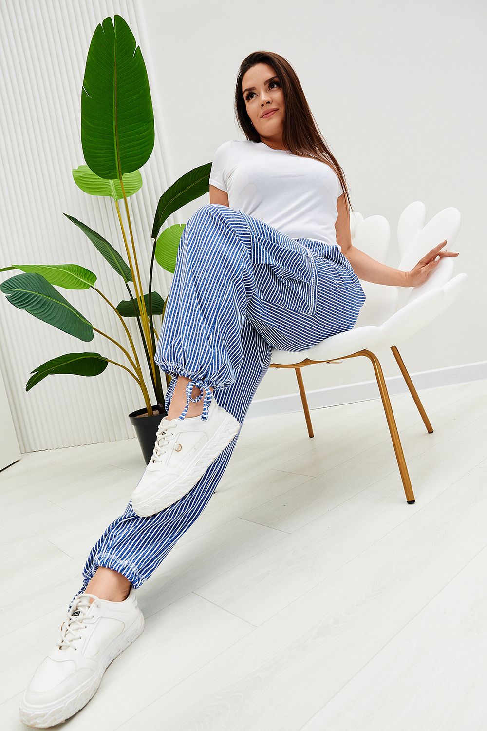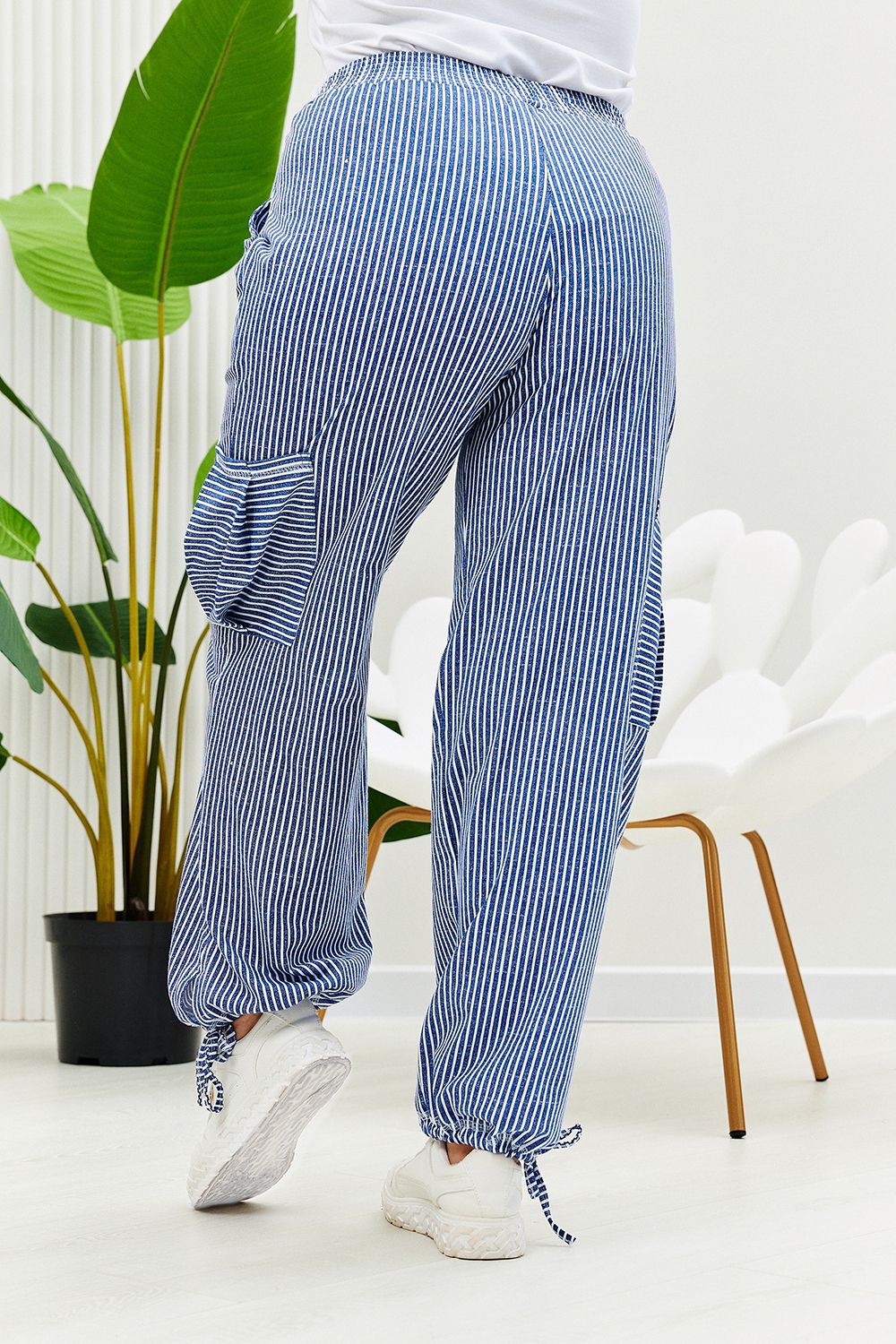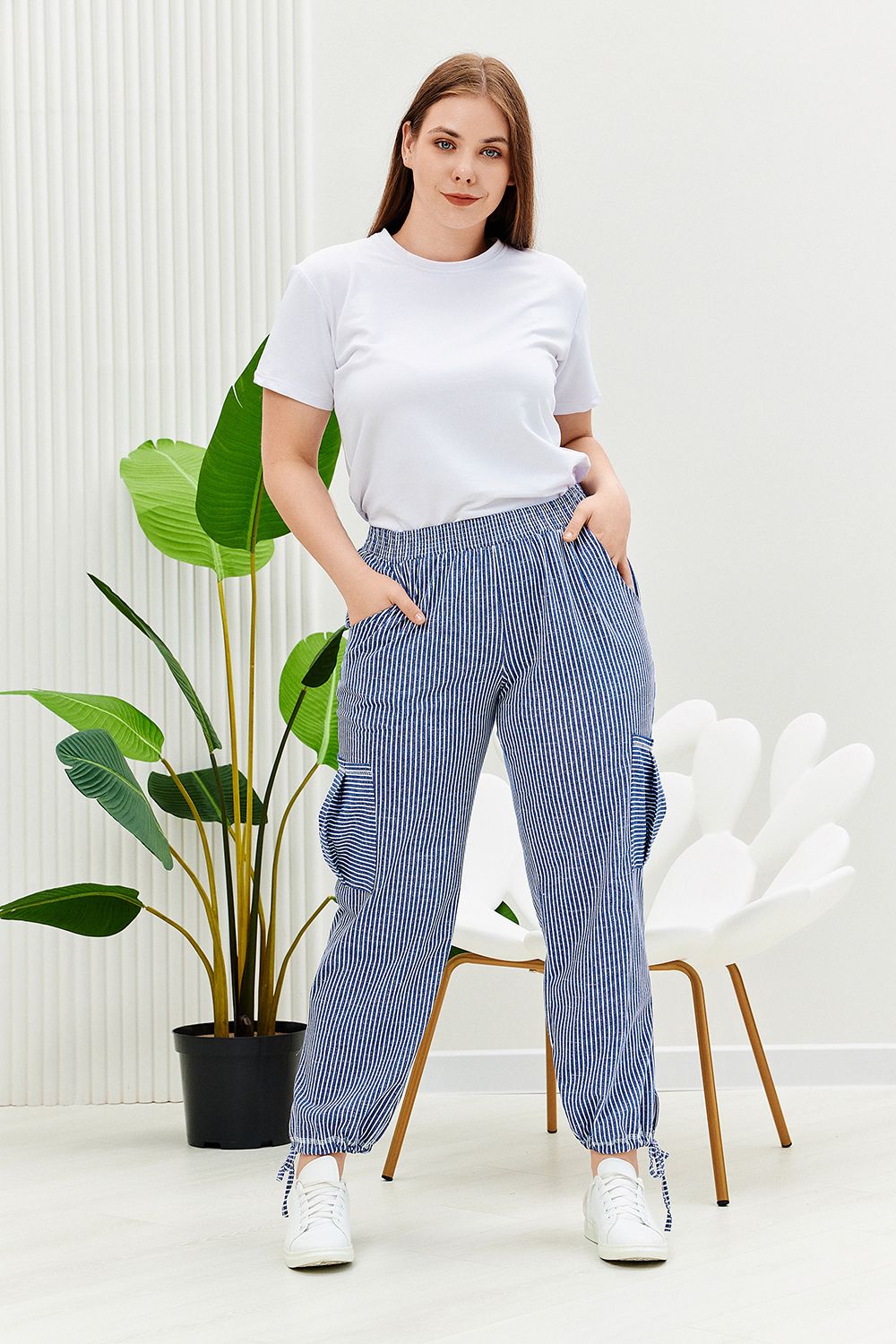 Брюки прямого силуэта, внизу брюк разрезы и утяжки. На передних частях внутренние карманы и боковые с бантовой складкой. Пояс выполнен на многоигольной машине
