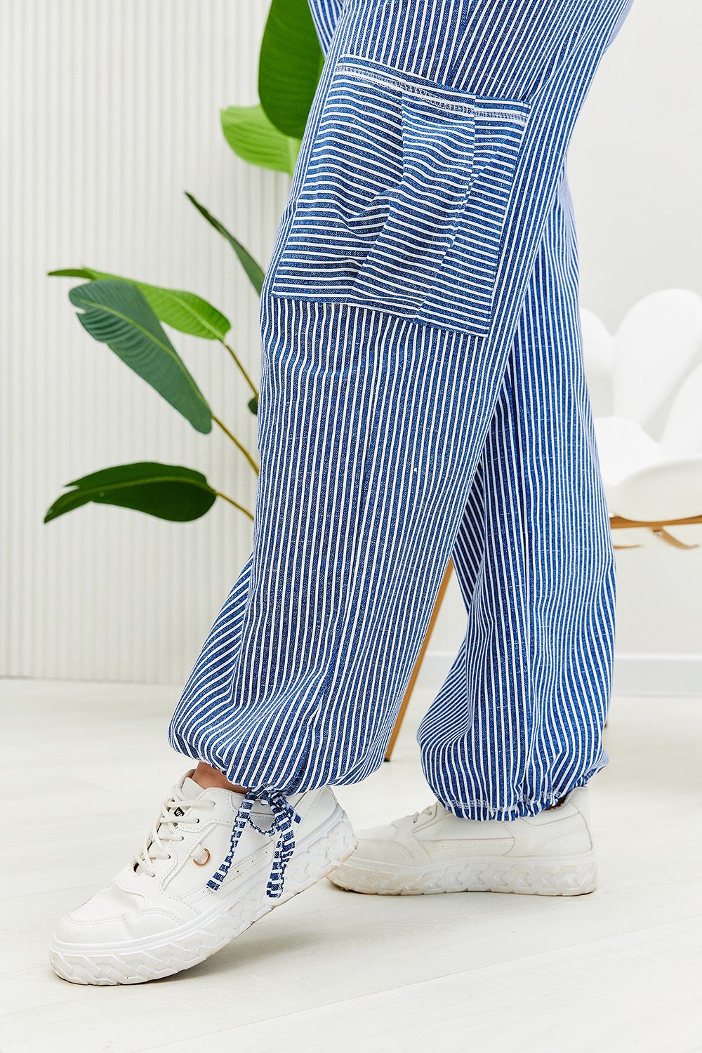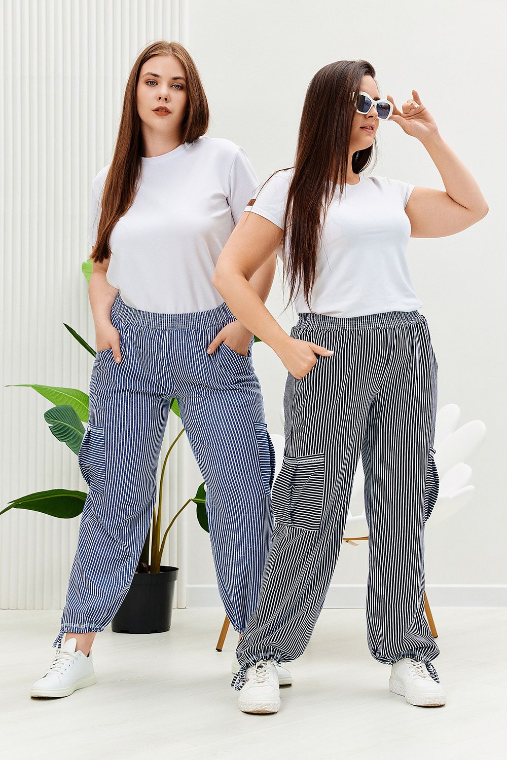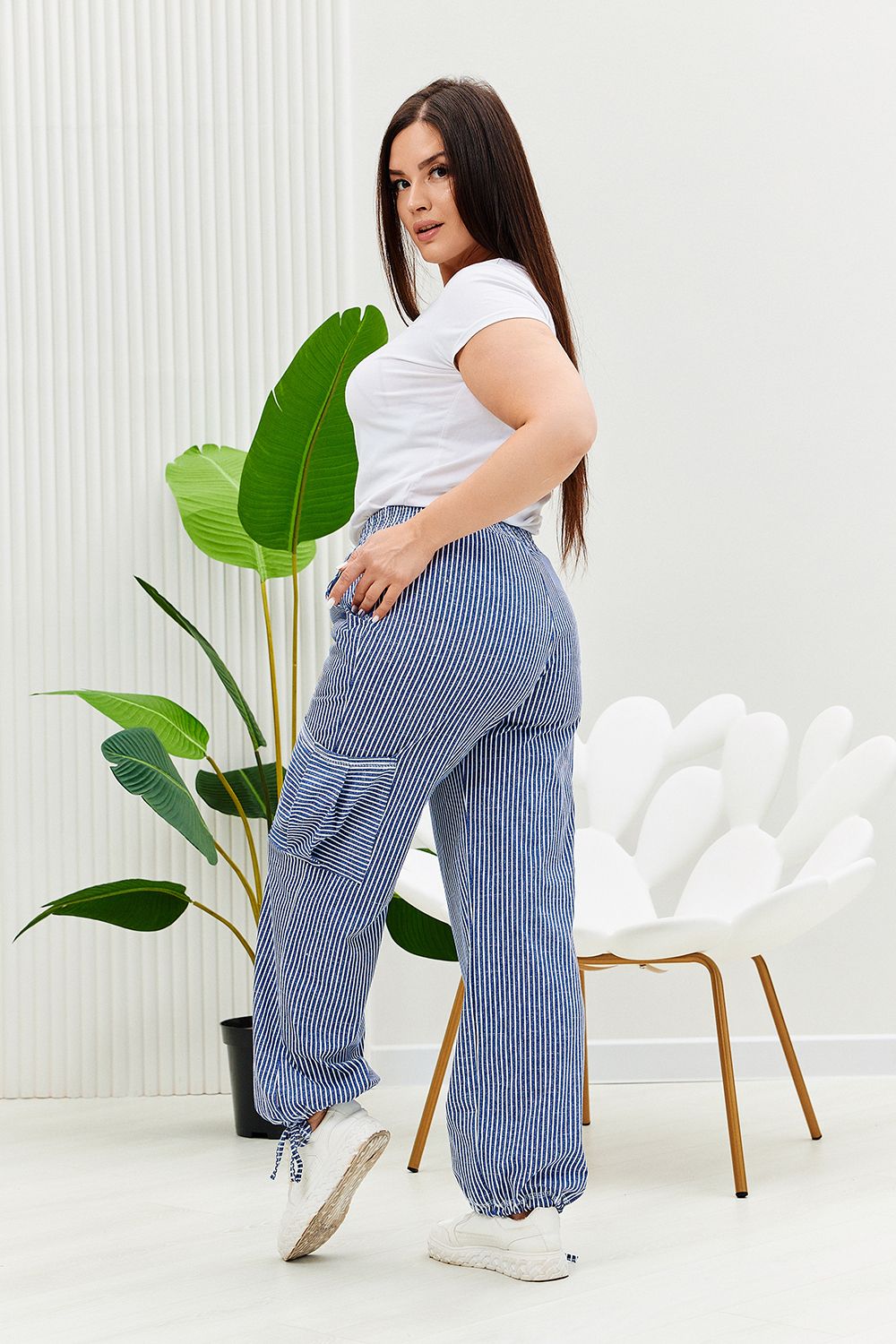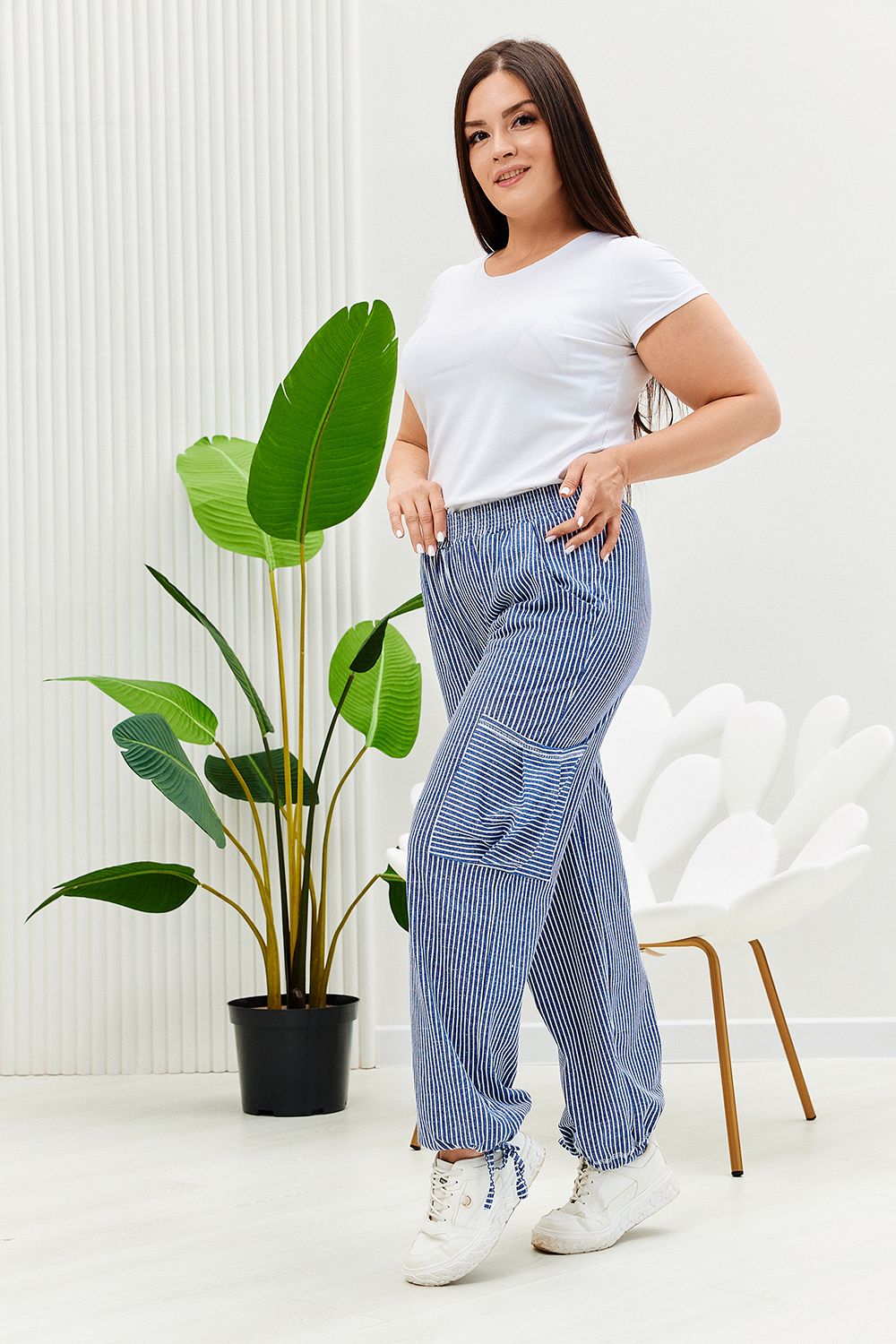 Брюки прямого силуэта, внизу брюк разрезы и утяжки. На передних частях внутренние карманы и боковые с бантовой складкой. Пояс выполнен на многоигольной машине