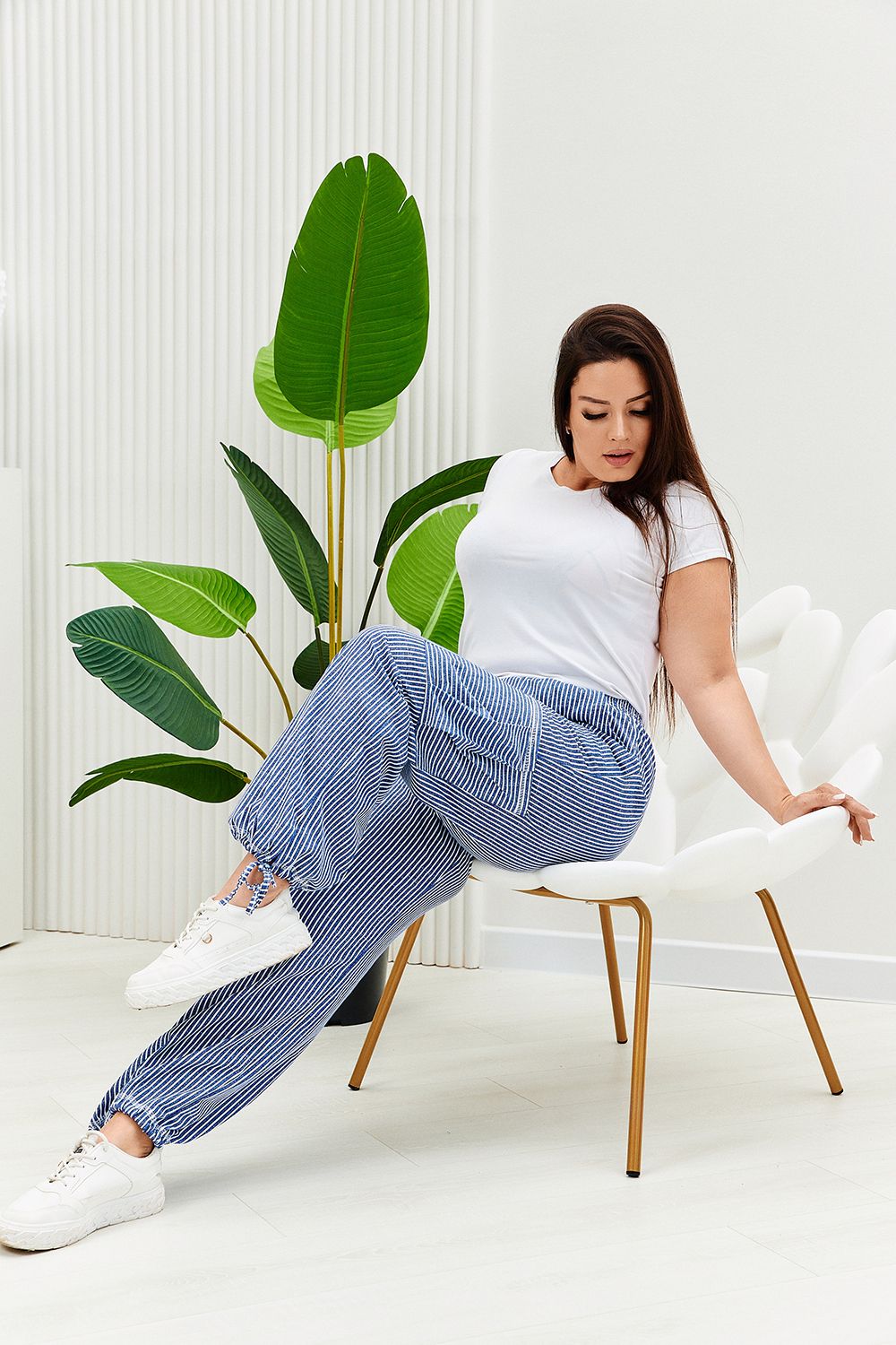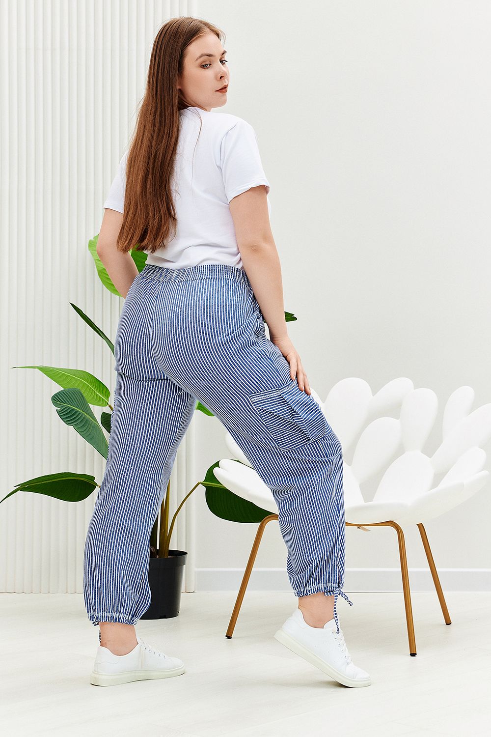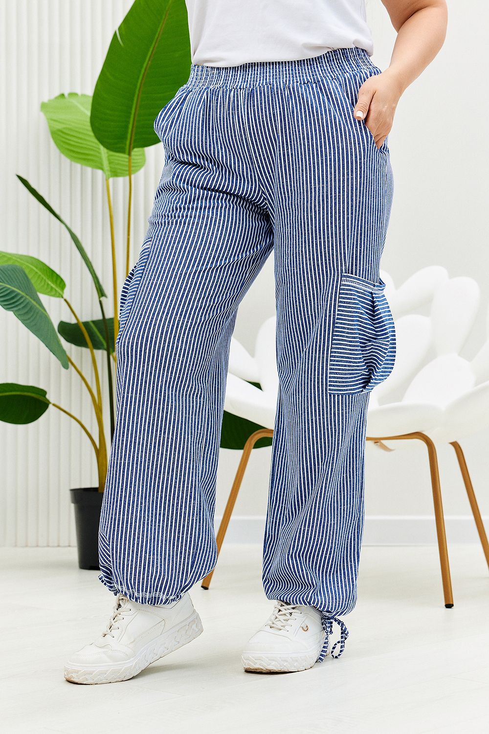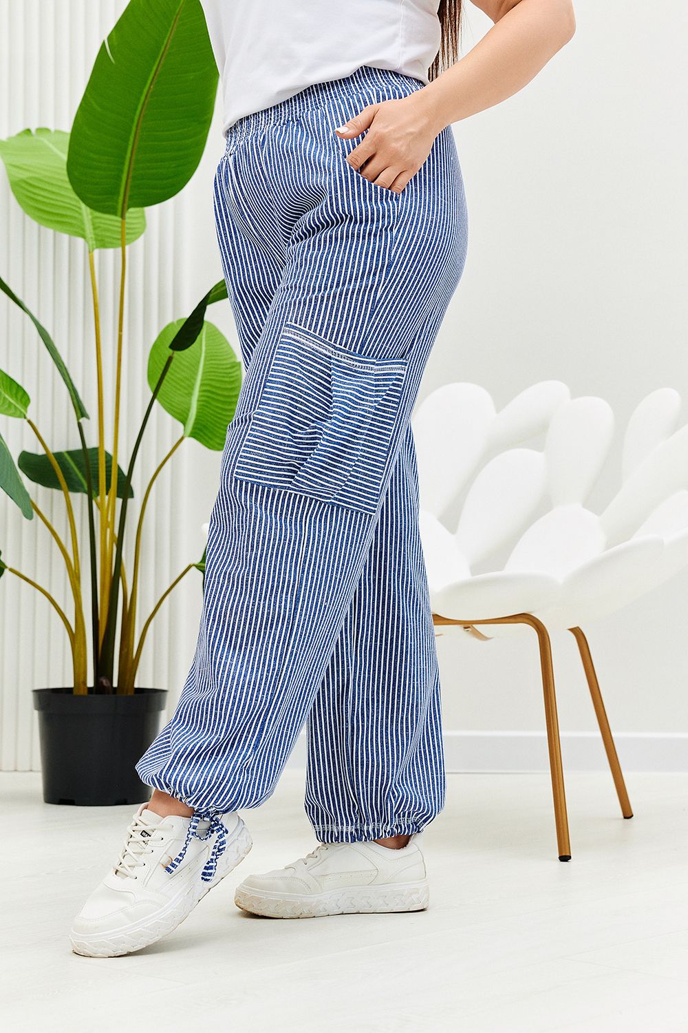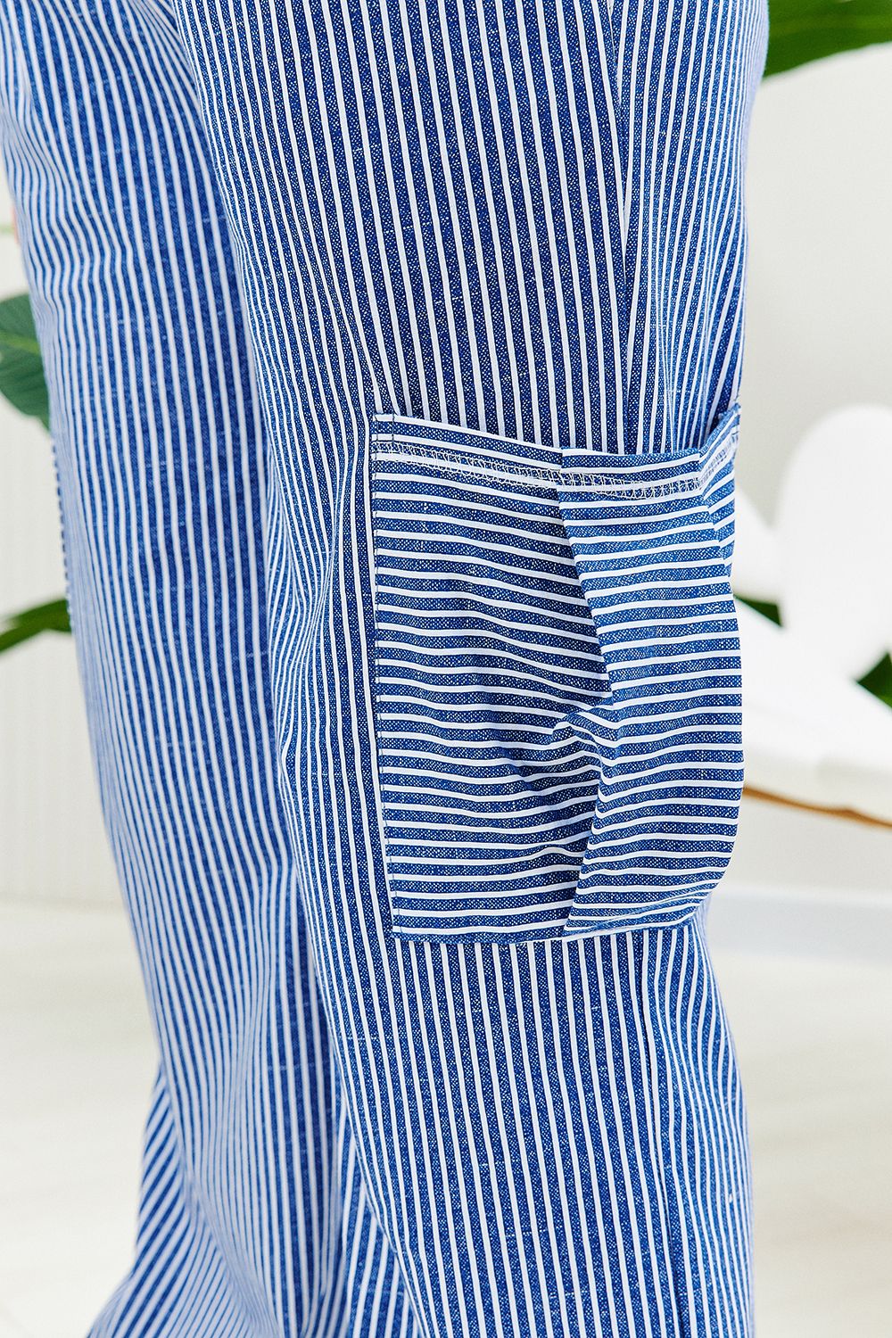 Брюки прямого силуэта, внизу брюк разрезы и утяжки. На передних частях внутренние карманы и боковые с бантовой складкой. Пояс выполнен на многоигольной машине
