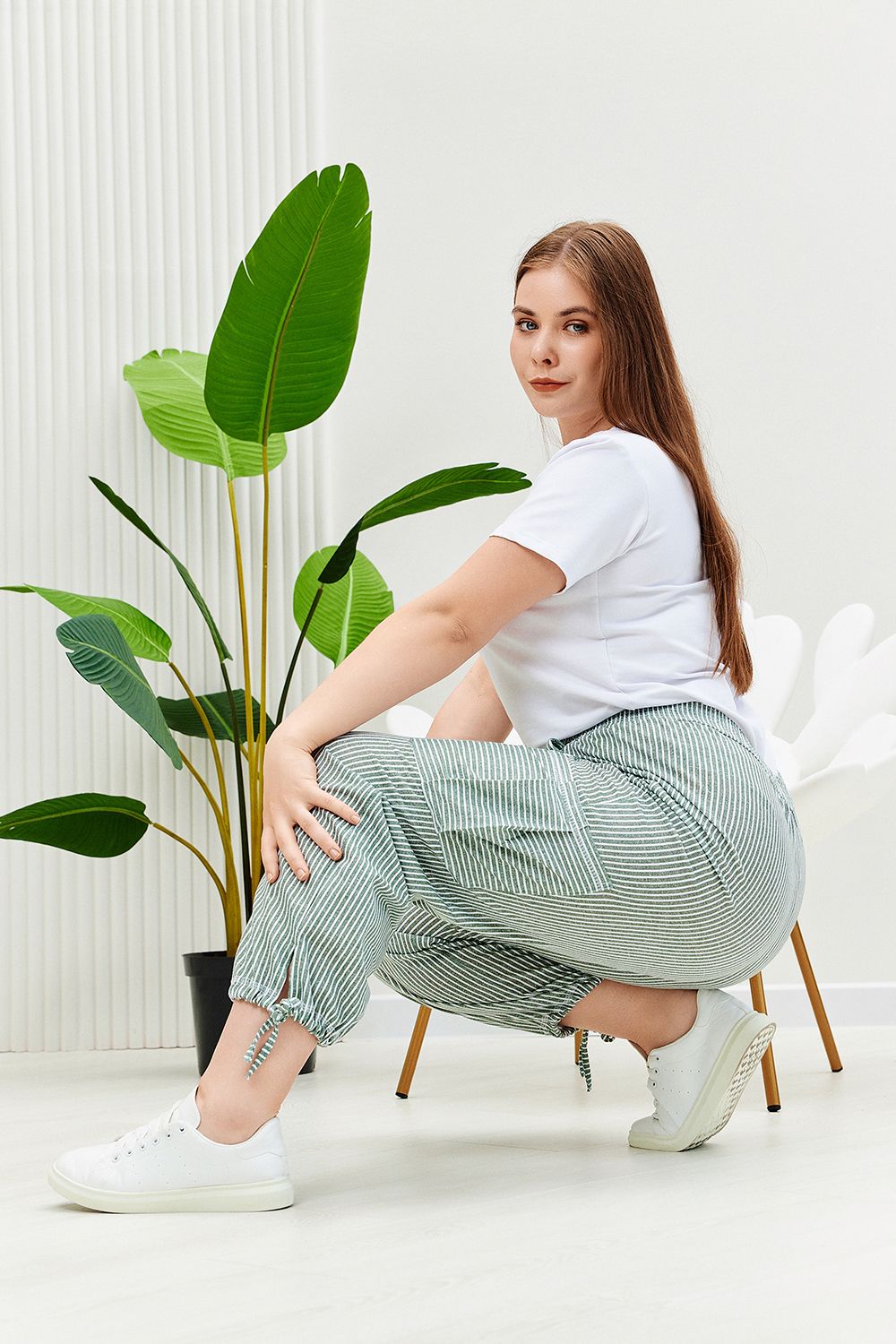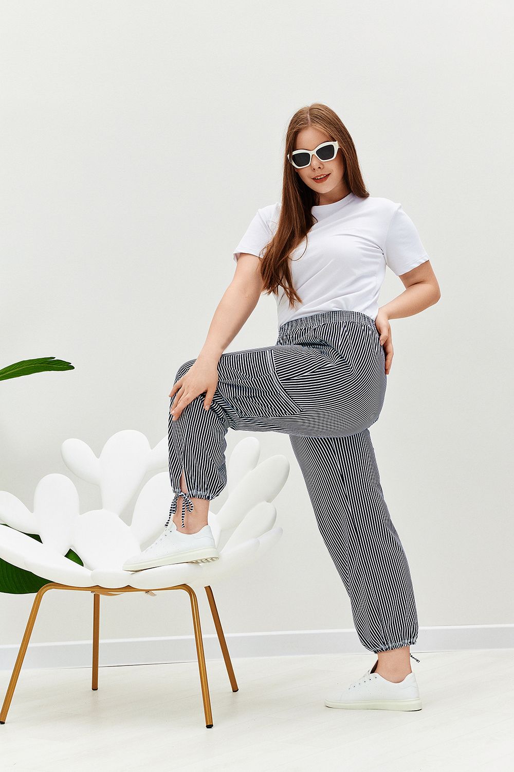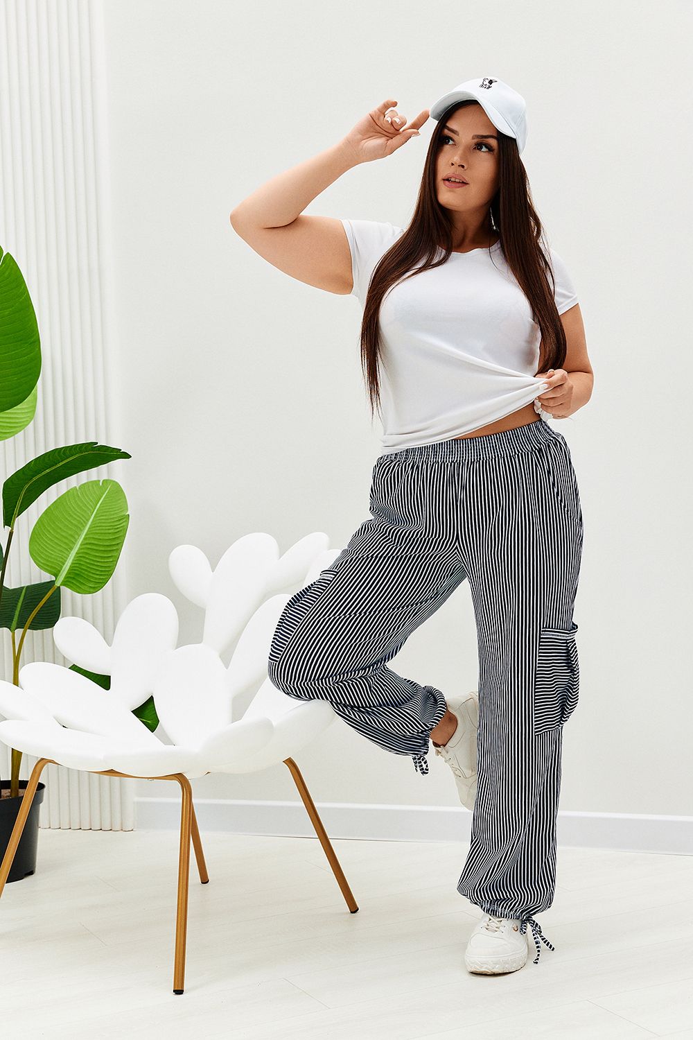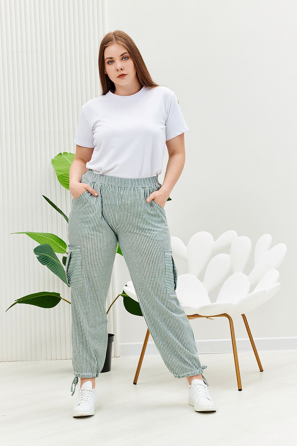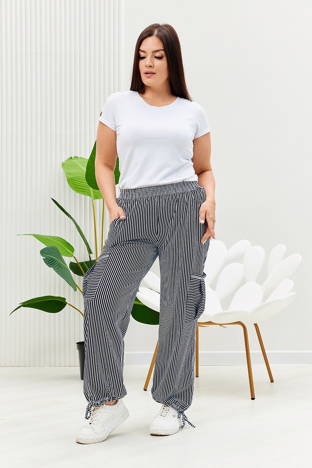 Брюки прямого силуэта, внизу брюк разрезы и утяжки. На передних частях внутренние карманы и боковые с бантовой складкой. Пояс выполнен на многоигольной машине
