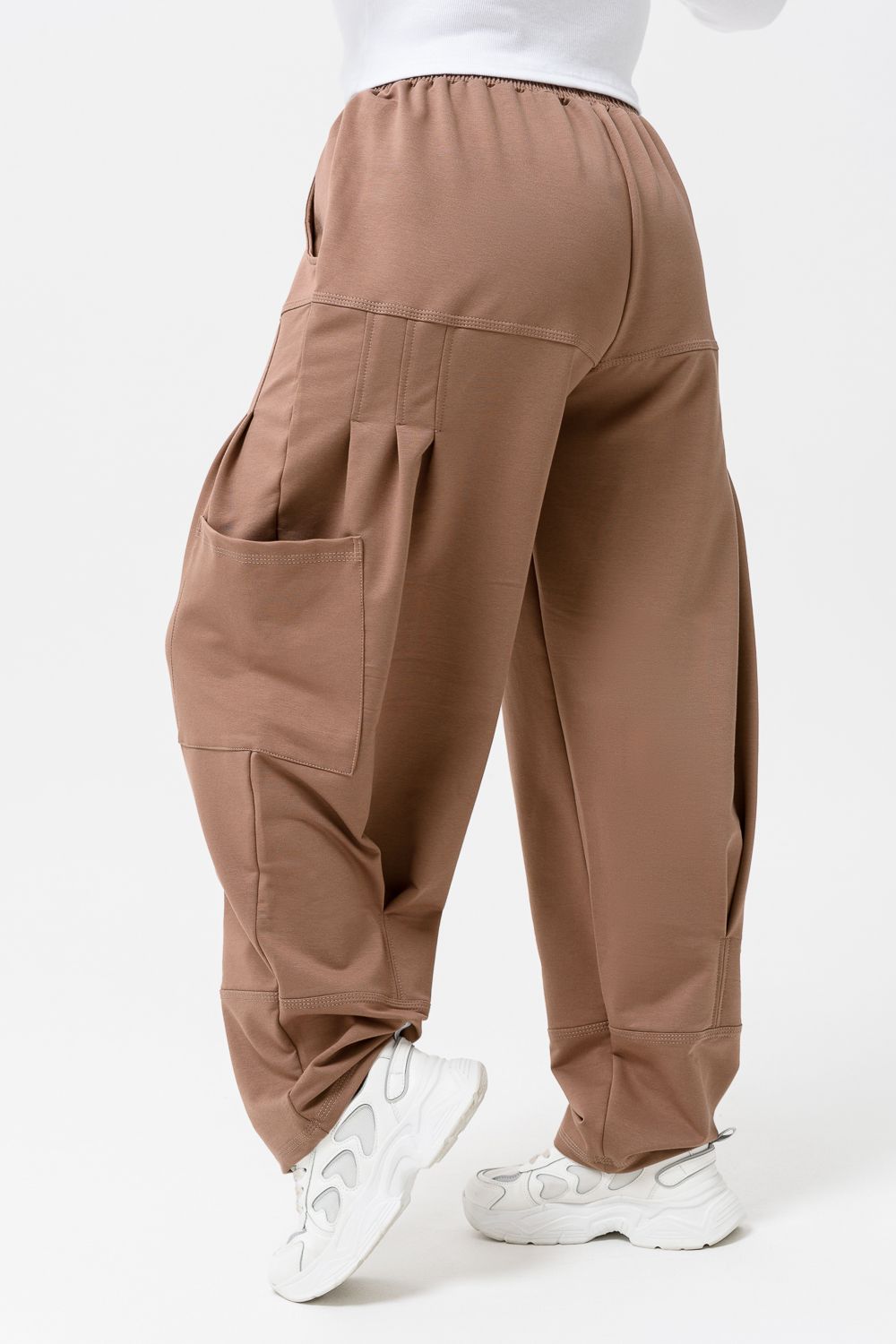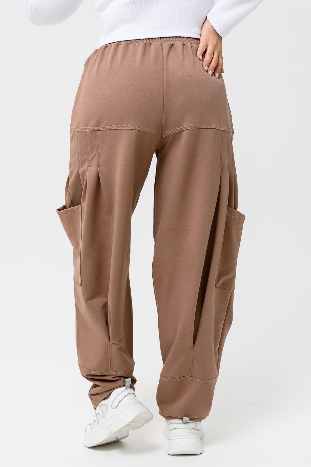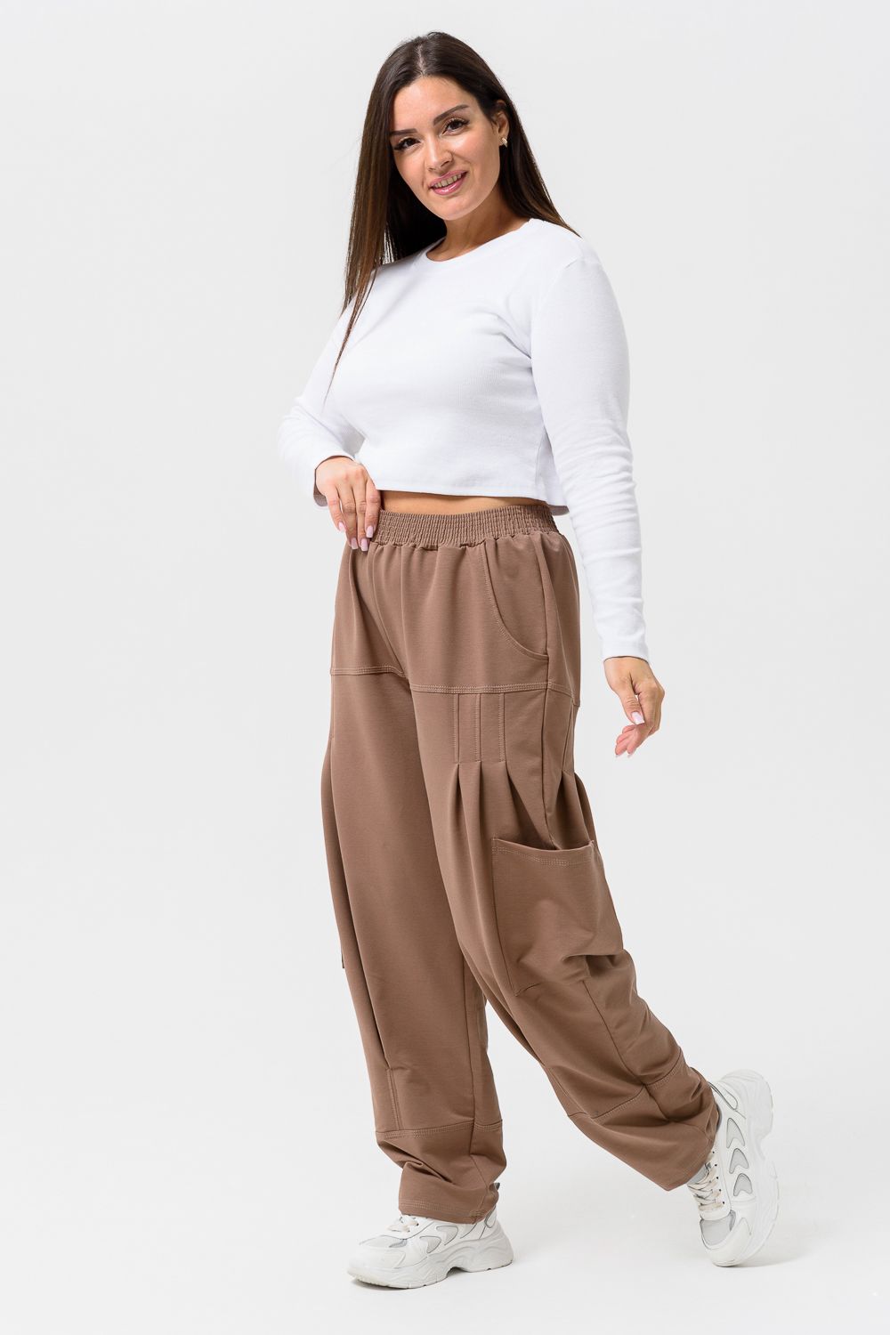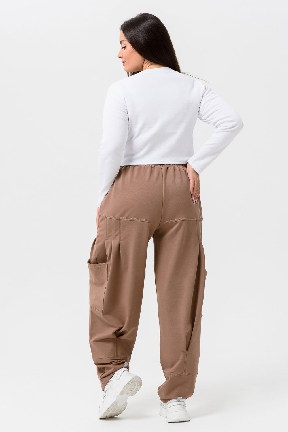 Брюки женские, "бананы". Передние и задние части брюк из трех частей. В верхней передней части брюк внутренние карманы. В средней части брюк по три вертикальные складки и по-боковому накладные карманы. Конструкция брюк позволяет скрыть любые недостатки в области бедер.