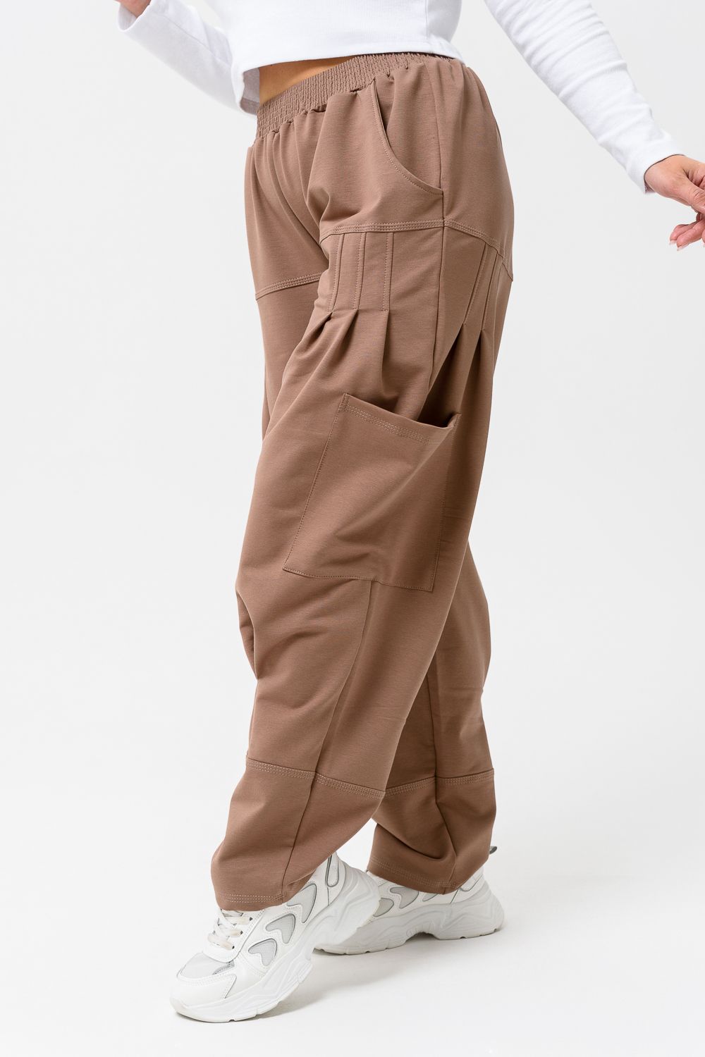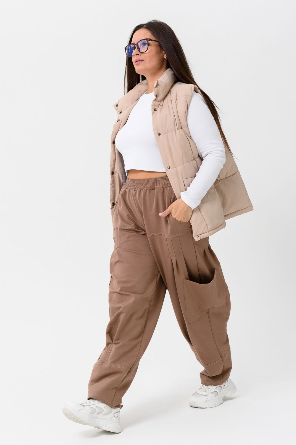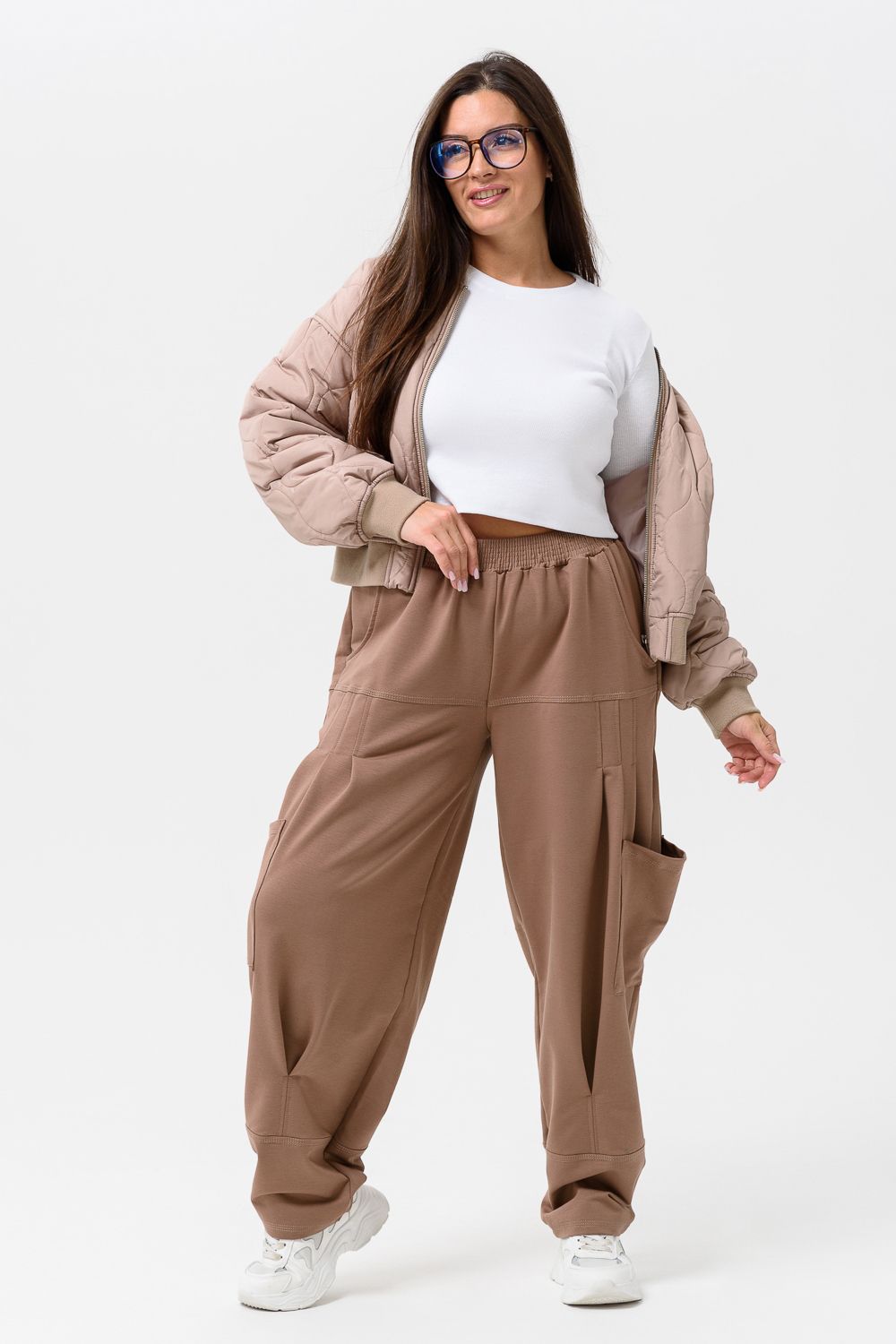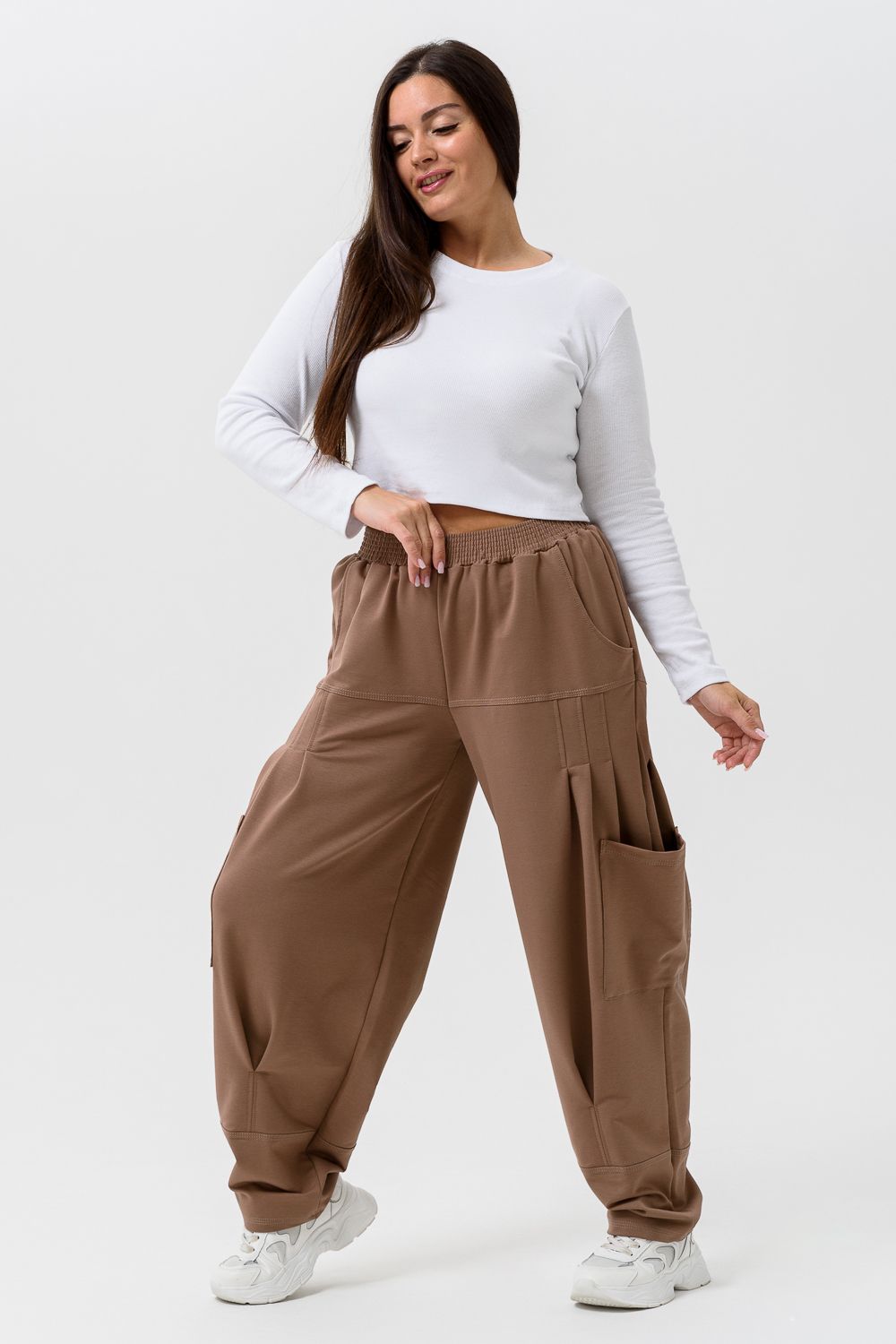Брюки женские, "бананы". Передние и задние части брюк из трех частей. В верхней передней части брюк внутренние карманы. В средней части брюк по три вертикальные складки и по-боковому накладные карманы. Конструкция брюк позволяет скрыть любые недостатки в области бедер.
