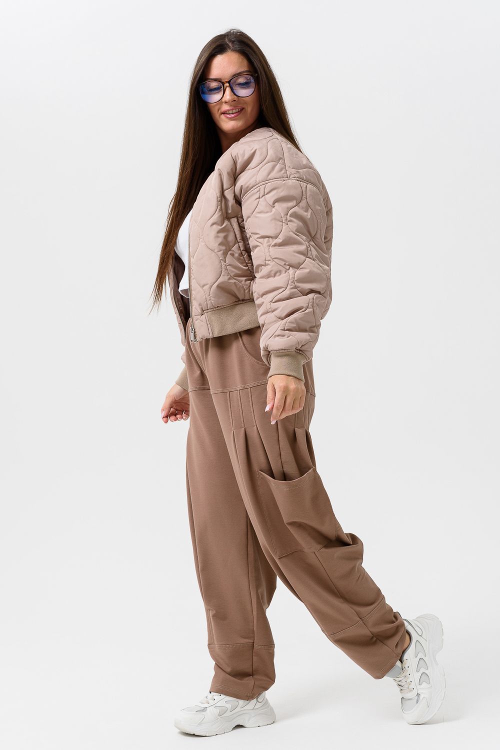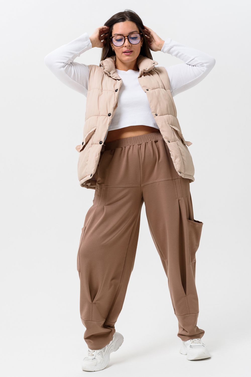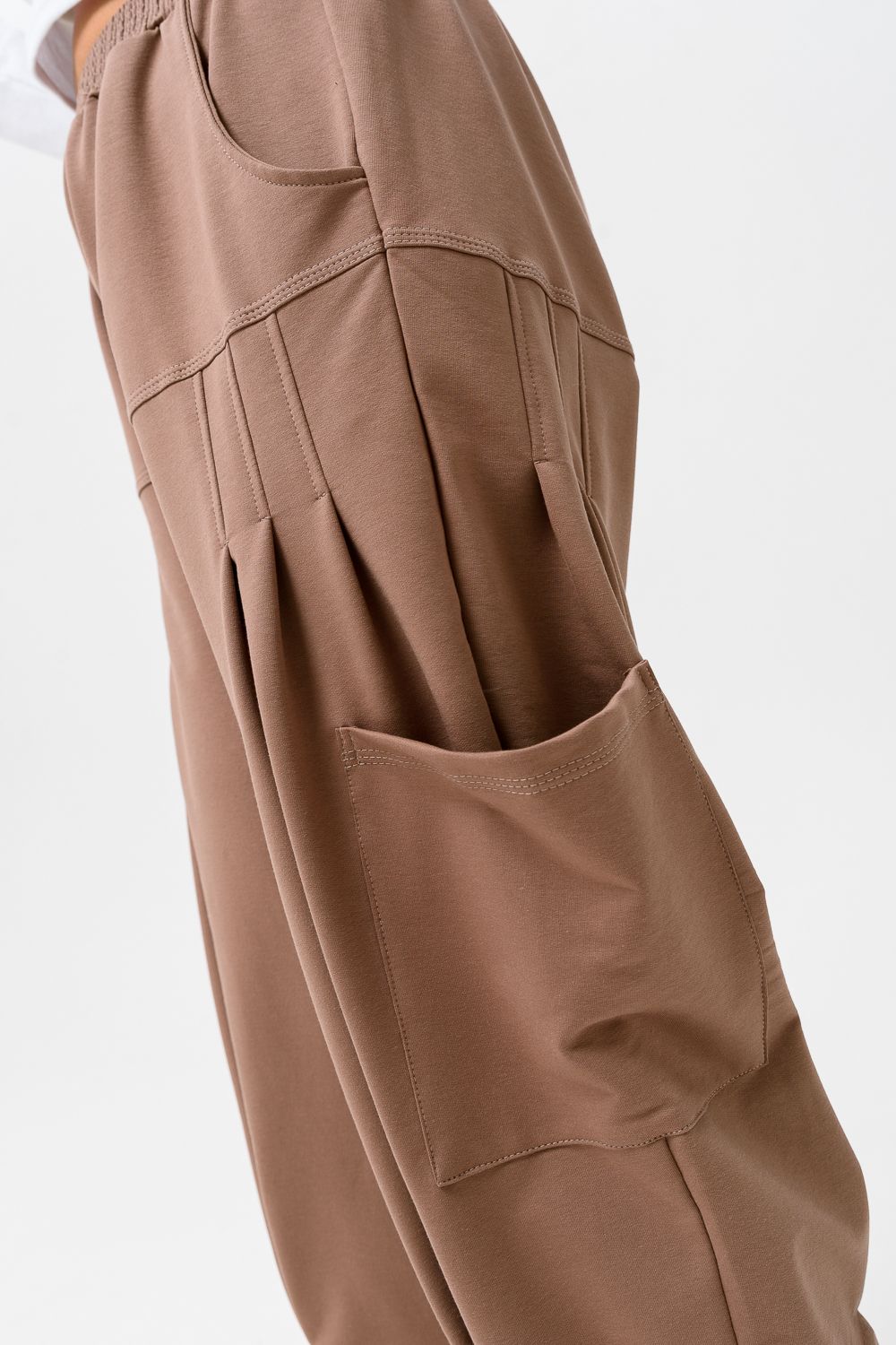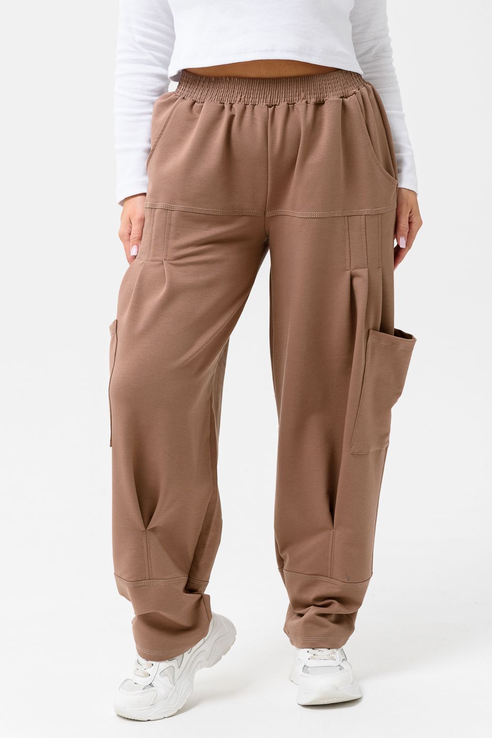 Брюки женские, "бананы". Передние и задние части брюк из трех частей. В верхней передней части брюк внутренние карманы. В средней части брюк по три вертикальные складки и по-боковому накладные карманы. Конструкция брюк позволяет скрыть любые недостатки в области бедер.