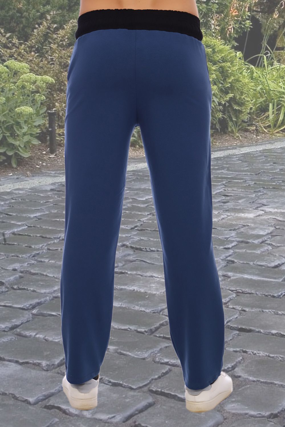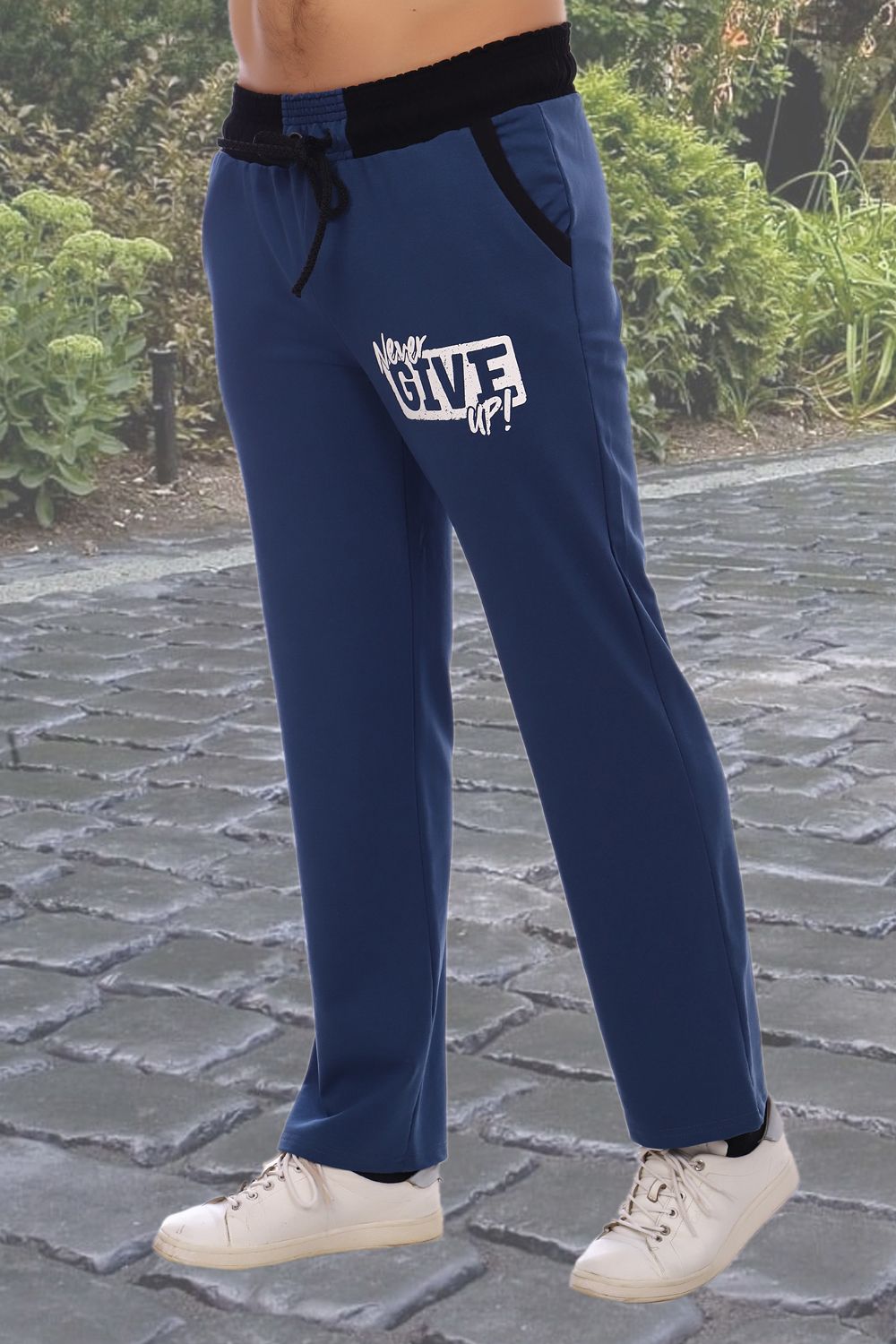 Брюки прямого кроя в стиле "casual". Карманы обработаны эластичной рибаной. На передне половинке брюк расположена контрастная печать. Пояс прошит на поясной машине. Спереди на поясе втачная планка с люверсами. Дополнительная регулировка пояса шнурком.