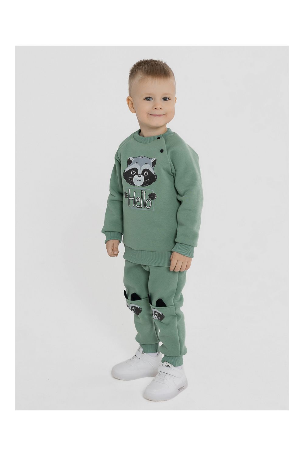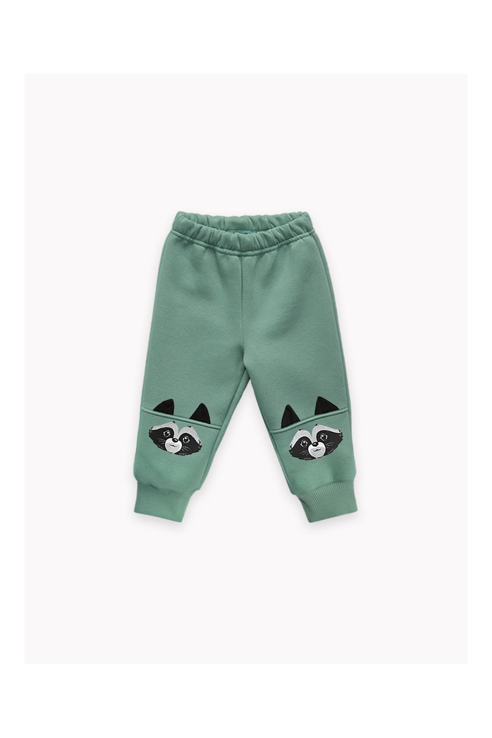 Брюки "Енот" для мальчика из мягкого футера с начёсом. Пояс на резинке, низ штанины на эластичных манжетах. Принт, нанесённый методом шелкографии.