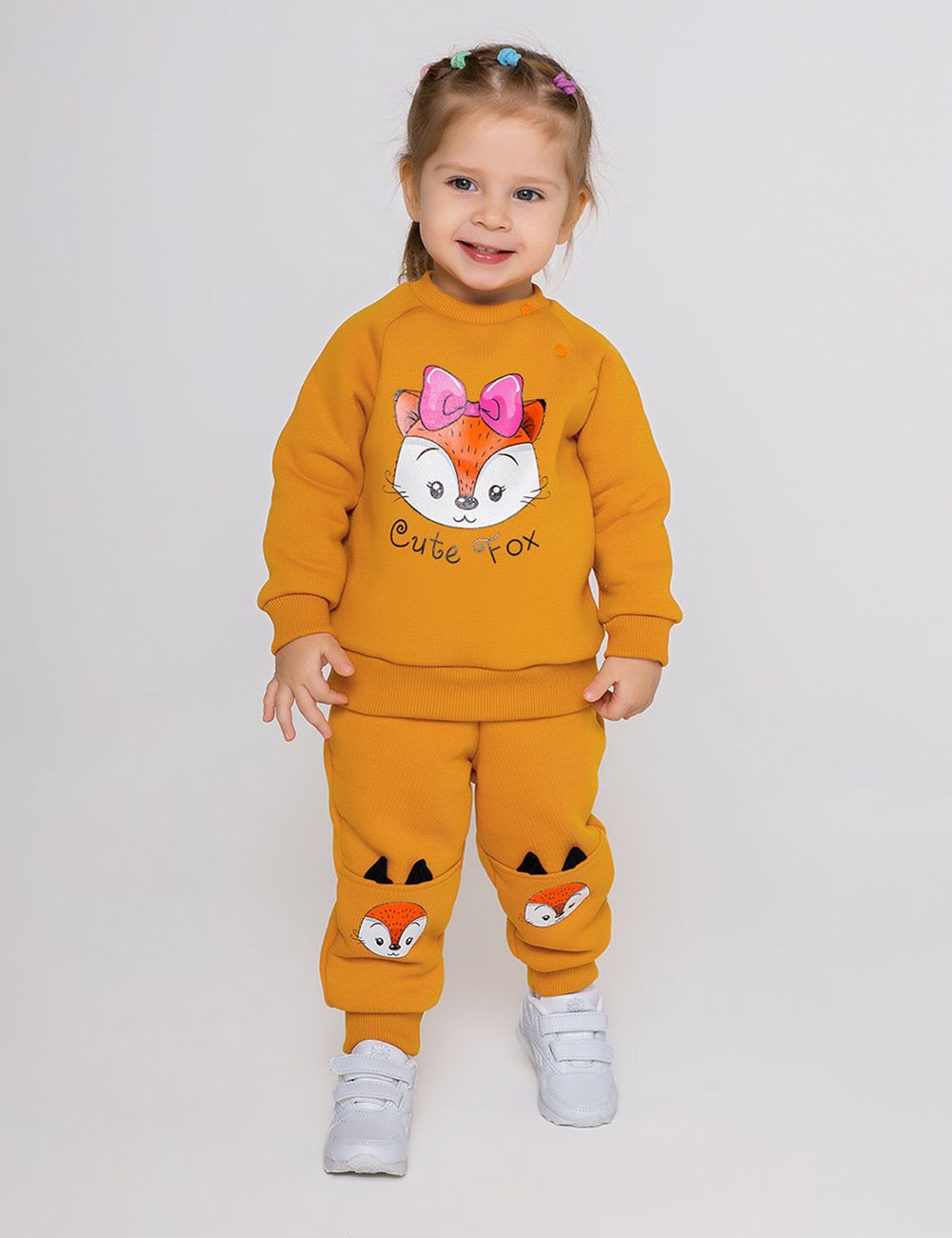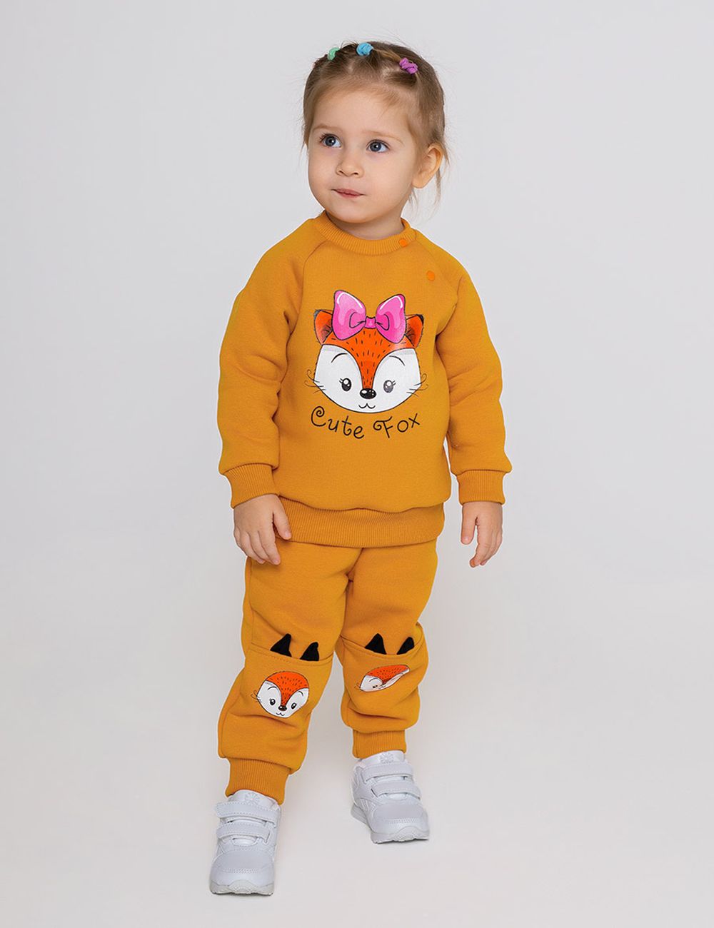 Брюки "Софи" для девочки из мягкого футера с начёсом. Пояс на резинке, низ штанины на эластичных манжетах. Принт, нанесённый методом шелкографии.