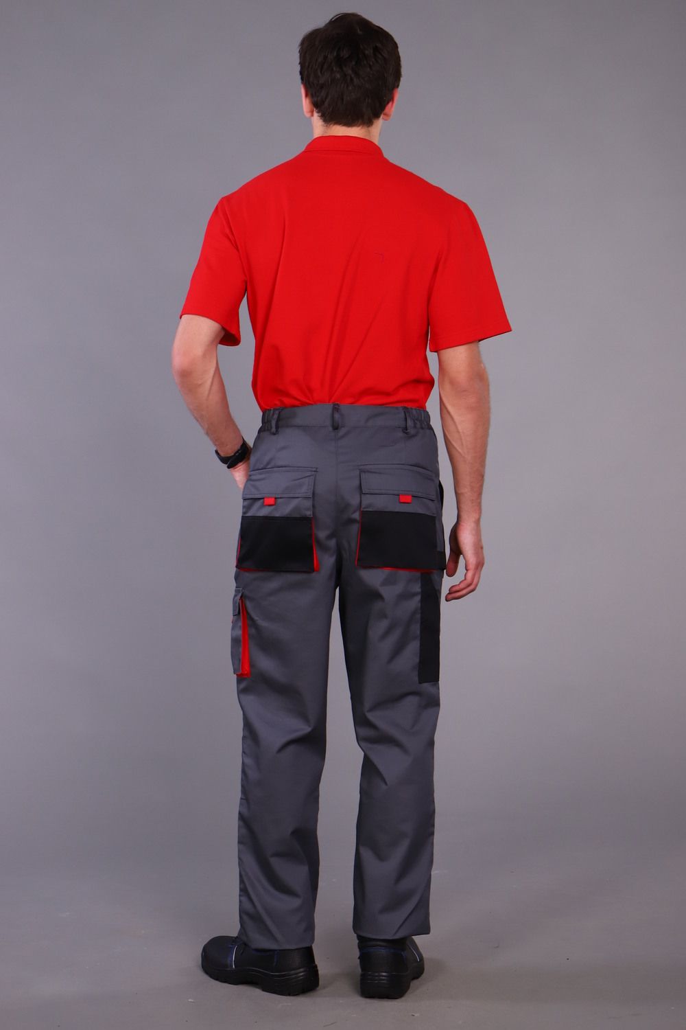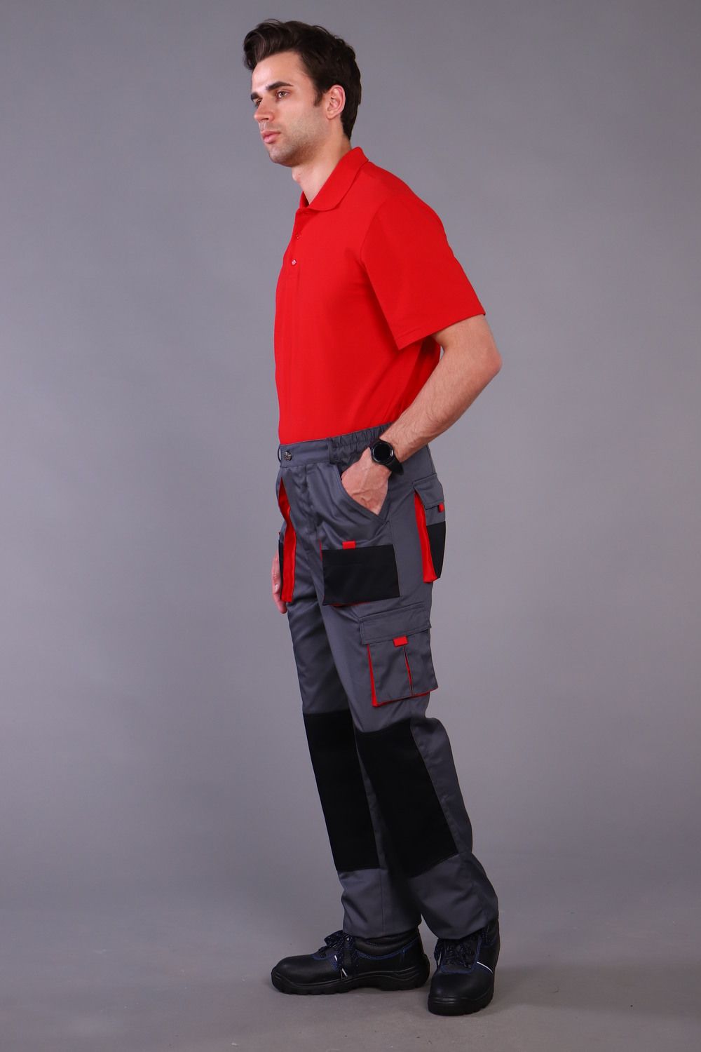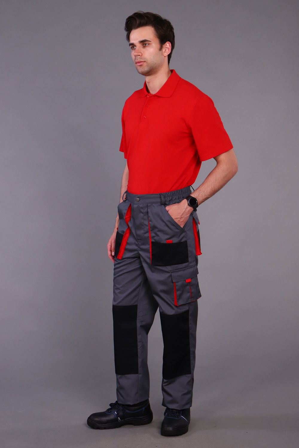 Брюки с застежкой гульфика на тесьму «молния» и притачным поясом. Передние половинки брюк с двумя боковыми накладными объемными карманами с фигурным входом, с наколенниками. Наколенники со входом для амортизационных накладок. На накладных карманах обработаны малые накладные карманы. Задние половинки с накладными объемными карманами с усилением и с клапанами. На правой задней половинке накладной карман под инструменты. Плотность ткани 240г/кв.м