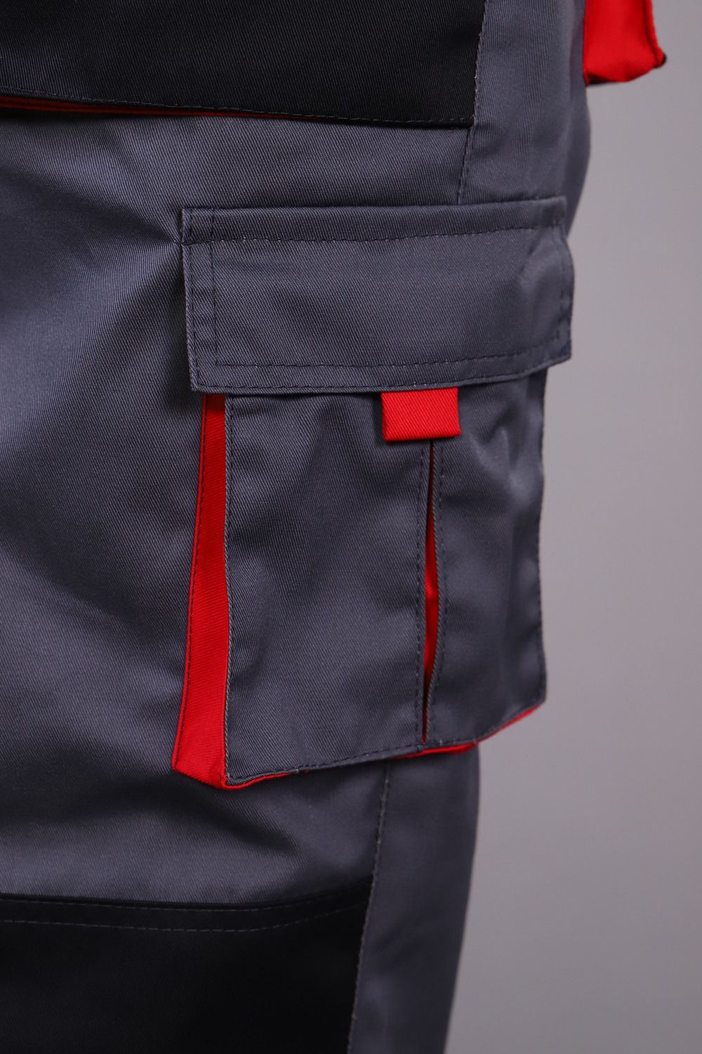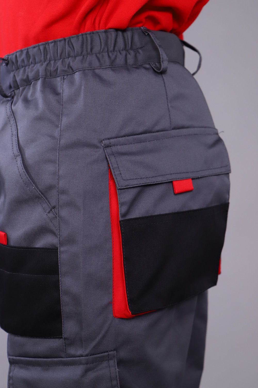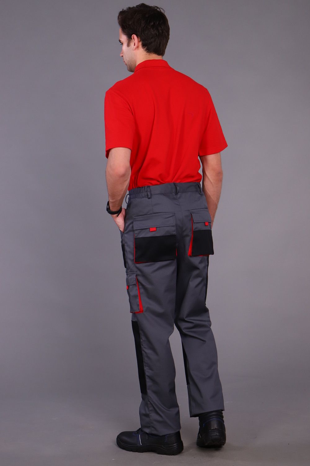 Брюки с застежкой гульфика на тесьму «молния» и притачным поясом. Передние половинки брюк с двумя боковыми накладными объемными карманами с фигурным входом, с наколенниками. Наколенники со входом для амортизационных накладок. На накладных карманах обработаны малые накладные карманы. Задние половинки с накладными объемными карманами с усилением и с клапанами. На правой задней половинке накладной карман под инструменты. Плотность ткани 240г/кв.м