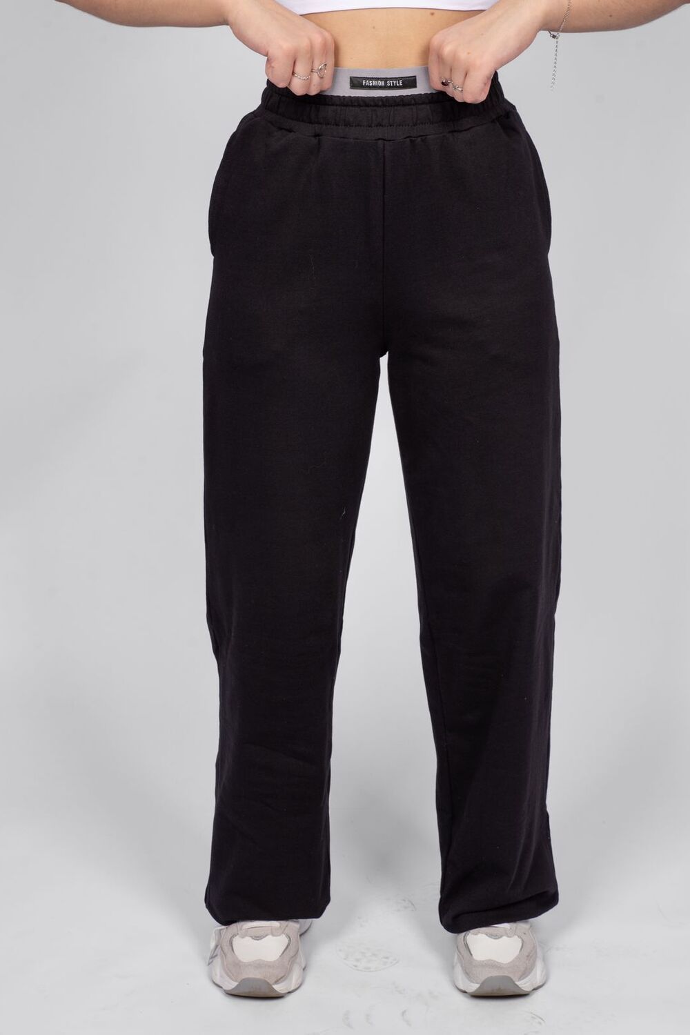 Брюки женские прямого силуэта. Пояс отрезной, выполнен из основного полотна, с эластичной тесьмой внутри. К верхнему срезу поясу притачена резинка, но выглядывает из пояса. На резинке декоративная нашивка. Надпись переводится как "Модный стиль". Модель рассчитана на рост 164-170см.