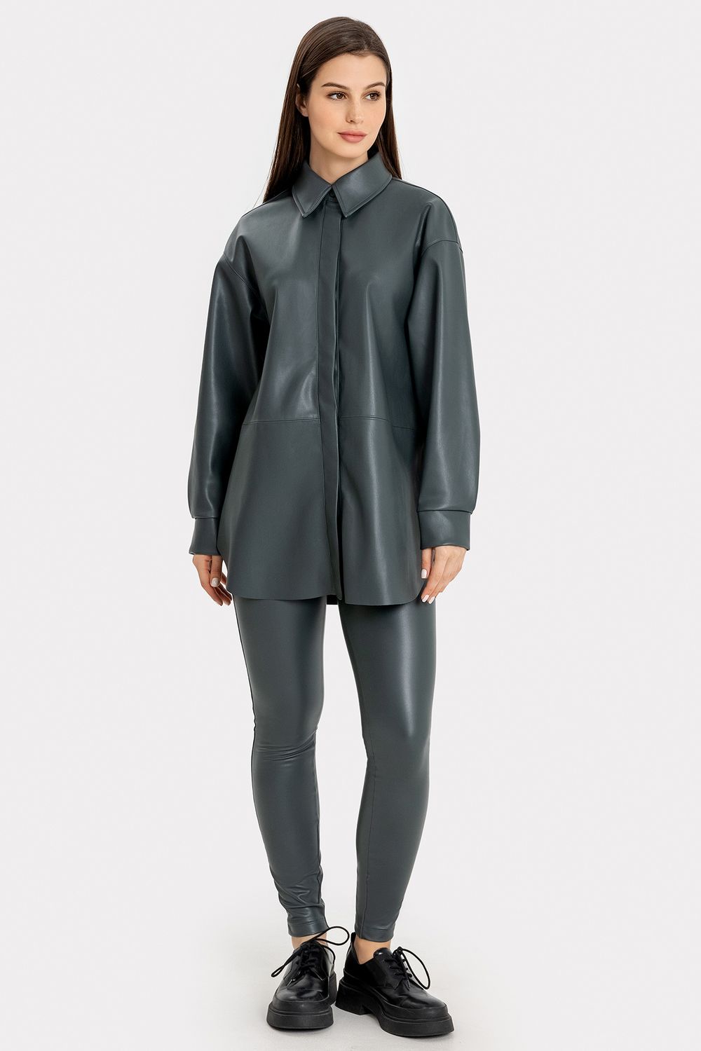 Брюки прилегающего силуэта из экокожи. Длинна классическая. Линия талии значительно завышенная. Вытачки на задней части формируют современный крой. На уровне колена – вертикальный шов. Пояс на жаккардовой эластичной резинке. Идеально впишутся в любой образ!