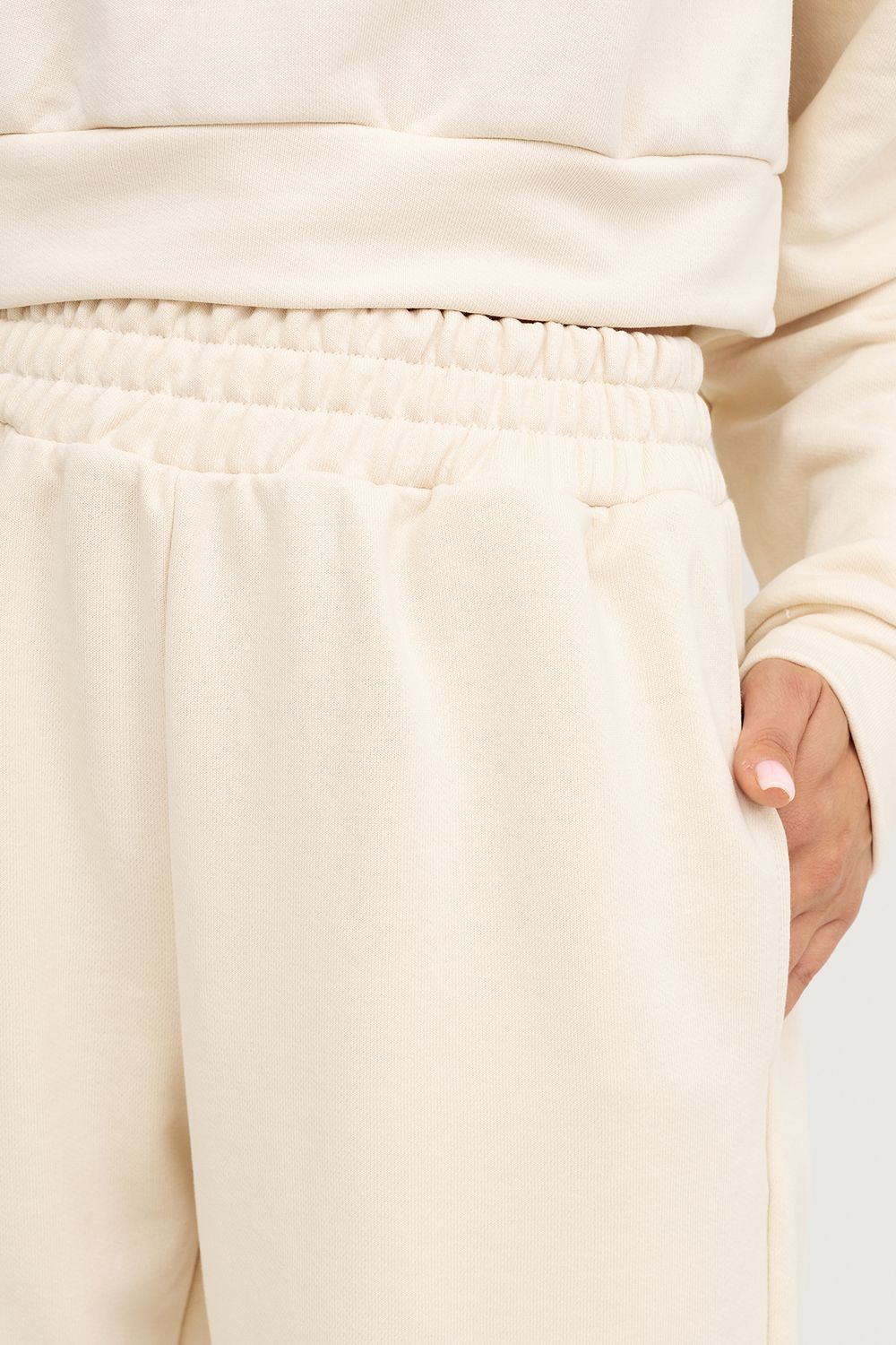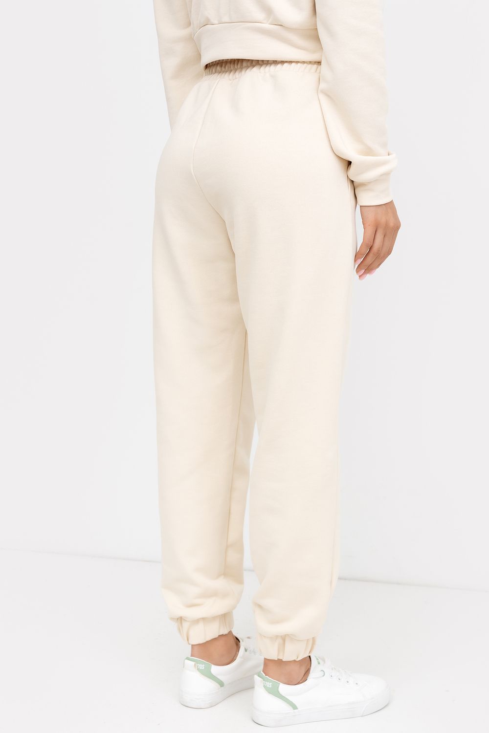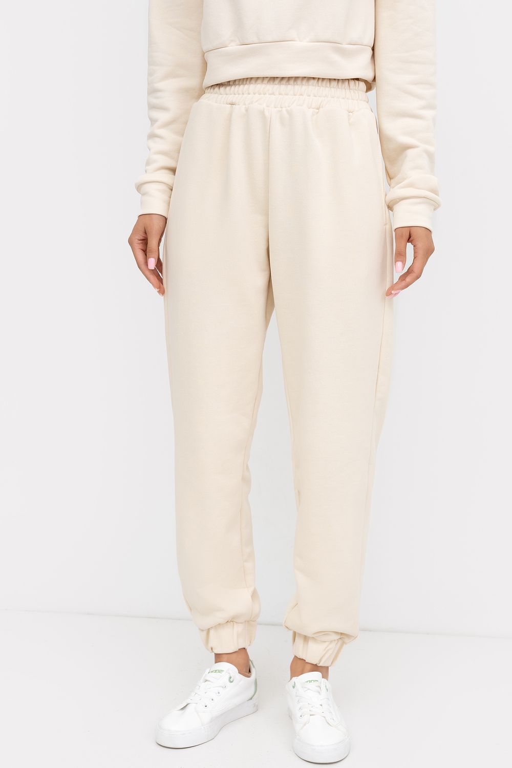 Женские брюки-джоггеры из легкого трикотажного футера без подчеса. Силуэт свободный, максимально расслабленный. Есть удобные боковые карманы. Пояс с эластичной тесьмой внутри. Брюки завершаются манжетами с эластичной тесьмой внутри. Стильные брюки для модных городских образов!