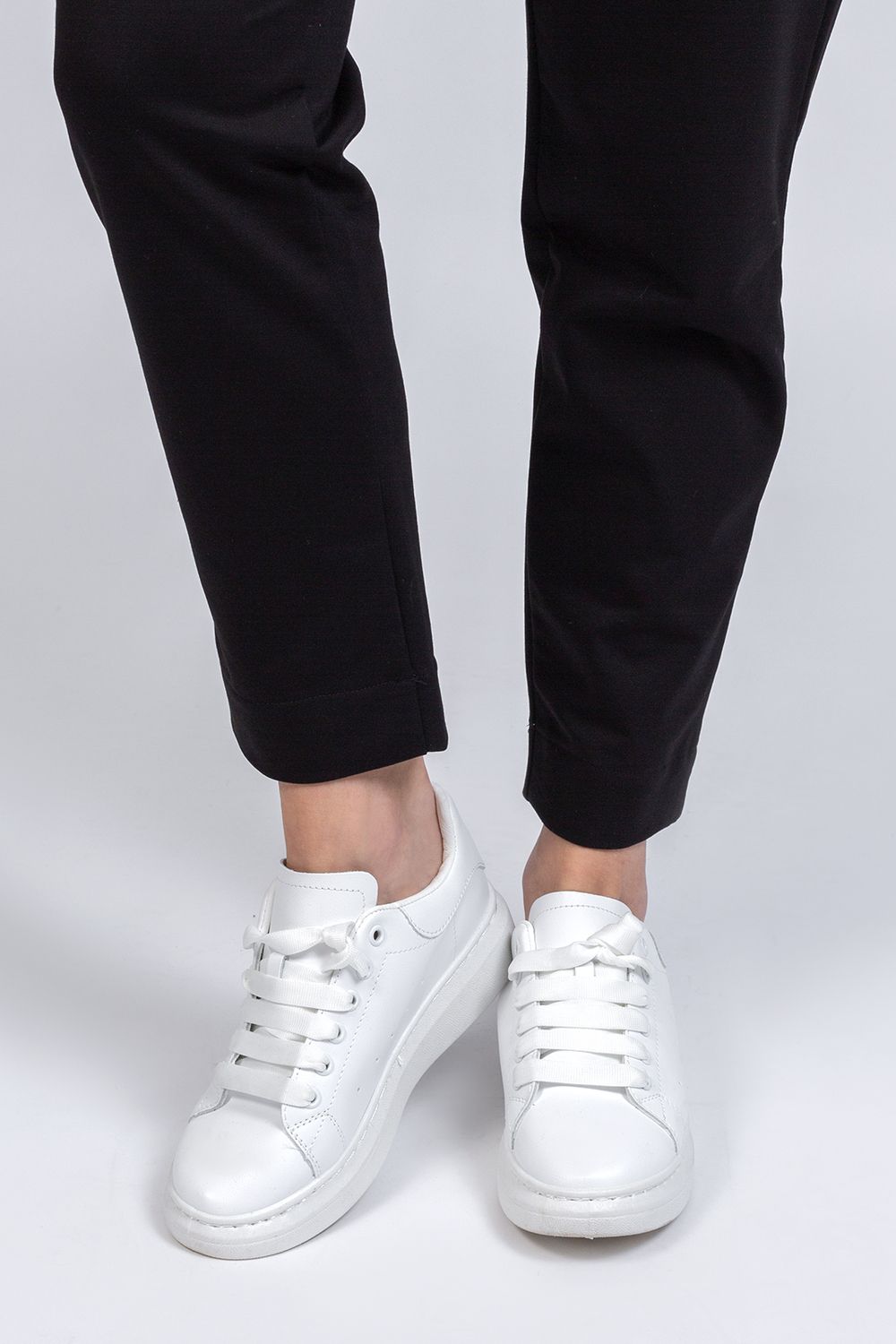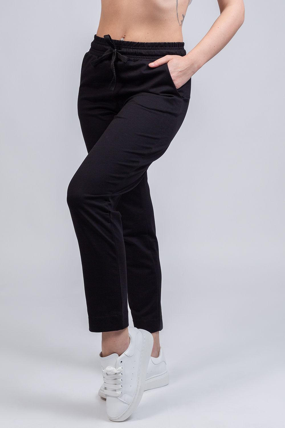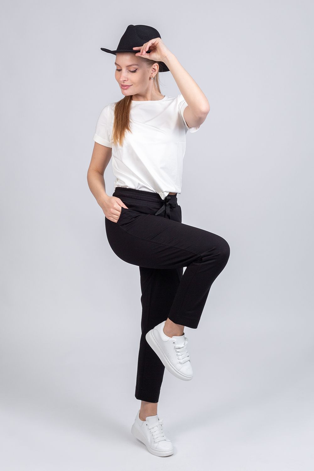 Женские брюки прямого кроя, внизу декоративный шов, пояс на резинке с регулируемым шнурком. По бокам два кармана с отрезным бочком. Отлично подойдут для прогулок и для занятий спортом.