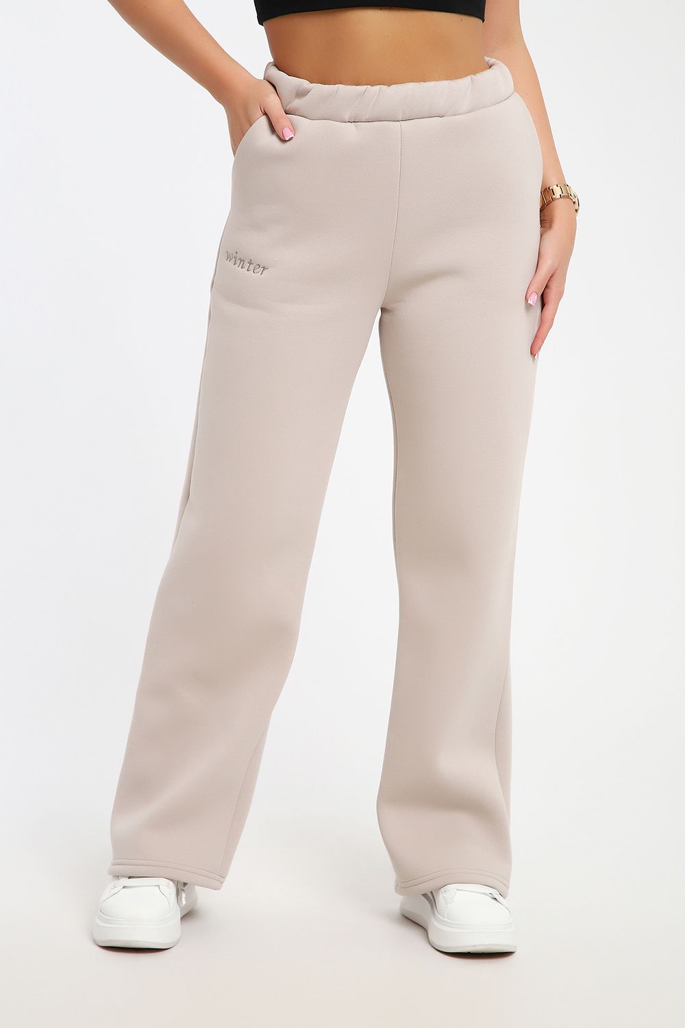 Брюки женские тёплые из футера 3-х нитки начёс, высокого качества компакт пенье. Брюки- трубы на притачном поясе, в боковых швах удобные карманы . Стильные, комфортные брюки декорированы вышивкой, расположенной слева чуть ниже кармана. Плотная ткань согреет в холодное время года, и при этом, образ останется легким и эстетичным. Брюки с высокой посадкой отлично подойдут для осенних и зимних прогулок, а также для повседневного использования. Благодаря анатомическому крою брюки не сковывают движений, сочетают в себе комфорт и модные тенденции. Модель представлена в широком размерном ряде до 56 размера.