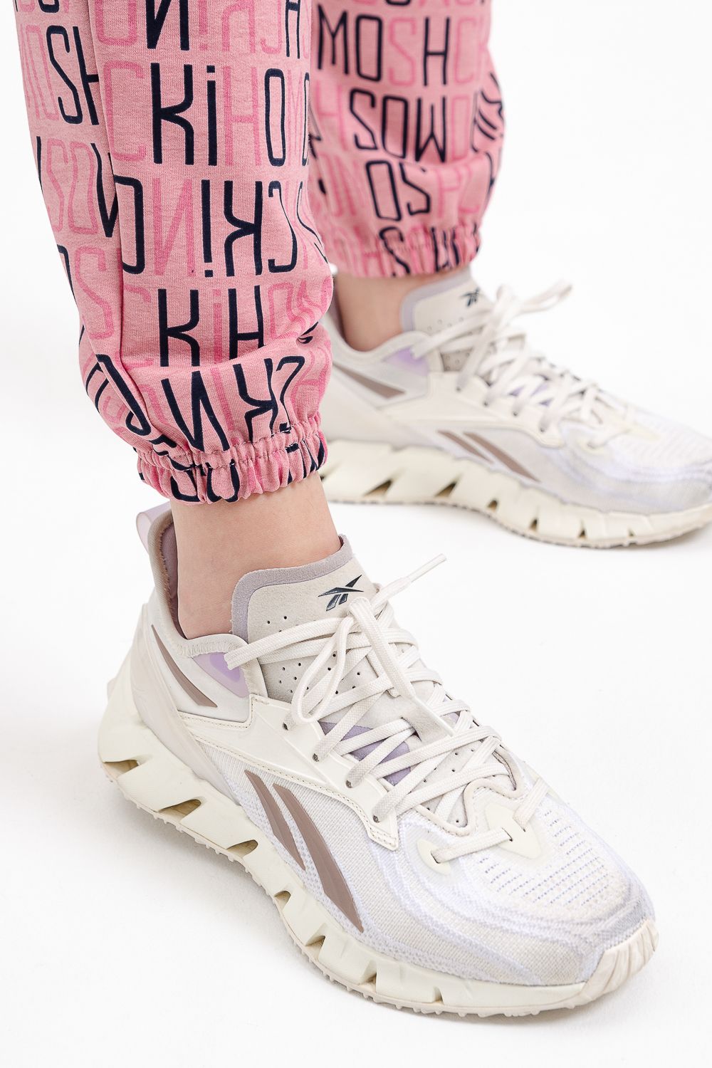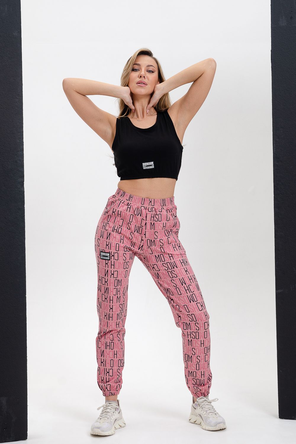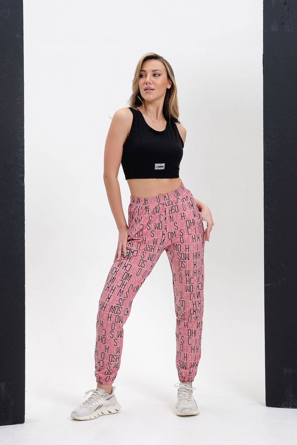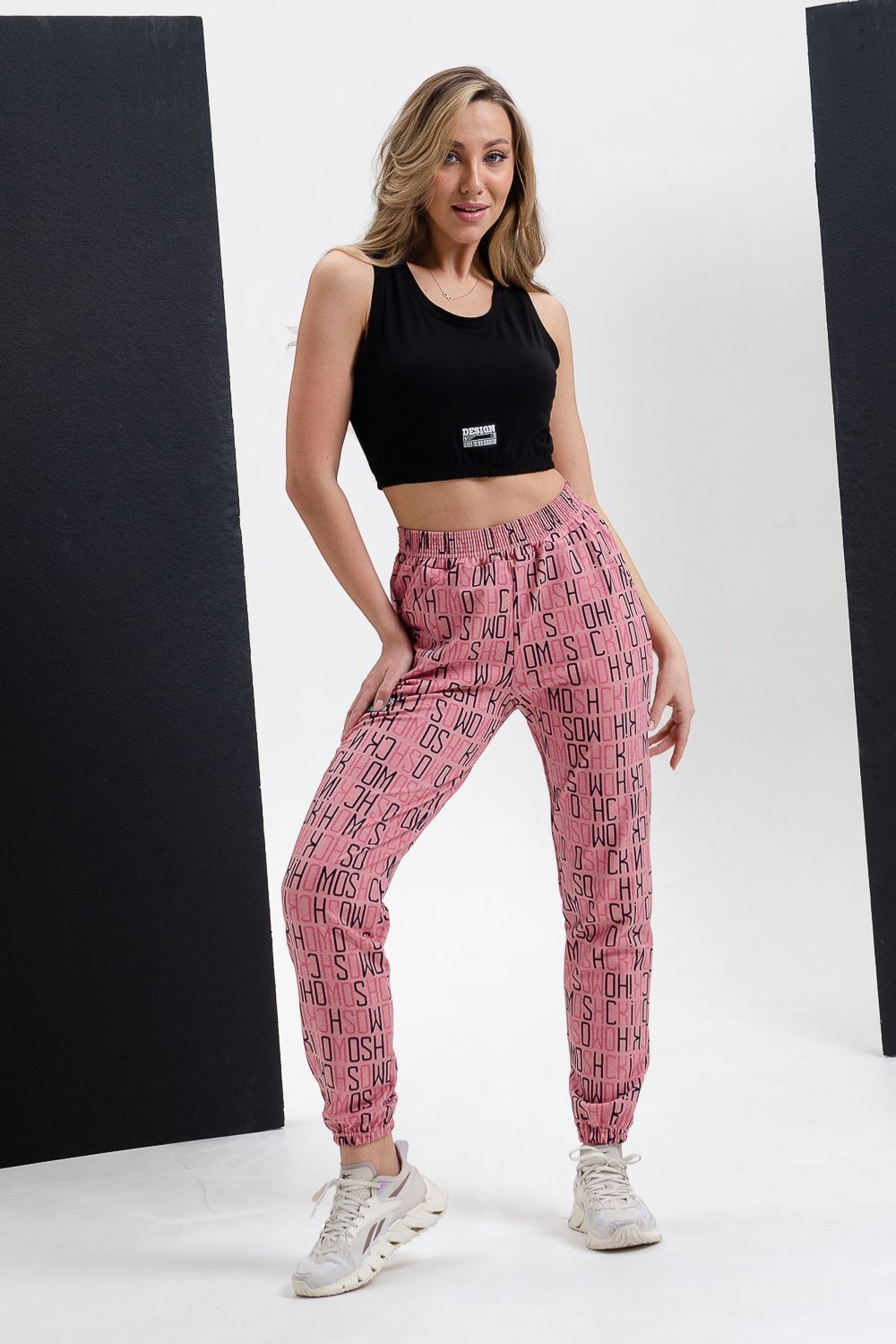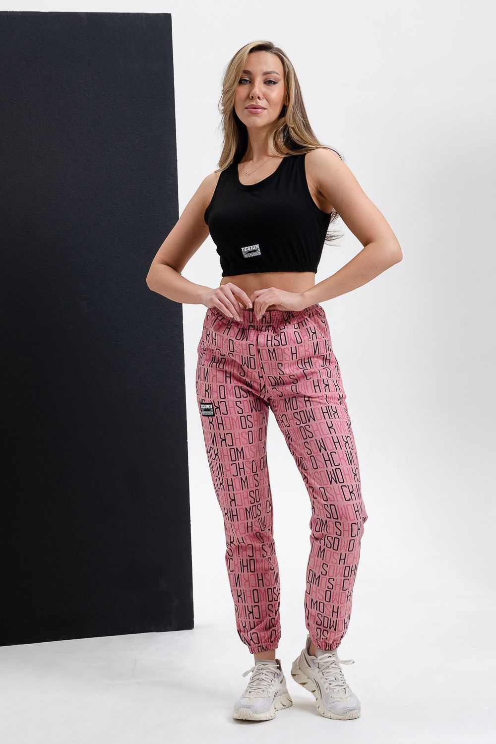 Брюки на поясе, с боковыми карманами, с резинкой по низу брюк.