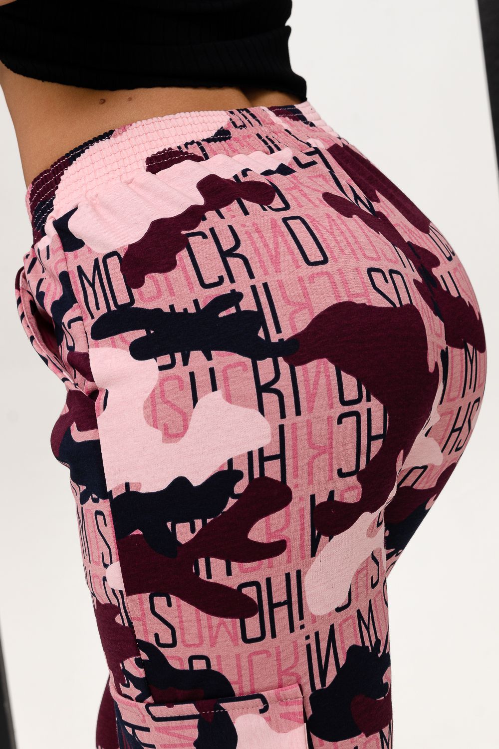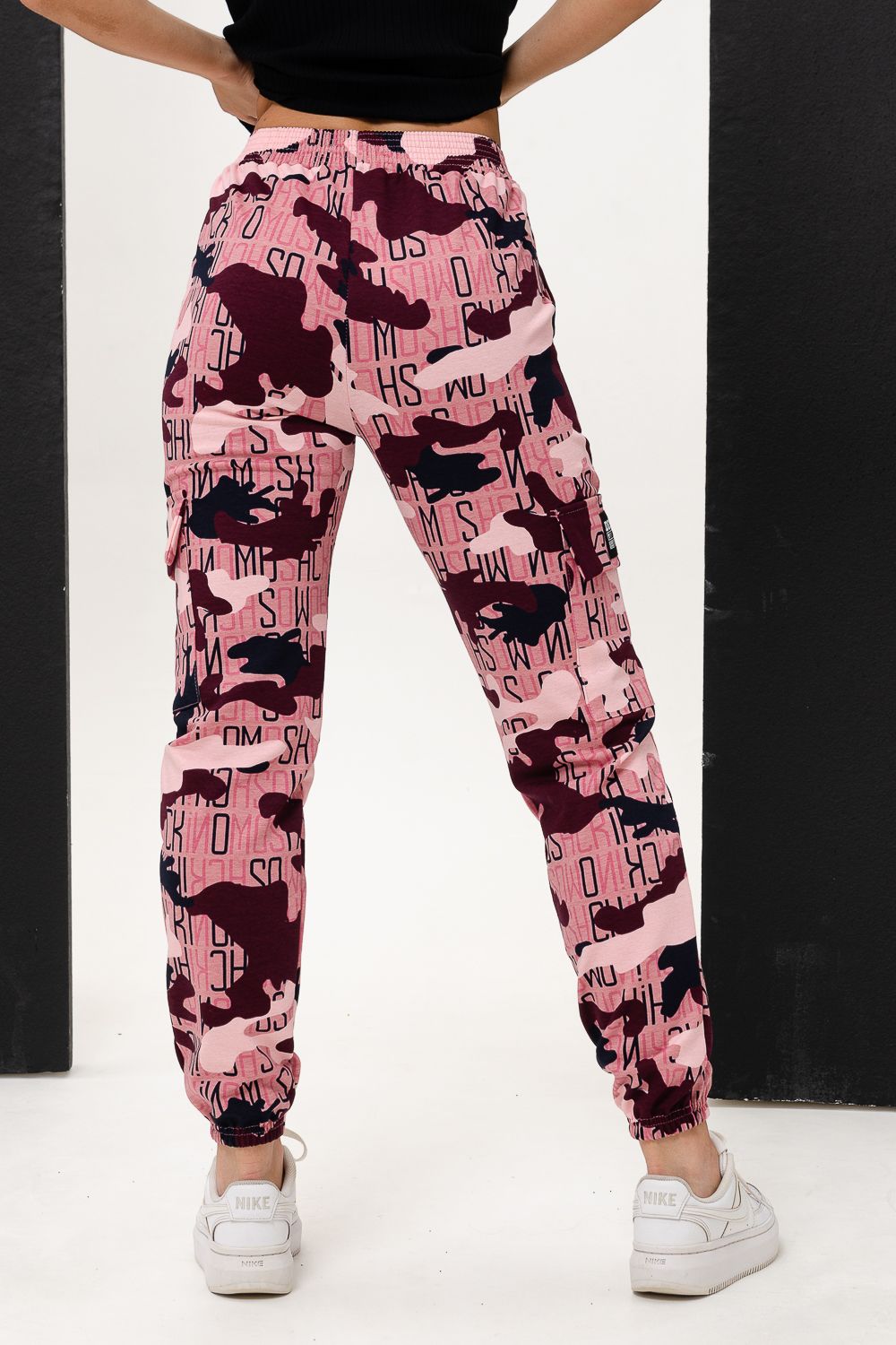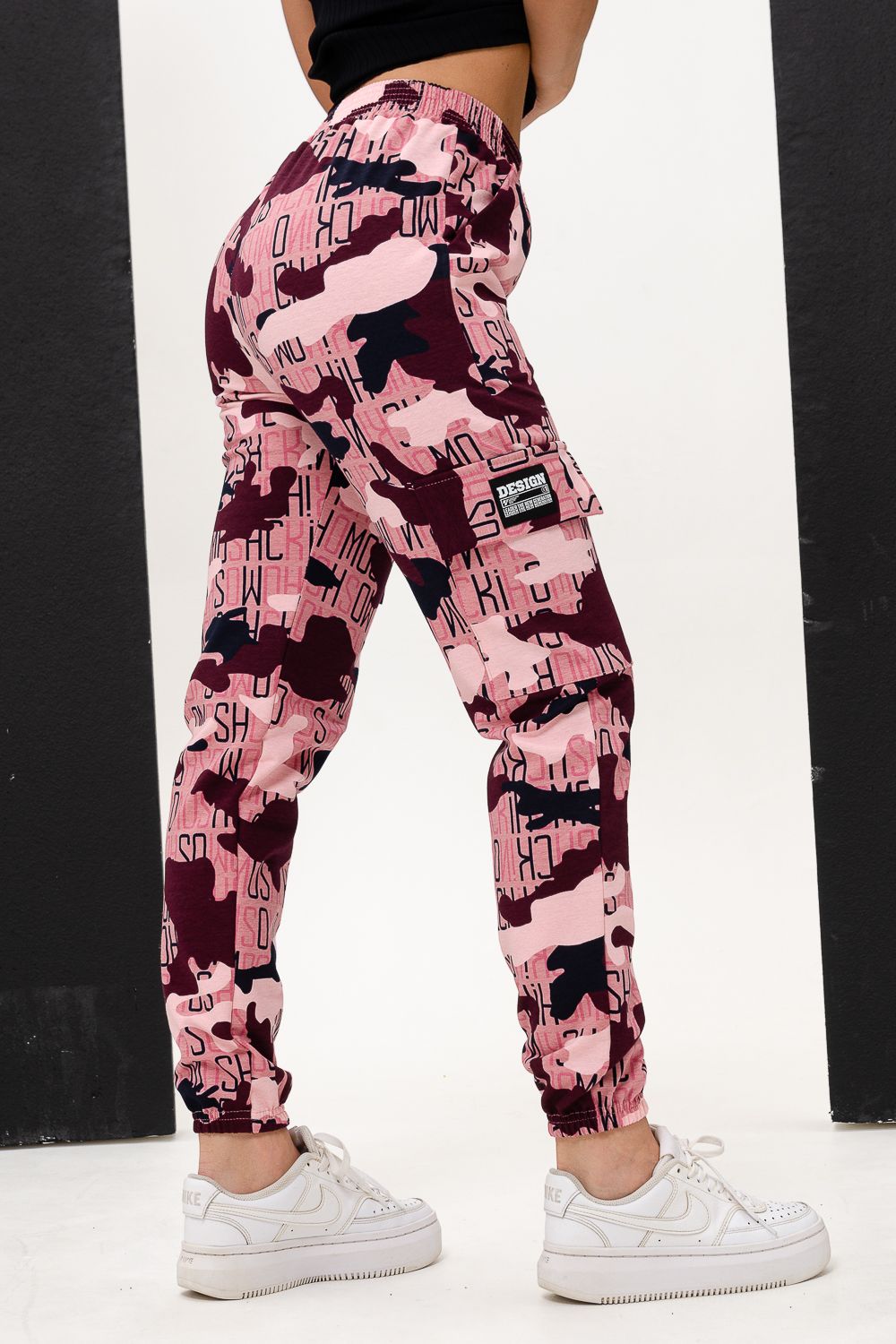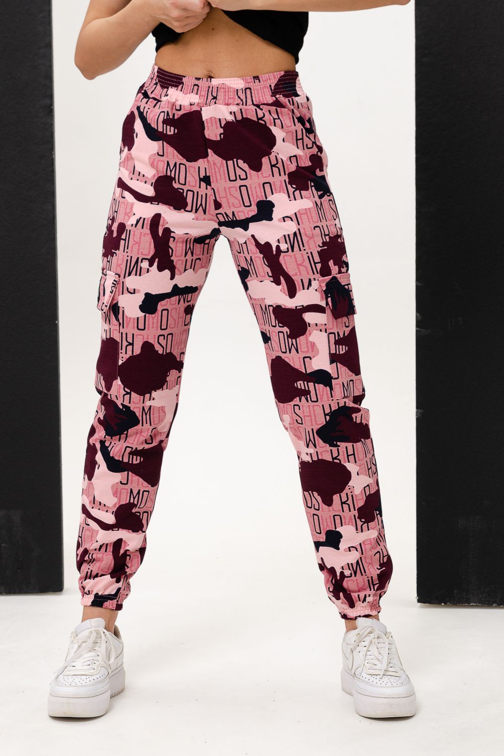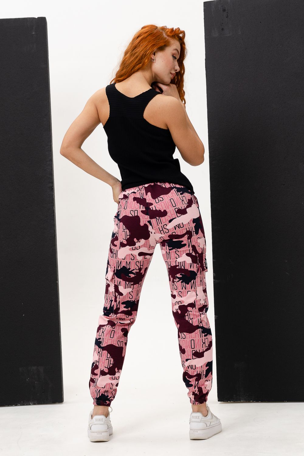 Брюки на поясе, с боковыми карманами вверху, накладными карманами с клапаном по бокам, внизу на резинке.