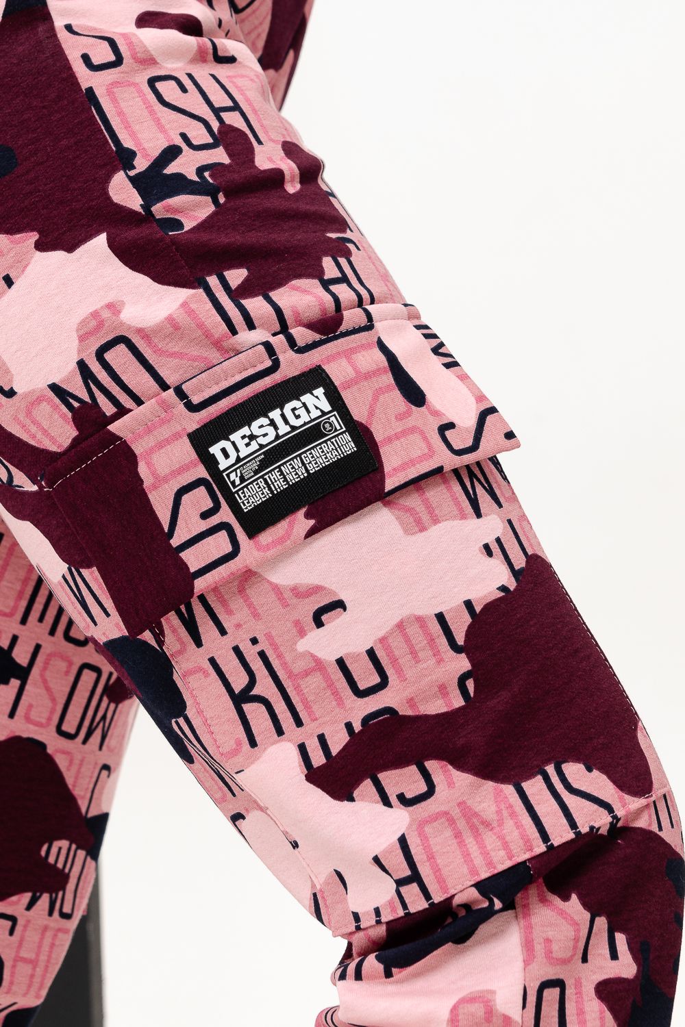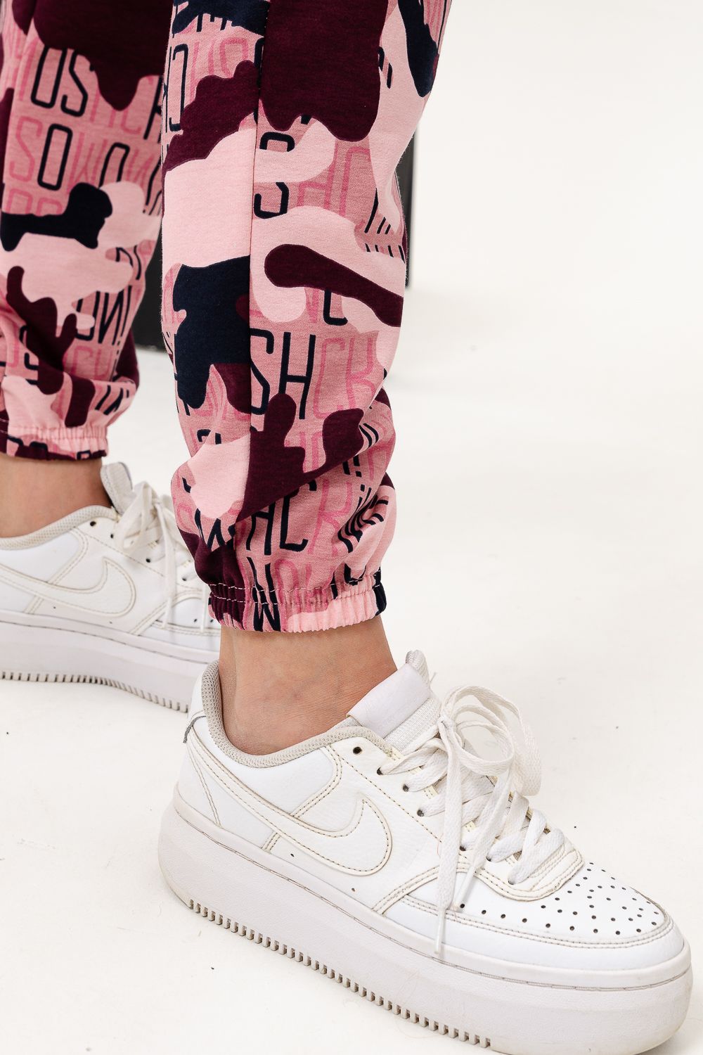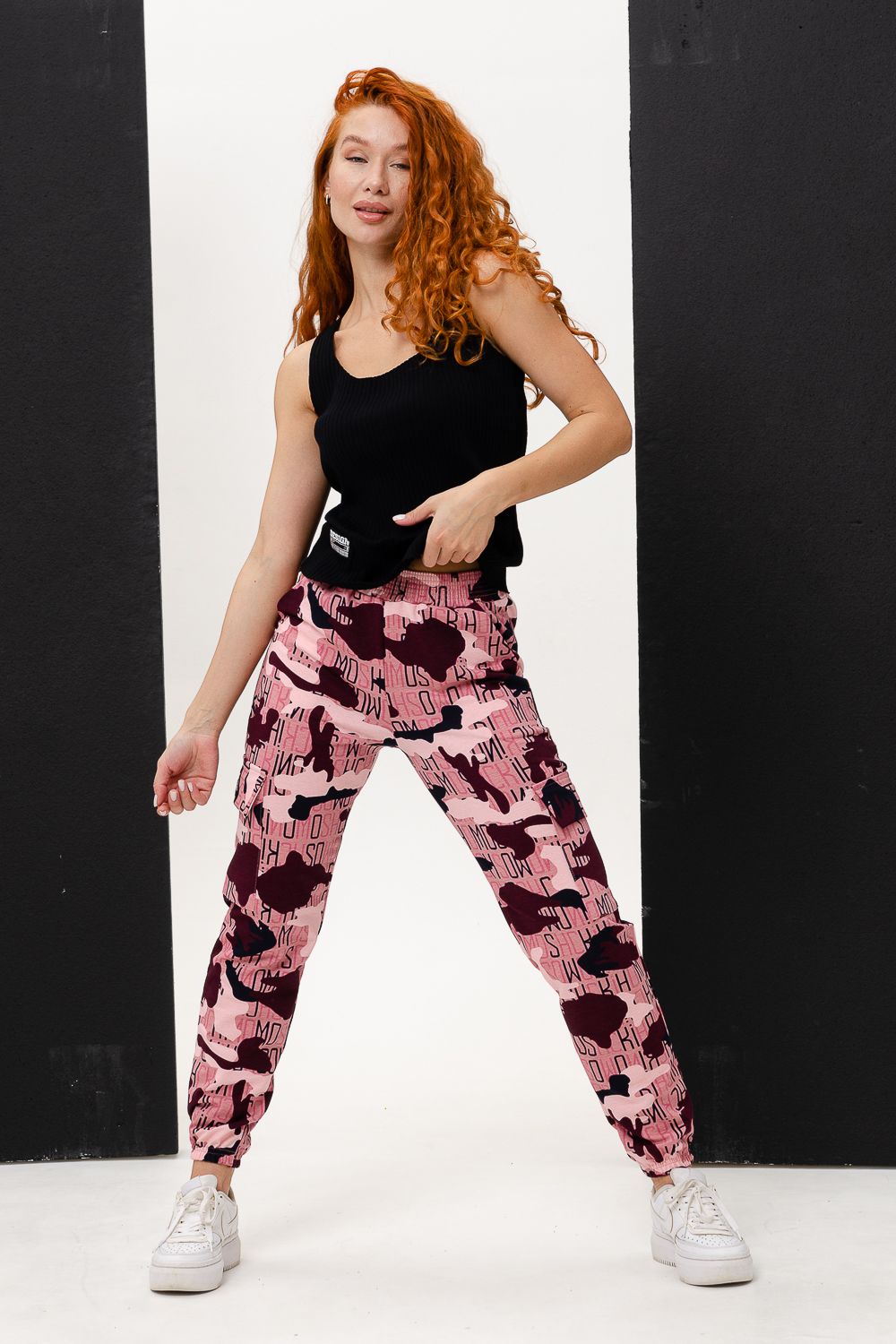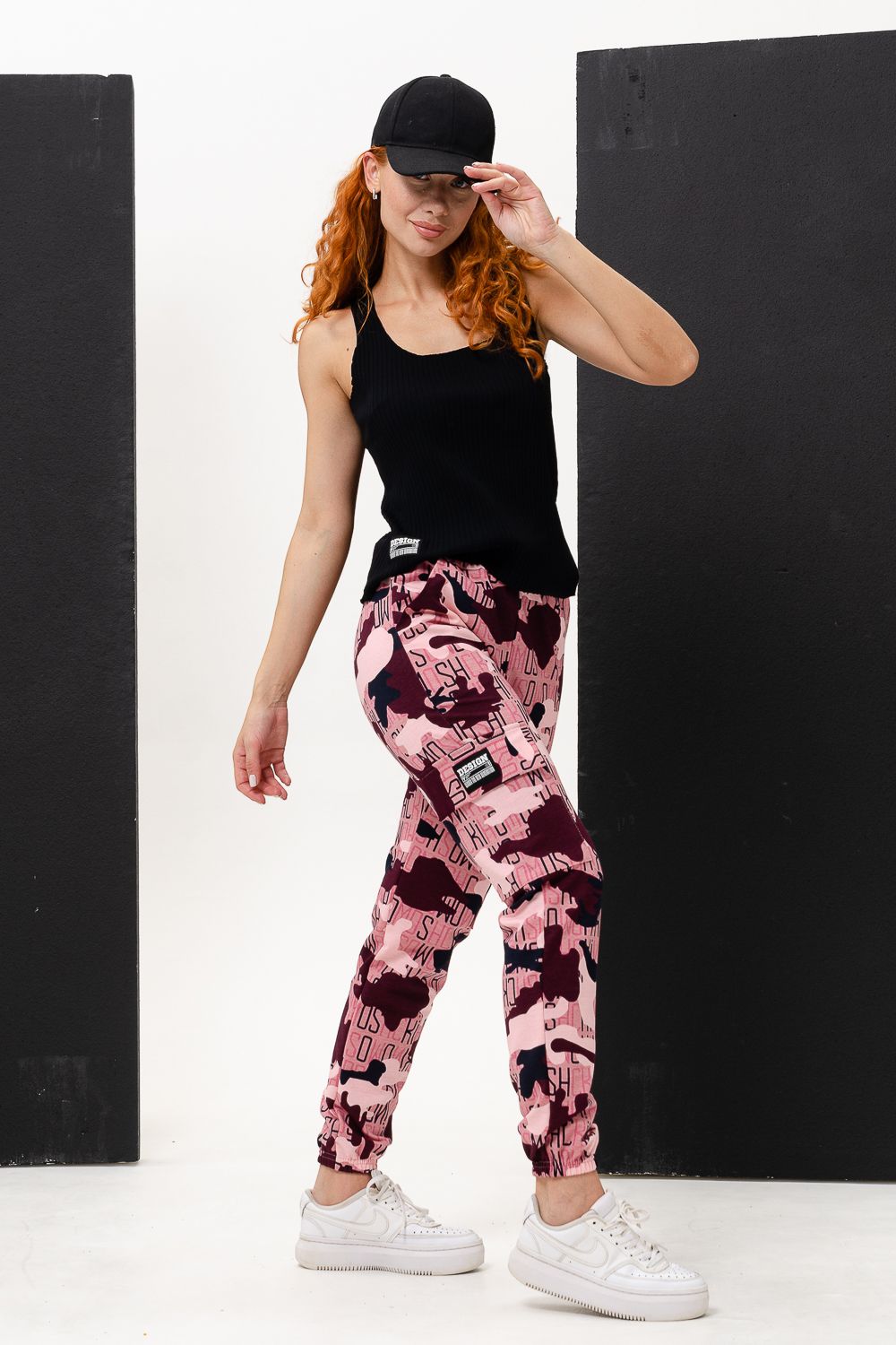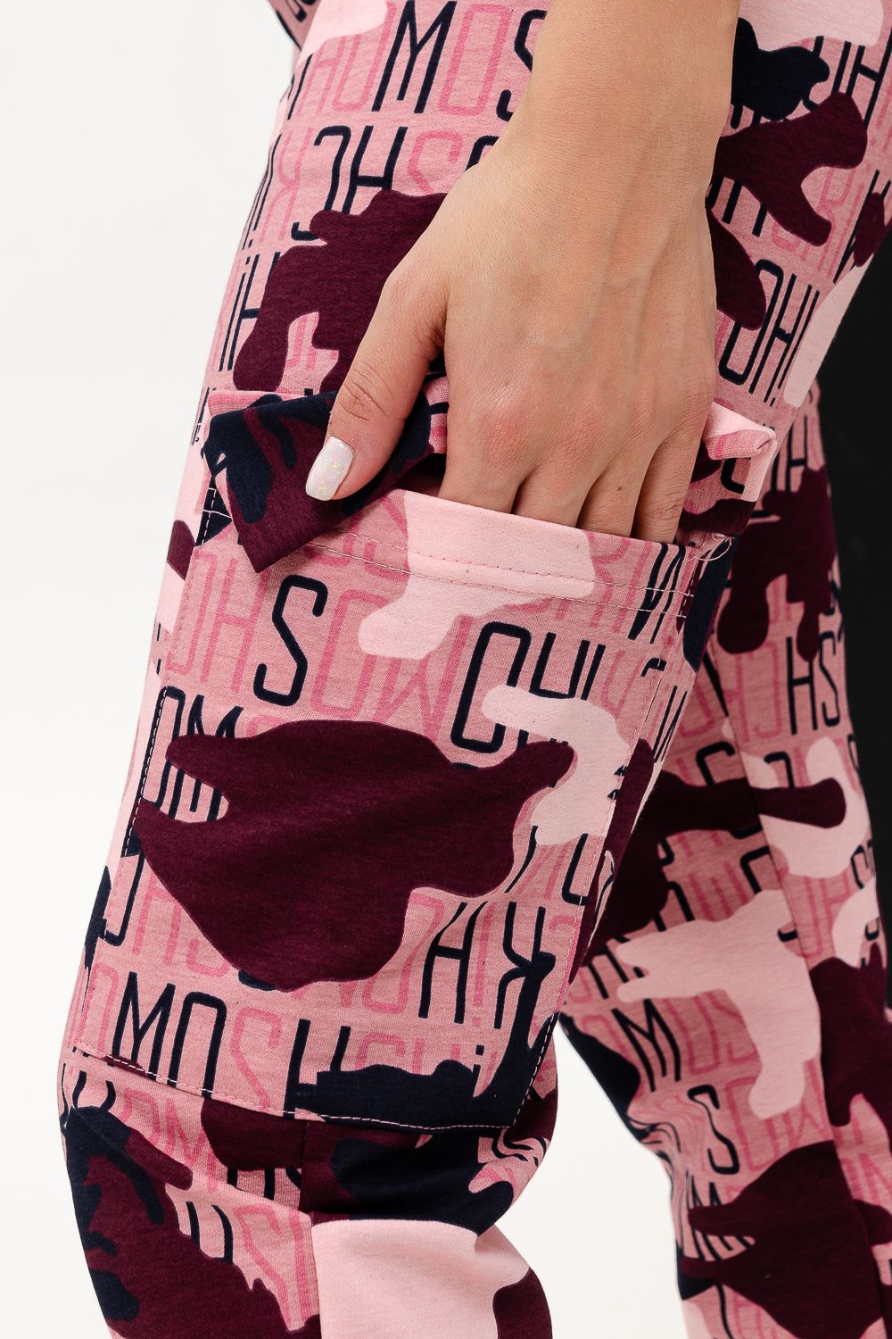 Брюки на поясе, с боковыми карманами вверху, накладными карманами с клапаном по бокам, внизу на резинке.