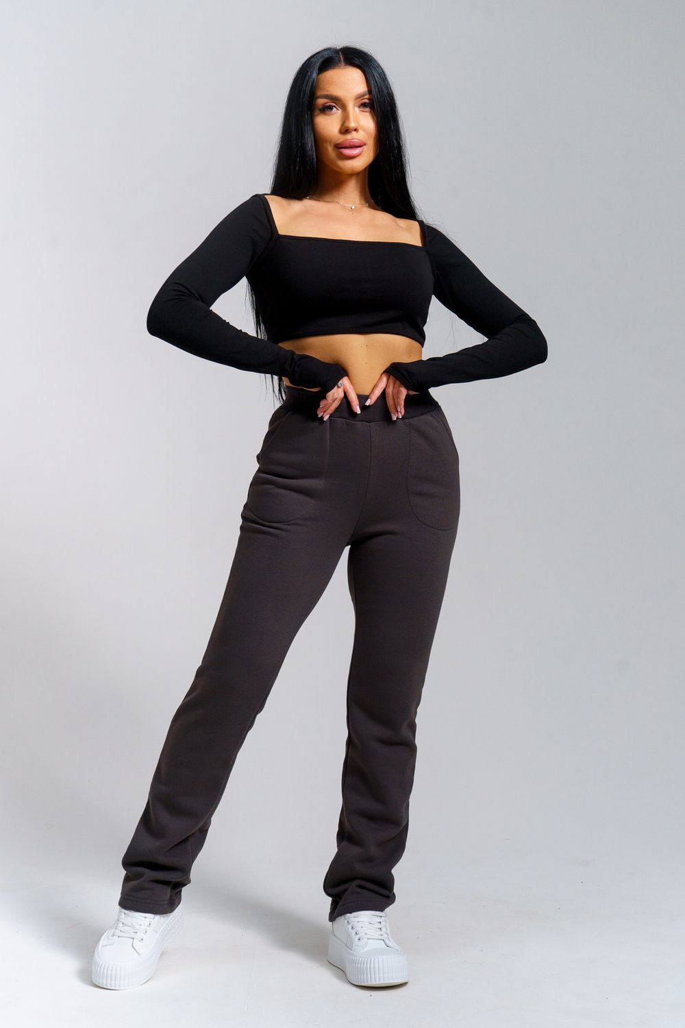 Брюки женские прямого силуэта с карманами из футерного полотна с начесом. Пояс из кашкорсе в цвет основной ткани отстрочен вместе с резинкой.