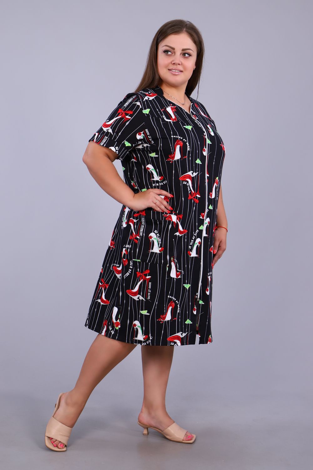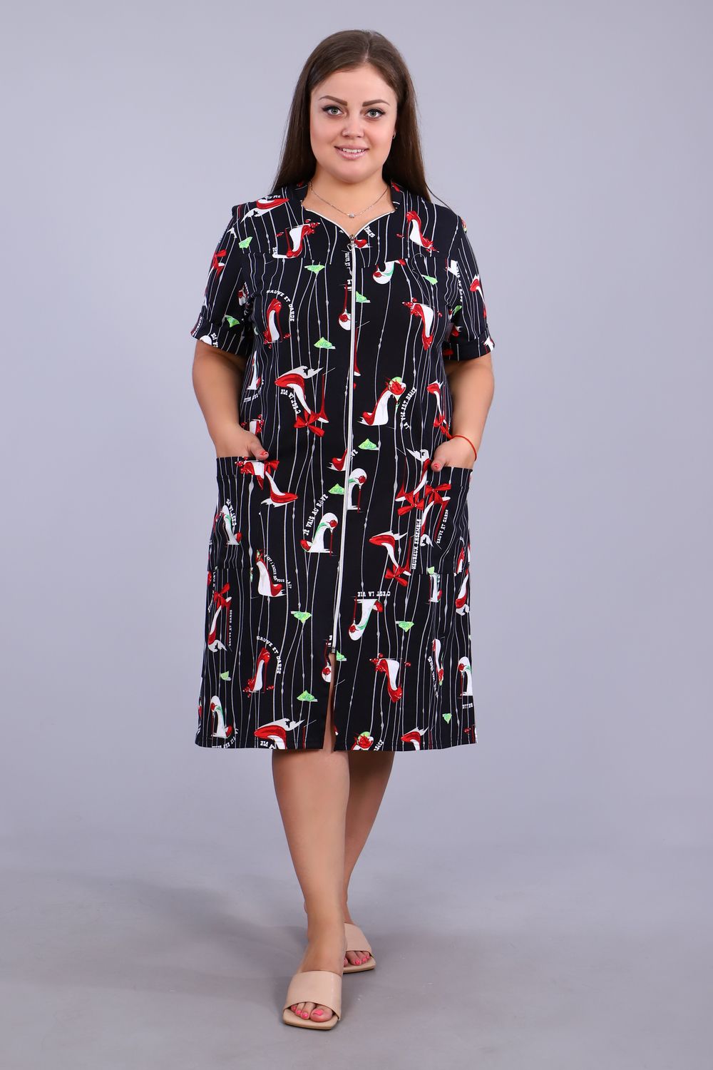 Халат женский на молнии с коротким рукавом. Данная модель выполнена из трикотажного полотна кулирка (хлопок 100%). Горловина фигурная со стойкой, на полочке по бокам присутствуют накладные карманы. На рукавах пришиты манжеты. Отличная модель порадует вас своей изящностью и комфортом.