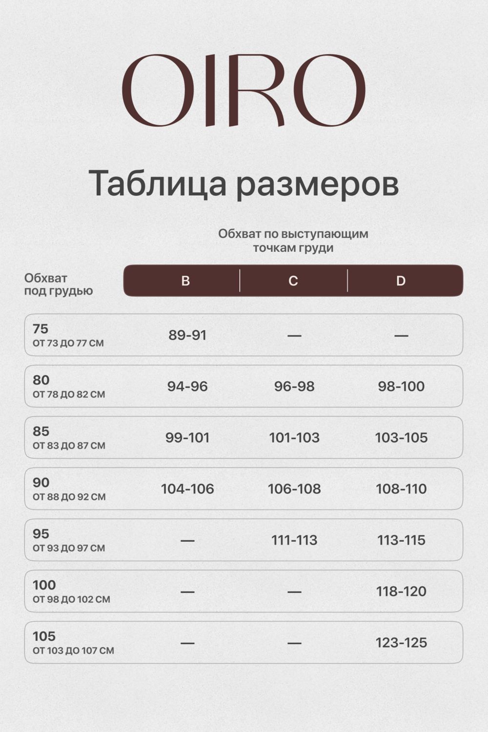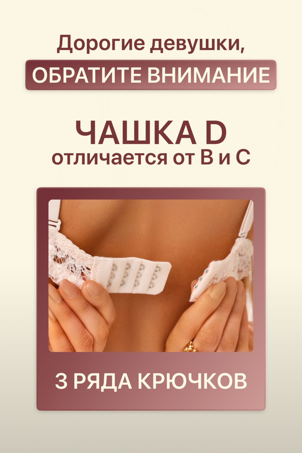 Размер чаши B имеет поддерживающий (анатомический) пуш ап, чаша C с пуш ап и D без пуш ап. Узор на чаше бюстгальтера может отличаться у размера D, на модели размер С.