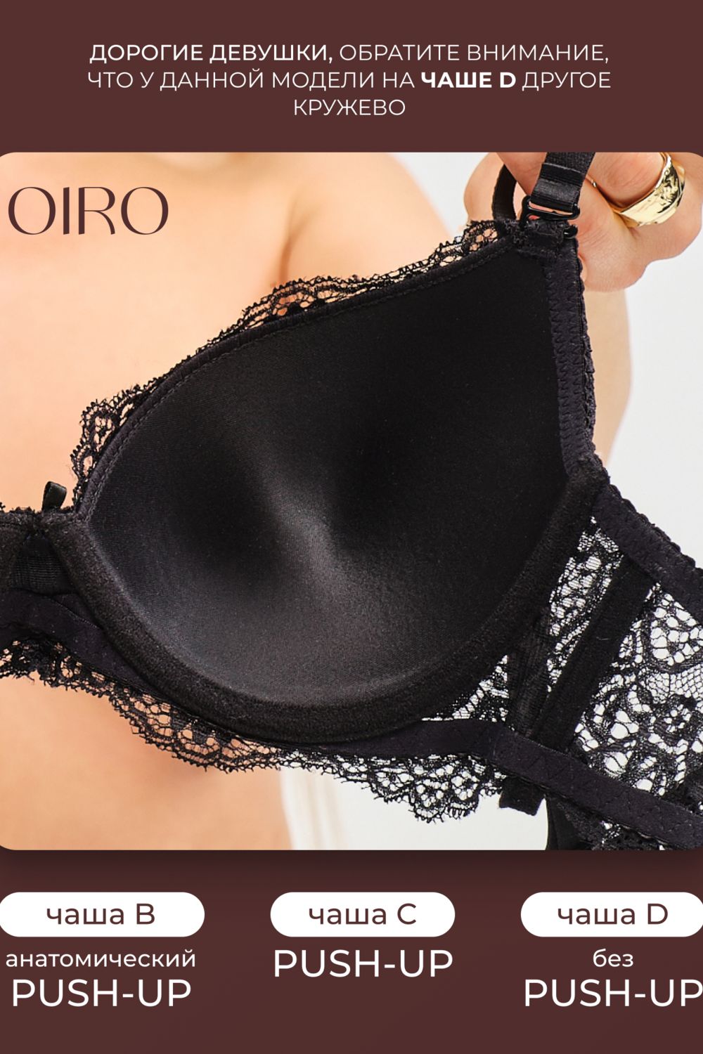Размер чаши B имеет поддерживающий (анатомический) пуш ап, чаша C с пуш ап и D без пуш ап. Узор на чаше бюстгальтера может отличаться у размера D, на модели размер С.