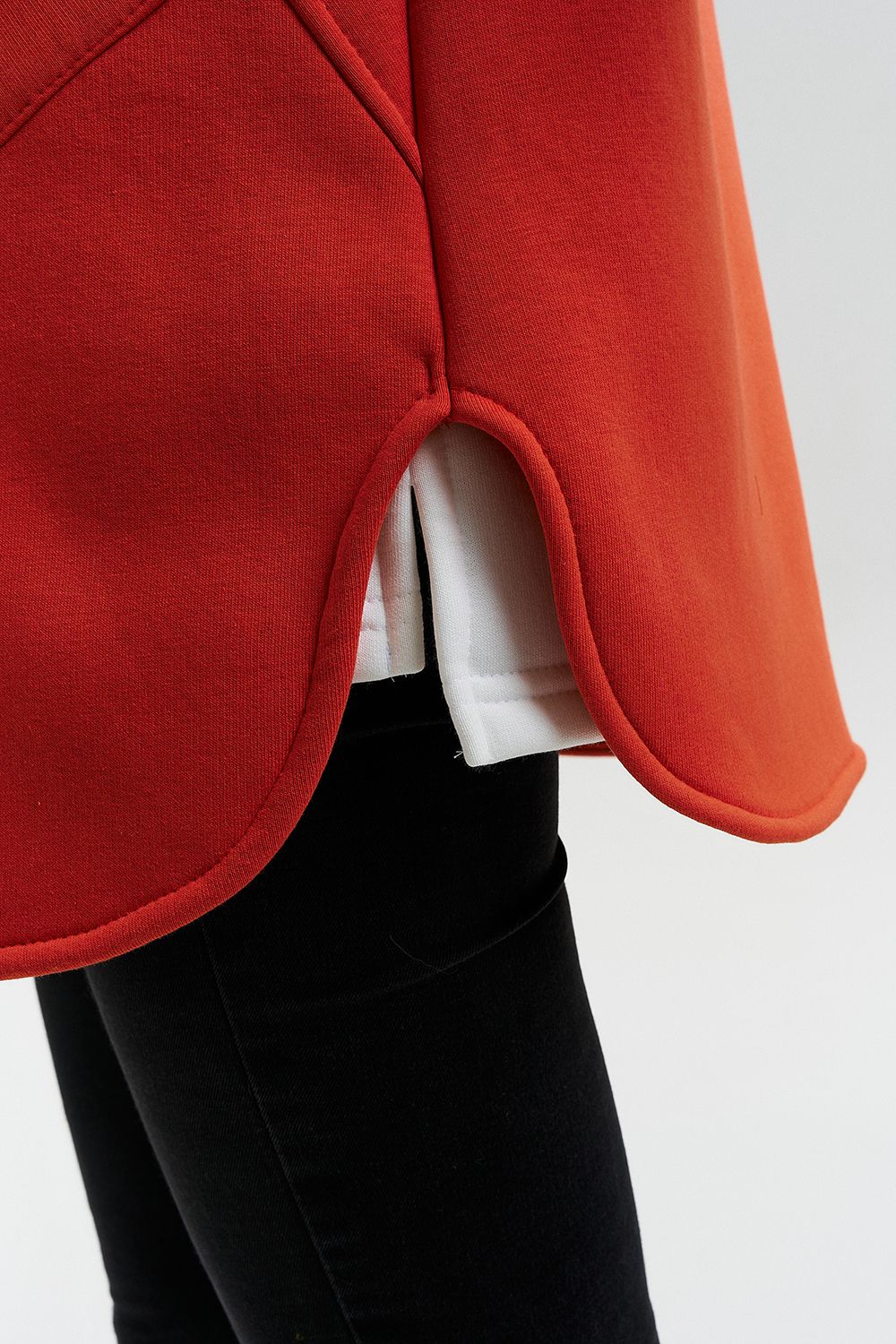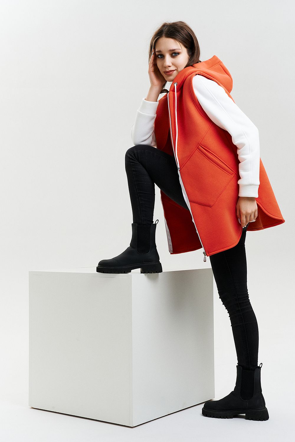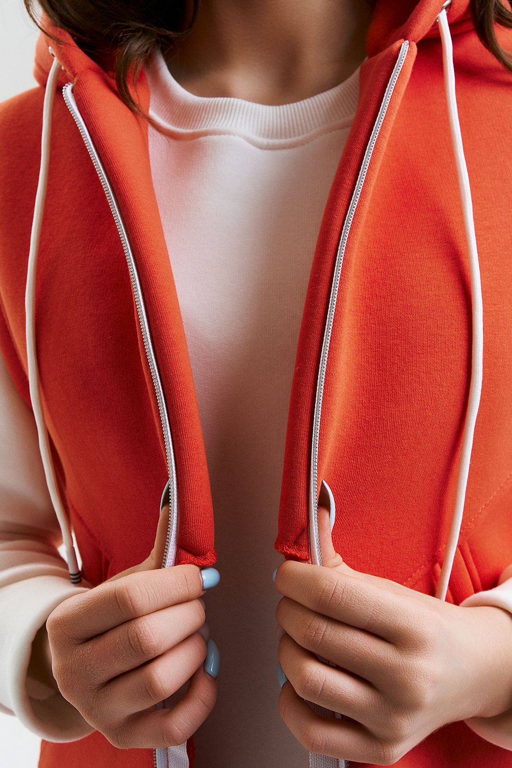 Жилет утепленный, прямой, на молнии, с капюшоном, с фигурной линией низа. Полочка с фигурными кокетками и удобными накладными карманами.