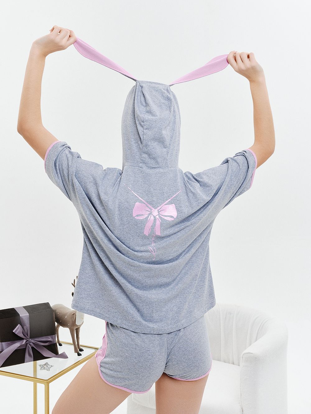 Костюм состоит из футболки и шорт. Футболка прямая, свободная, с ушками на капюшоне, с удлиненной спинкой. Рукав короткий. Шорты полуприлегающие, короткие, на поясе, с фигурным низом. Вдоль боковых швов расположены вставки из отделочного полотна. Лицевой край капюшона, низ рукавов и шорт обработаны бейкой из отделочного полотна.