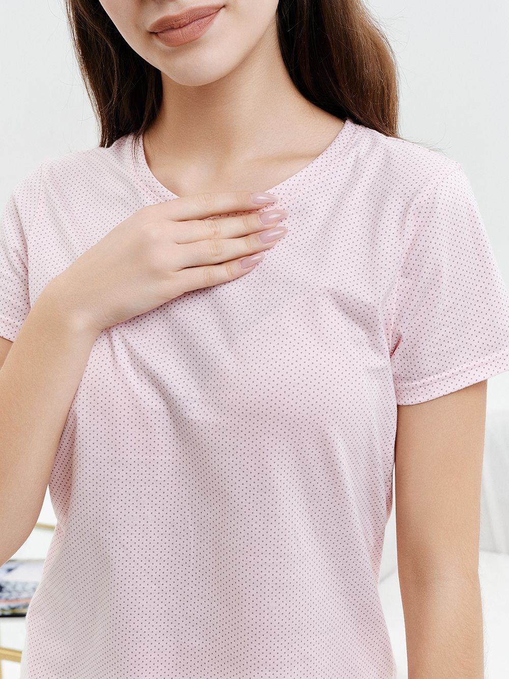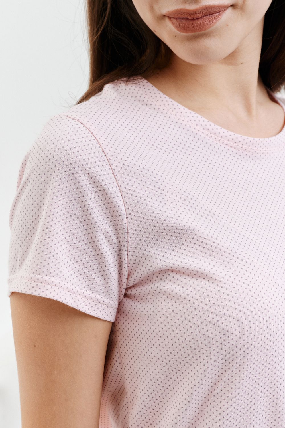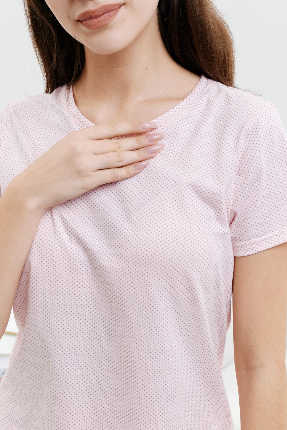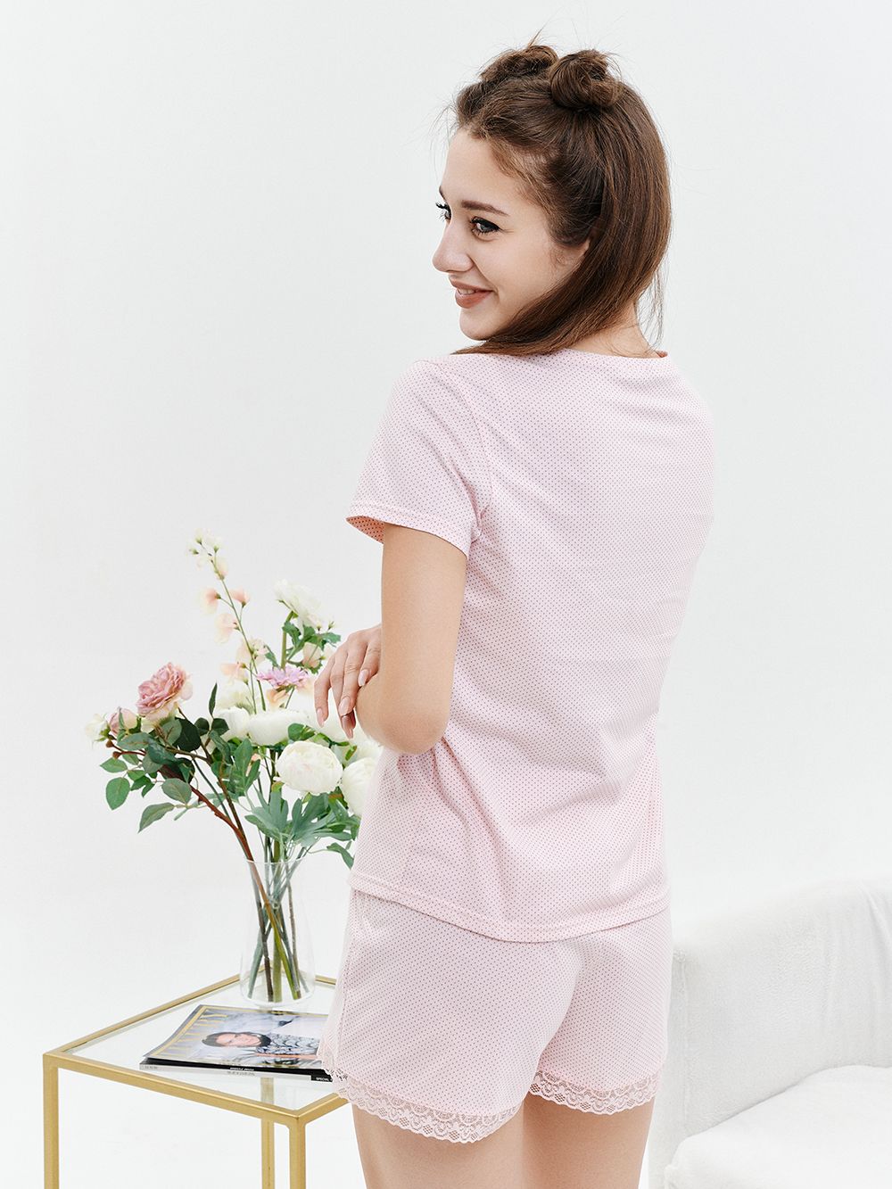 Комплект пижамы состоит из футболки и шорт. Футболка с коротким втачным рукавом. Горловина обработана планкой и имеет элегантную отстрочку. Изящные шортики украшены мягким кружевом стрейч. Стильная и удобная пижама позволит чувствовать себя привлекательной, создаст хорошее настроение и комфортную атмосферу для сна.