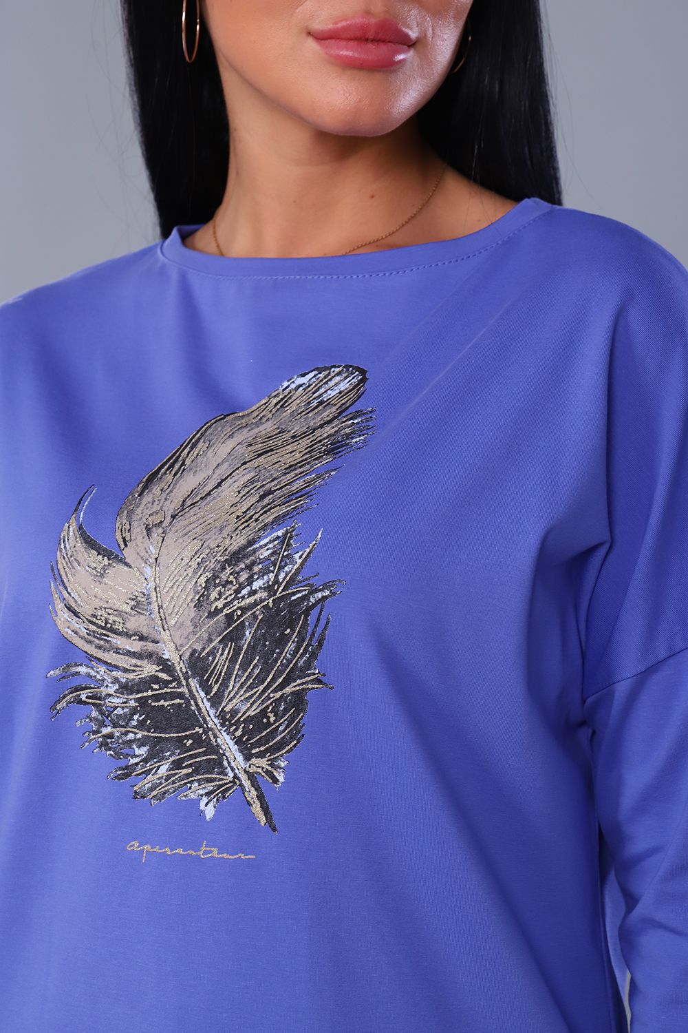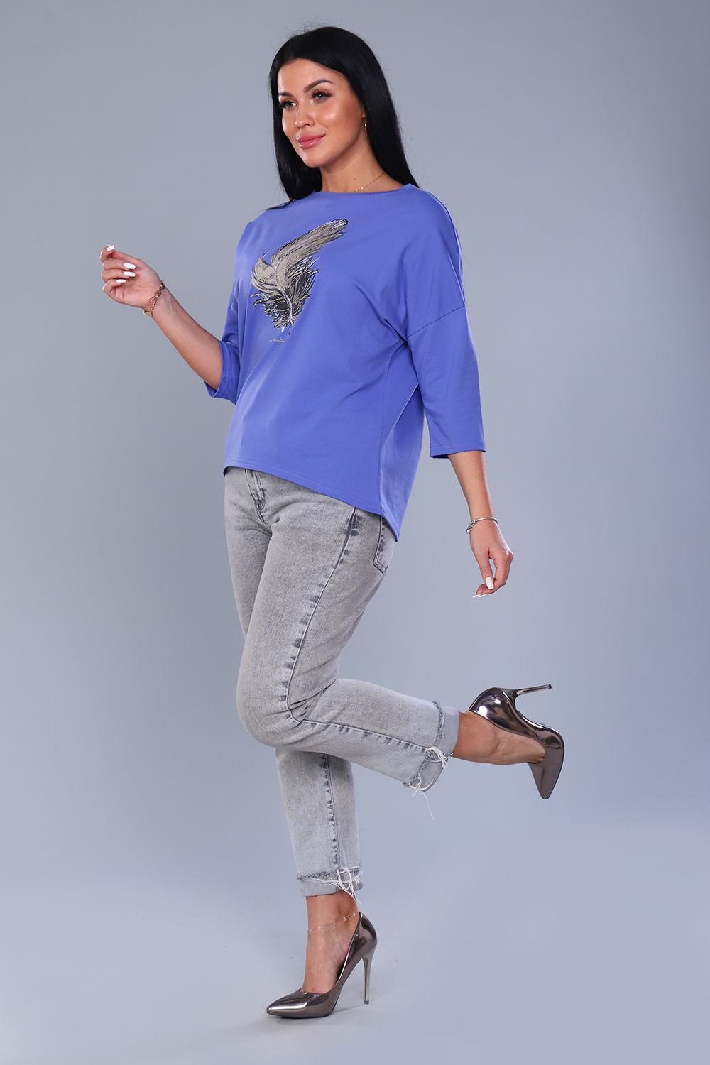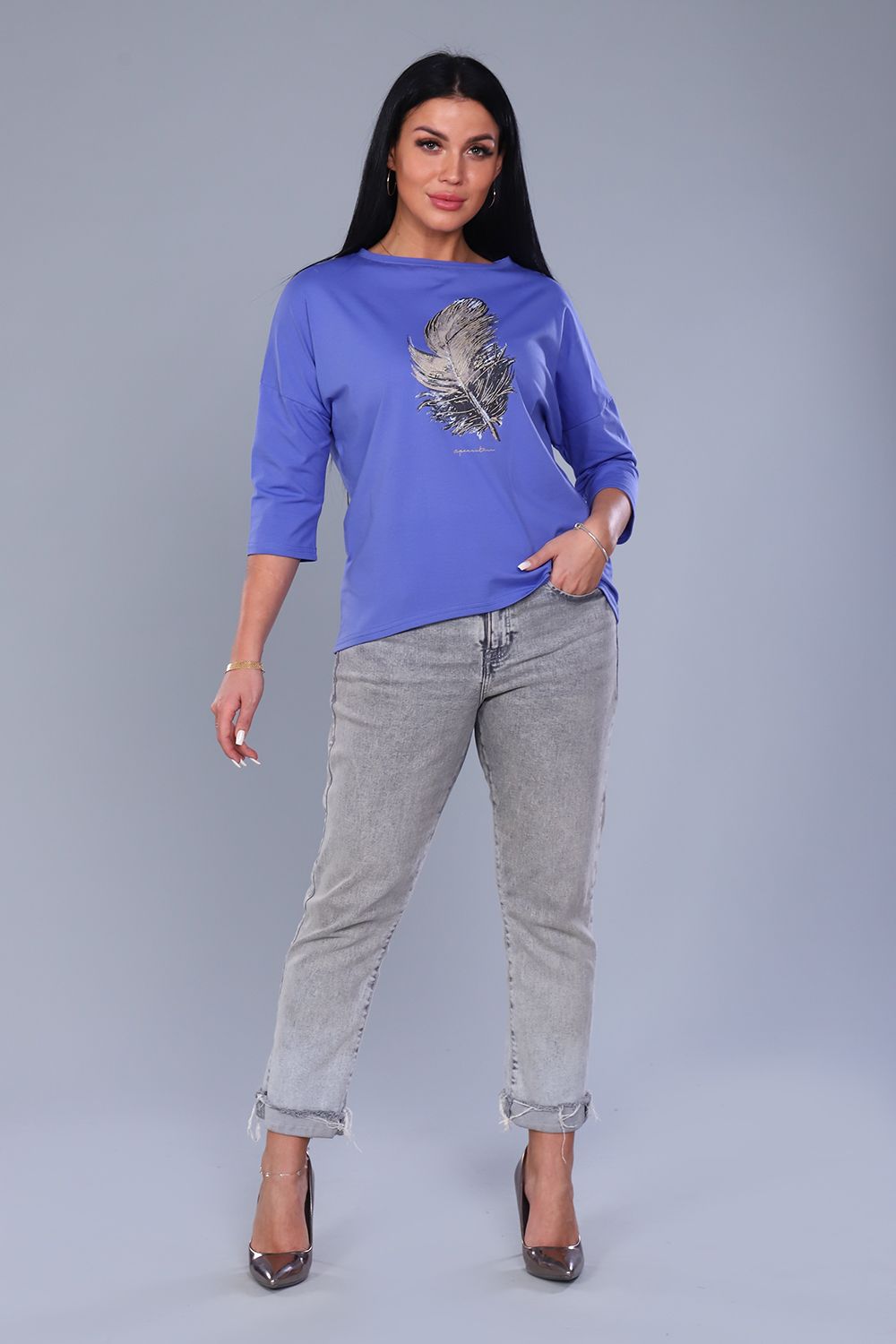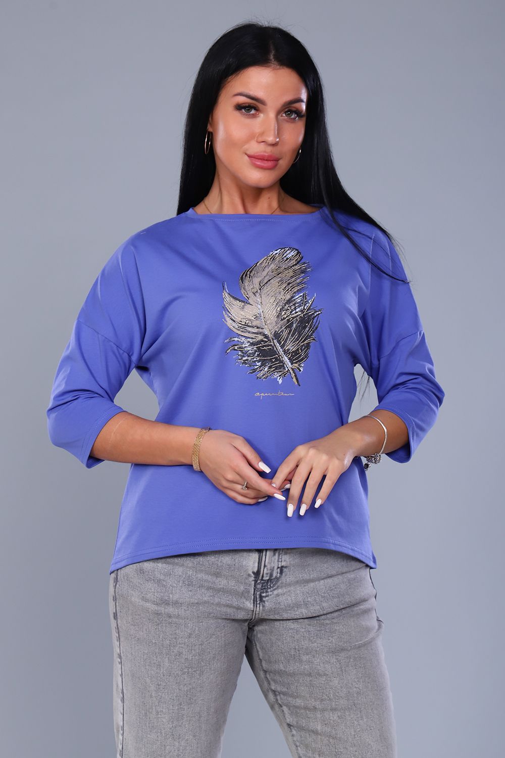 Джемпер женский с мерцающим принтом 3Д в виде пёрышка, из плотной кулирки с лайкрой качества пенье. Модель слегка приталенного силуэта, горловина круглая обработана обтачкой, спущенное плечо, рукав 3/4, спинка слегка удлинена и закруглена. Джемпер стильный, лёгкий, приятный к телу, отличный офисный вариант. Модель дополнит любой образ и создаст настроение от элегантного до вечернего.