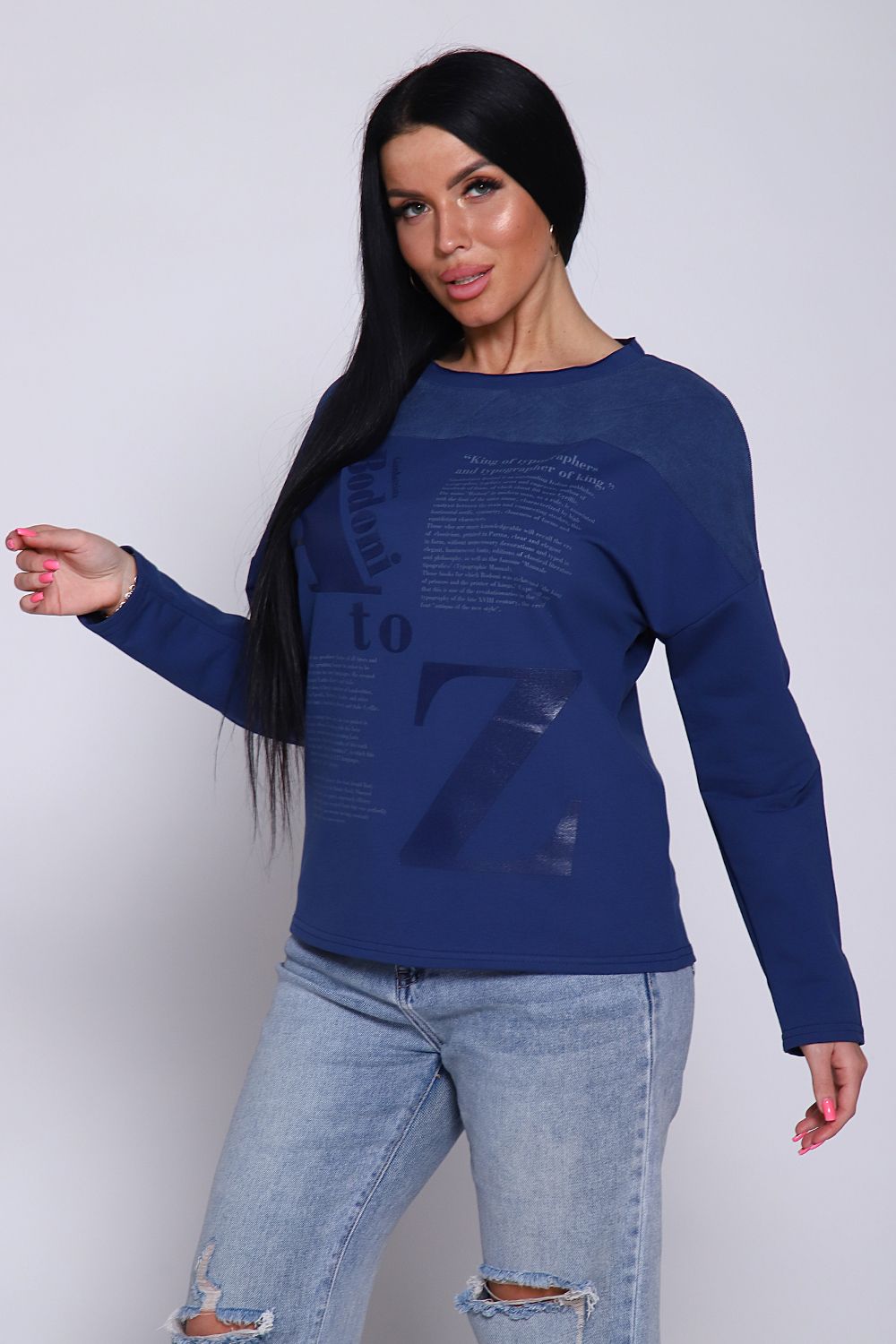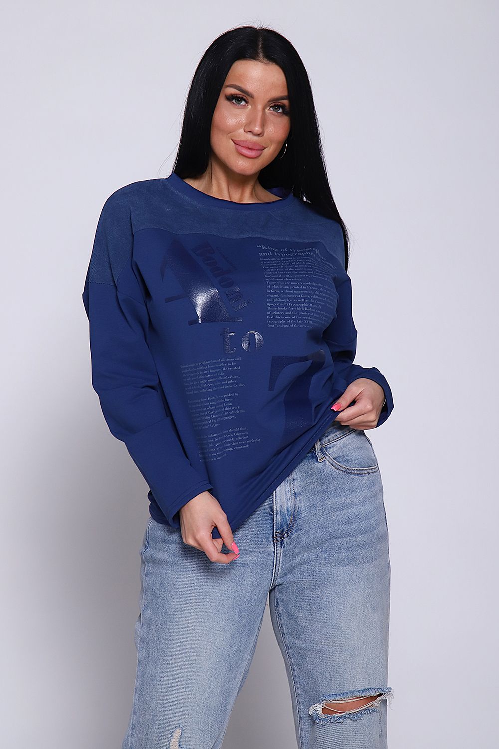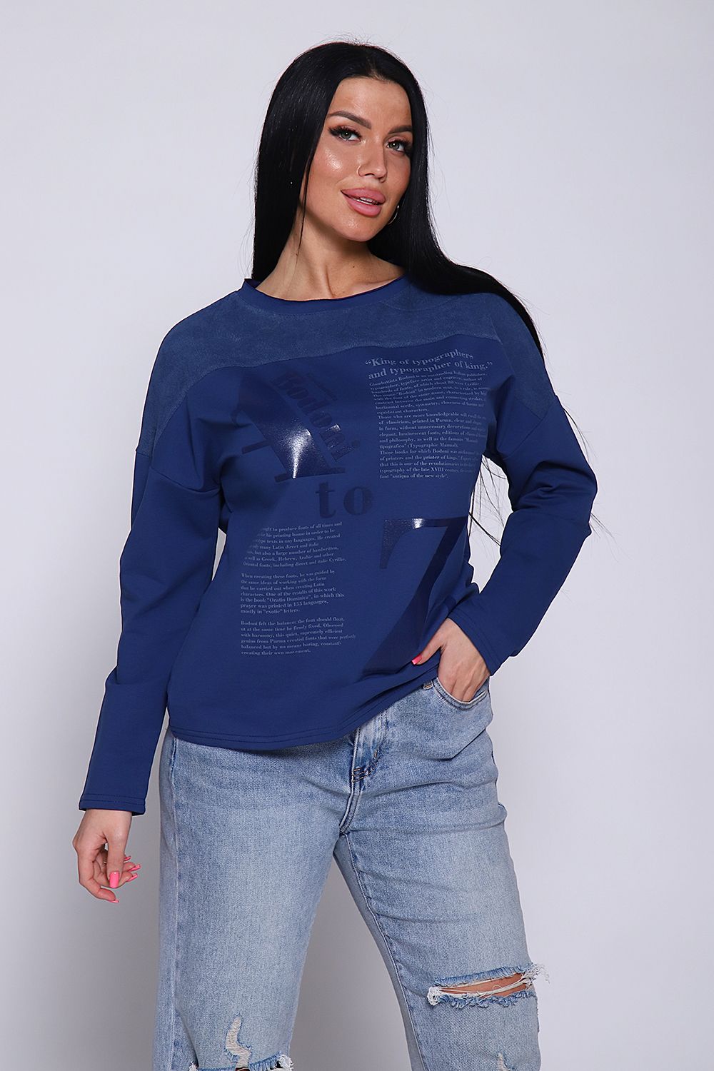 Джемпер женский из комбинированной ткани футера 2-х нитка с лайкрой качества кардэ и микровельвета. Свитшот с принтом свободного оверсайз кроя с круглой горловиной, обработанной обтачкой с открытым краем, спущенная пройма, длинный рукав. На груди кокетка из микровельвета, гармонично сочетается с принтом в виде газеты. Стильный, комфортный джемпер- отличная вещь для офисного гардероба деловых женщин любой фигуры и возраста. Широкий размерный ряд и красивые оттенки данной модели позволят вам выглядеть элегантно и привлекательно.