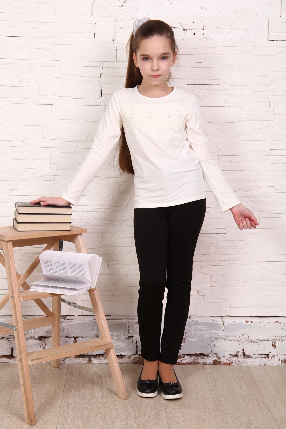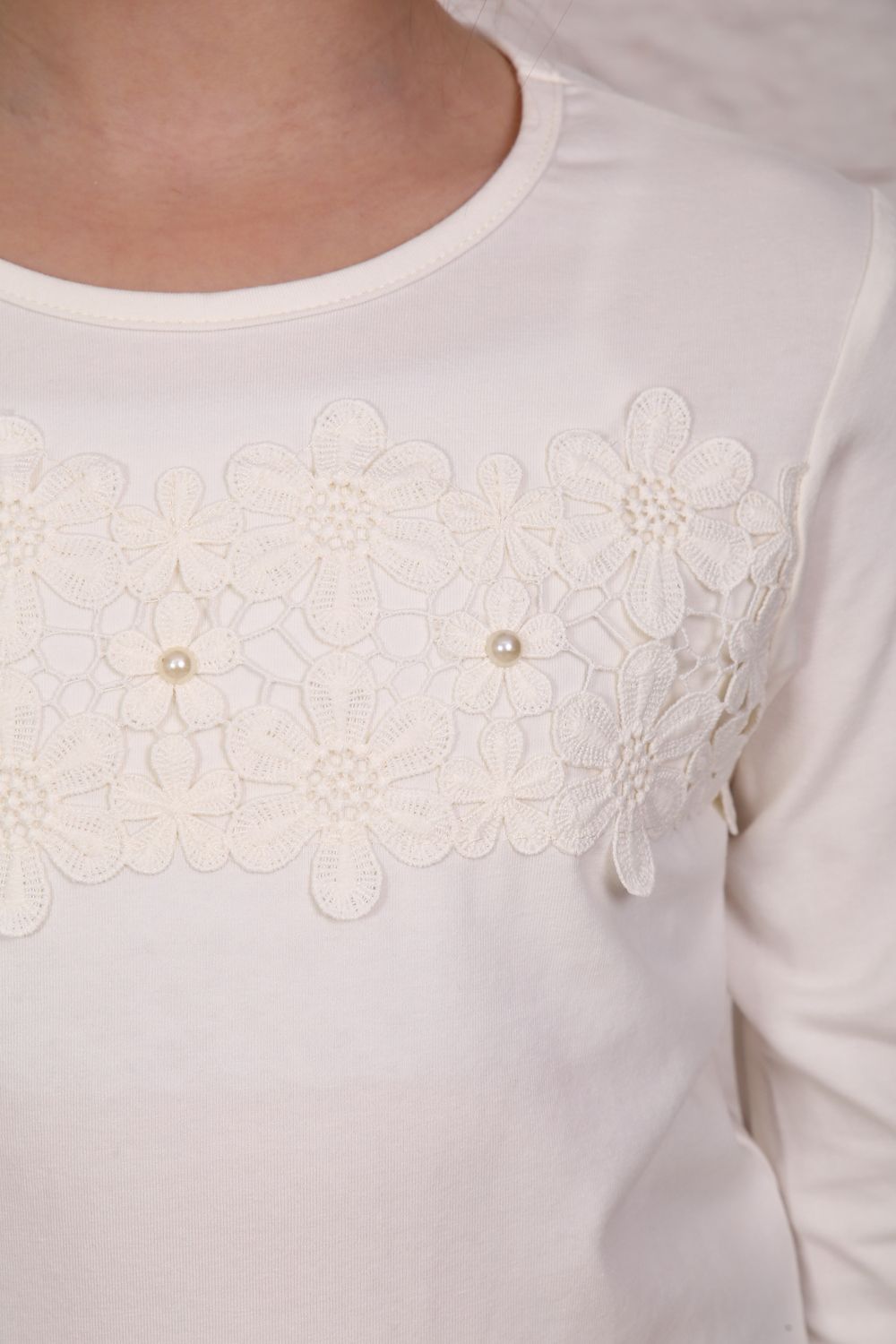 Блузка для девочек дошкольного, младшего и старшего школьного возраста, из однотонного трикотажного полотна кулирка с лайкрой. Блузка прямого силуэта, с втачным рукавом, без застежки. Спереди и на спинке отсутствуют линии членения. На передней части джемпера настрочено кружево по линии груди. Срез горловины обработан узкой окантовочной лентой из того же полотна в 4 сложения. Рукав одношовный, длинный. Низ рукава без манжеты, подогнут. На кружево приклеены 3 полубусины.