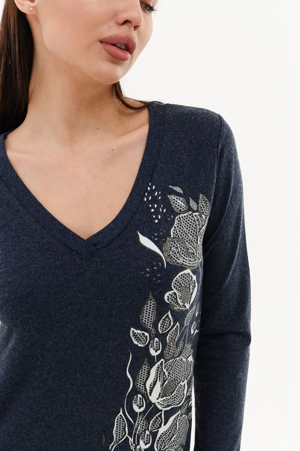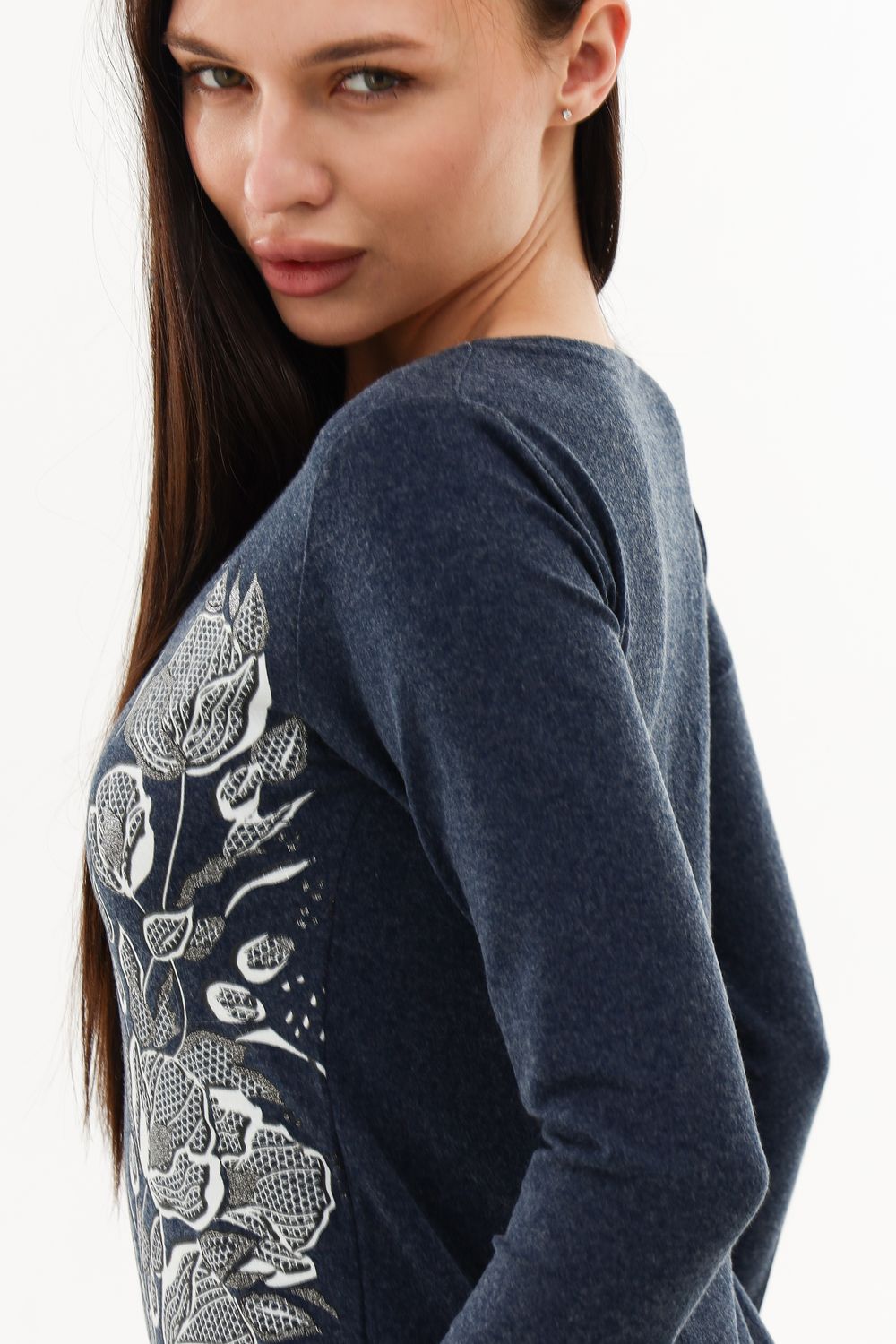 Элегантный джемпер чуть ниже бёдер полуприлегающего силуэта из очень мягкой, комфортной к телу ткани. Рукав длинный. Печать-имитация вышивки с глиттером. Модель прекрасно впишется в демисезонный гардероб. Ткань хорошо растягивается благодаря наличию в составе 5% лайкры.