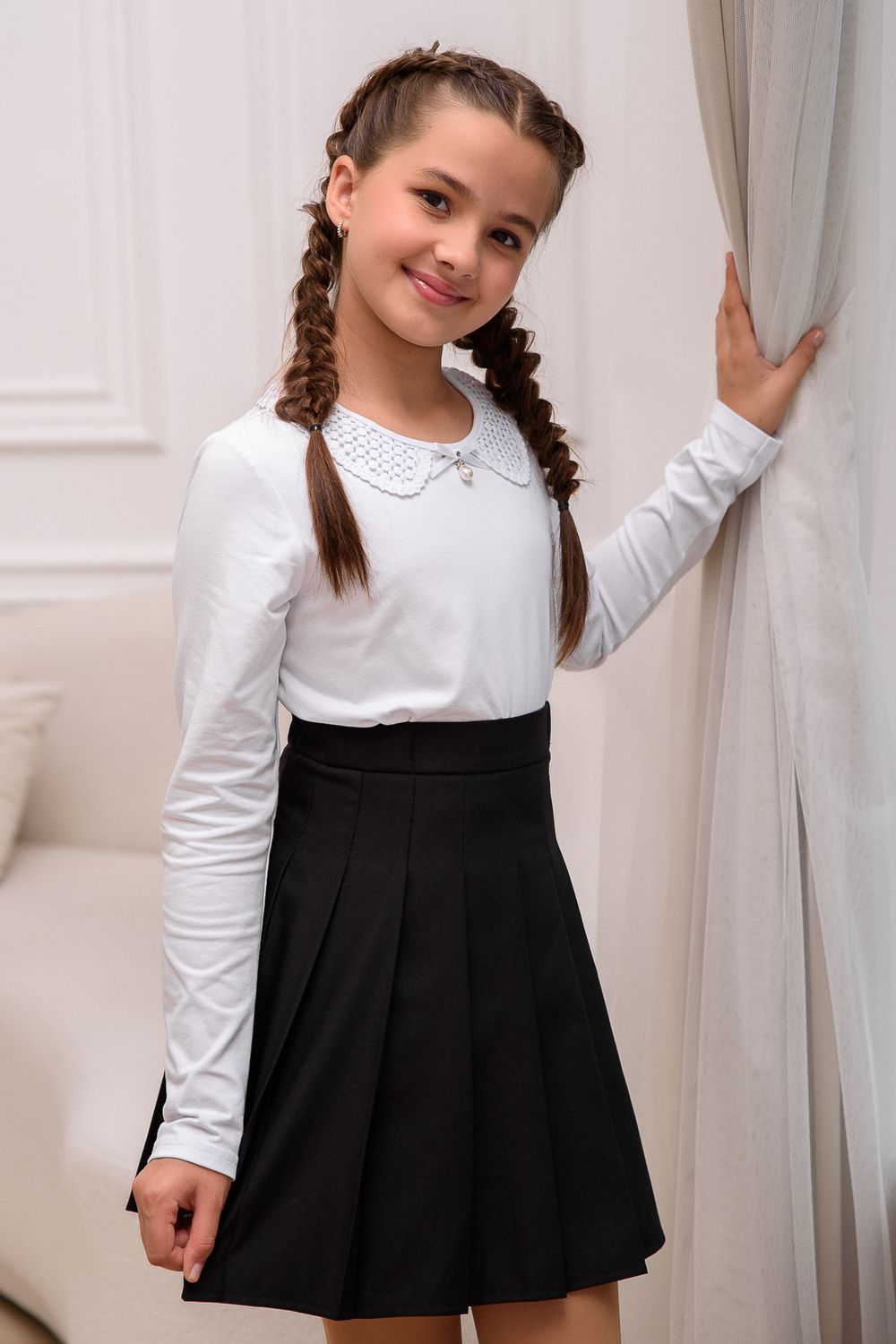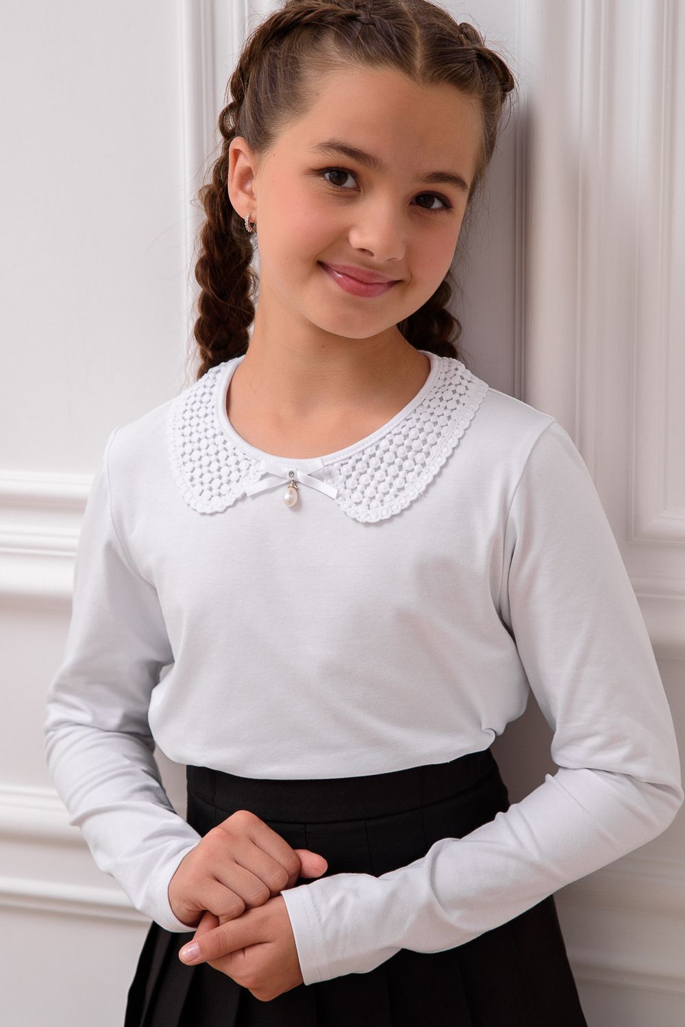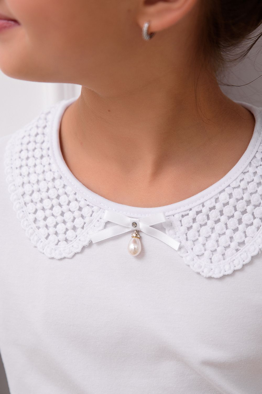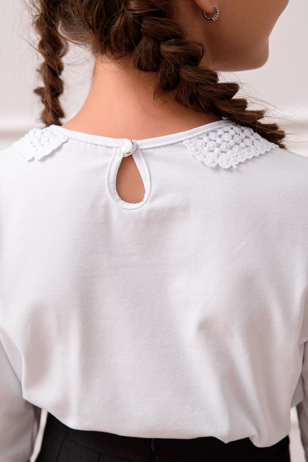 Блузка для девочек младшего и старшего школьного возраста, из трикотажного однотонного полотна – кулирка с лайкрой. Блузка полуприлегающего силуэта, с втачным длинным рукавом, с кружевным воротником, с центральной застежкой на петлю и пуговицу на спинке. Спереди отсутствуют линии членения. На спинке вырез в виде «капельки». Срез горловины и капля окантованы. Рукав одношовный. Низа рукава и изделия подогнуты. Спереди по центру горловины прикреплен декоративный элемент.