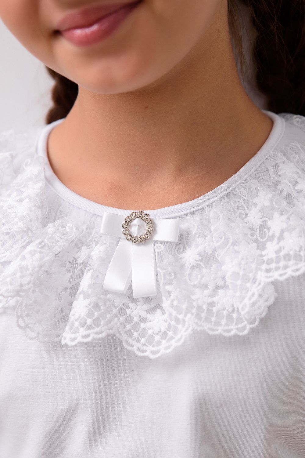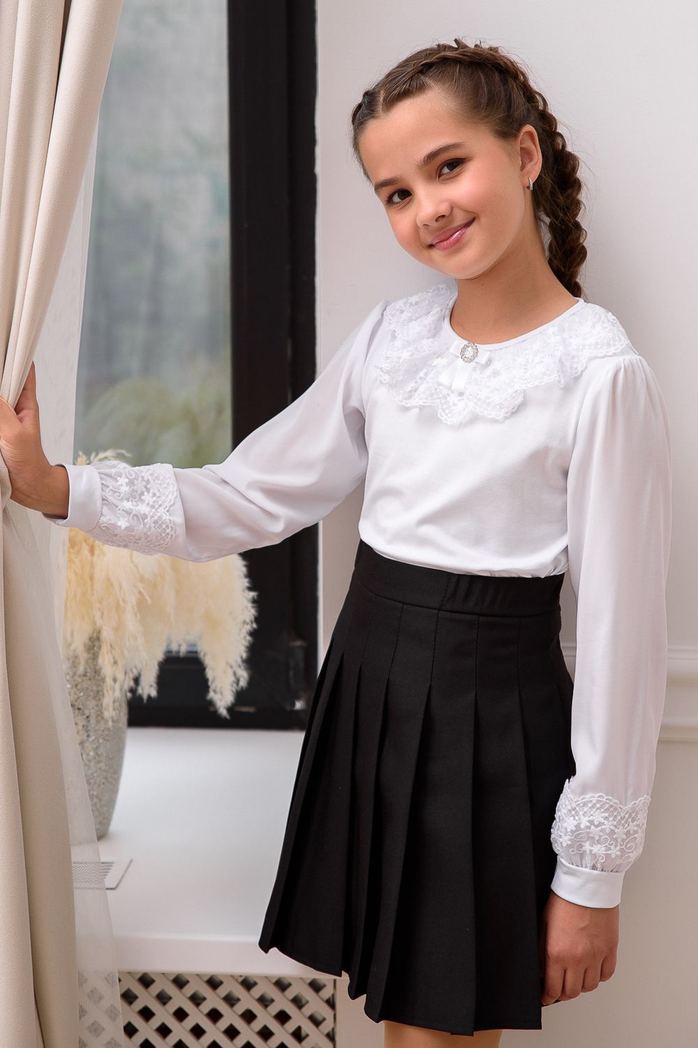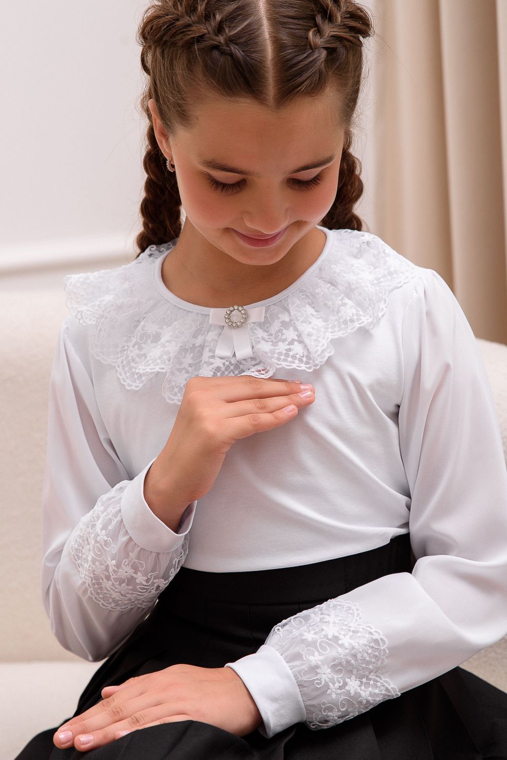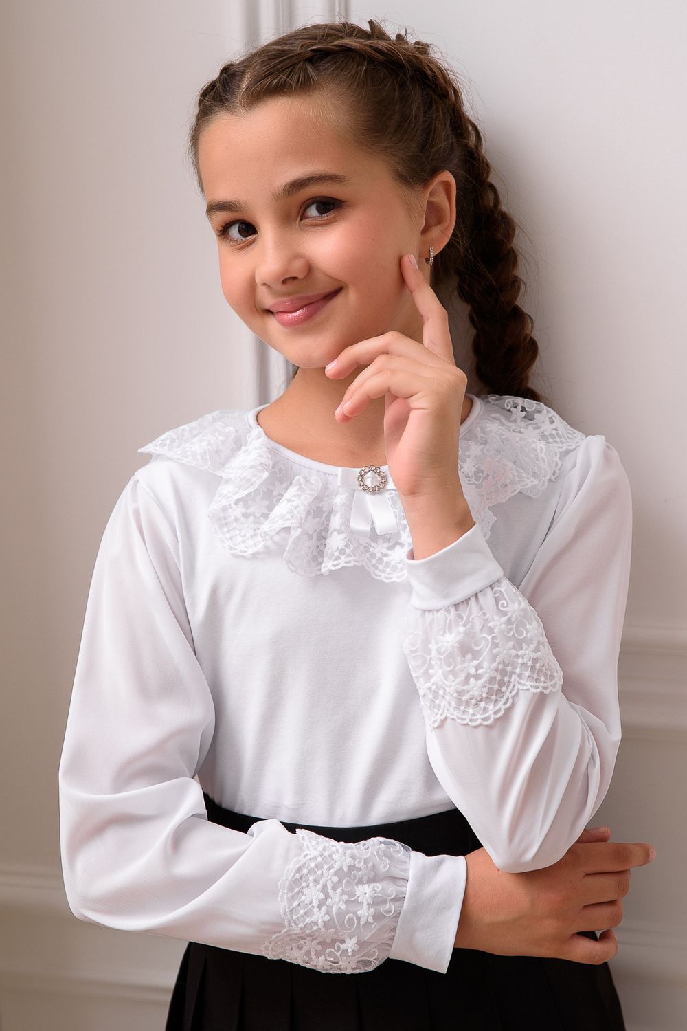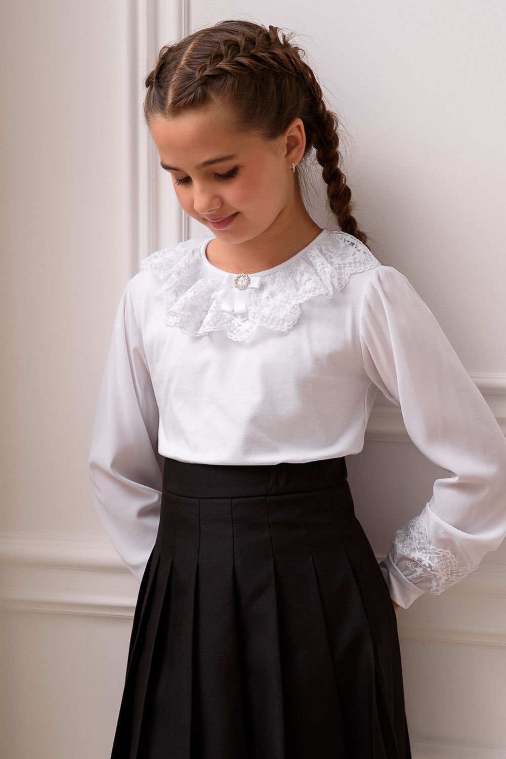 Блузка для девочек с длинным рукавом. Данная модель станет основой школьного или праздничного образа. Элегантное мягкое кружево на горловине можно красиво разложить на сарафан или пиджак, что создаст нарядный look. Оригинальная модель добавит романтизма в образ и подчеркнет индивидуальность, можно сочетать с юбкой, сарафаном и брюками. Шифоновые рукава на манжете, по низу настрочено кружево. На спинке вырез в виде капли с застежкой на петлю и пуговицу. Блузка сшита из качественного трикотажа - кулирка с лайкрой, используемый материал не теряет форму после многократных стирок, мягкий и приятный к телу, устойчив к износу. Для сохранения первоначальных свойств изделия, важно соблюдать рекомендации по уходу.