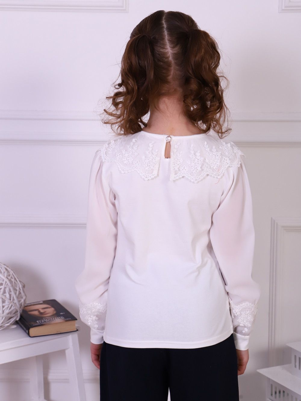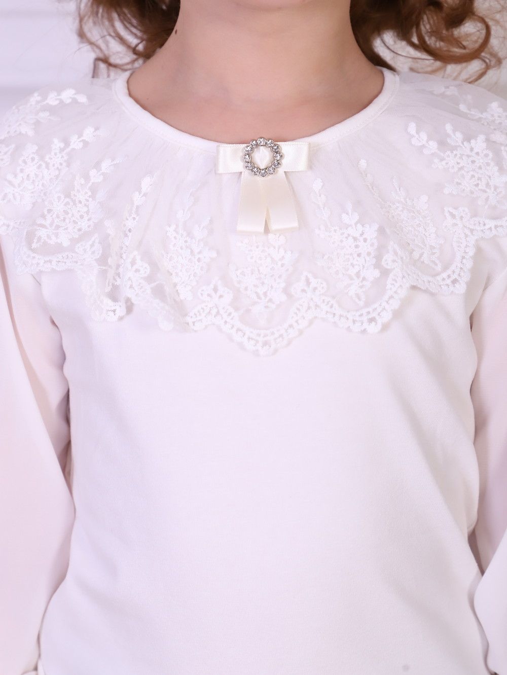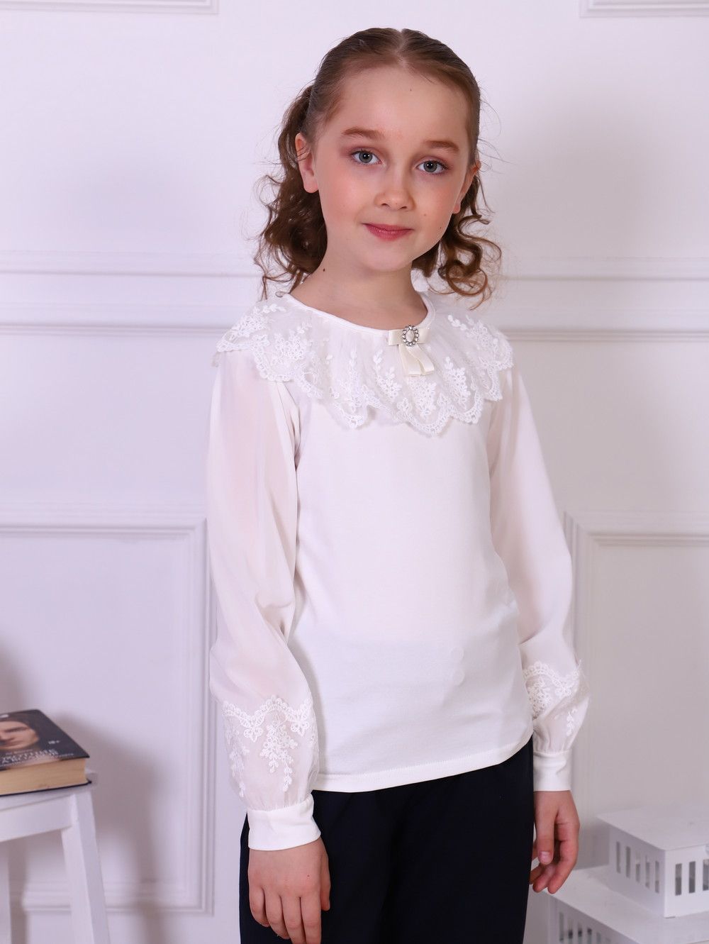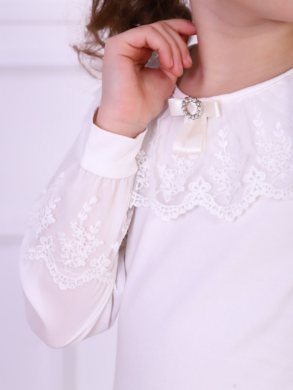 Блузка для девочек с длинным рукавом. Данная модель станет основой школьного или праздничного образа. Элегантное мягкое кружево на горловине можно красиво разложить на сарафан или пиджак, что создаст нарядный look. Оригинальная модель добавит романтизма в образ и подчеркнет индивидуальность, можно сочетать с юбкой, сарафаном и брюками. Шифоновые рукава на манжете, по низу настрочено кружево. На спинке вырез в виде капли с застежкой на петлю и пуговицу. Блузка сшита из качественного трикотажа - кулирка с лайкрой, используемый материал не теряет форму после многократных стирок, мягкий и приятный к телу, устойчив к износу. Для сохранения первоначальных свойств изделия, важно соблюдать рекомендации по уходу.
